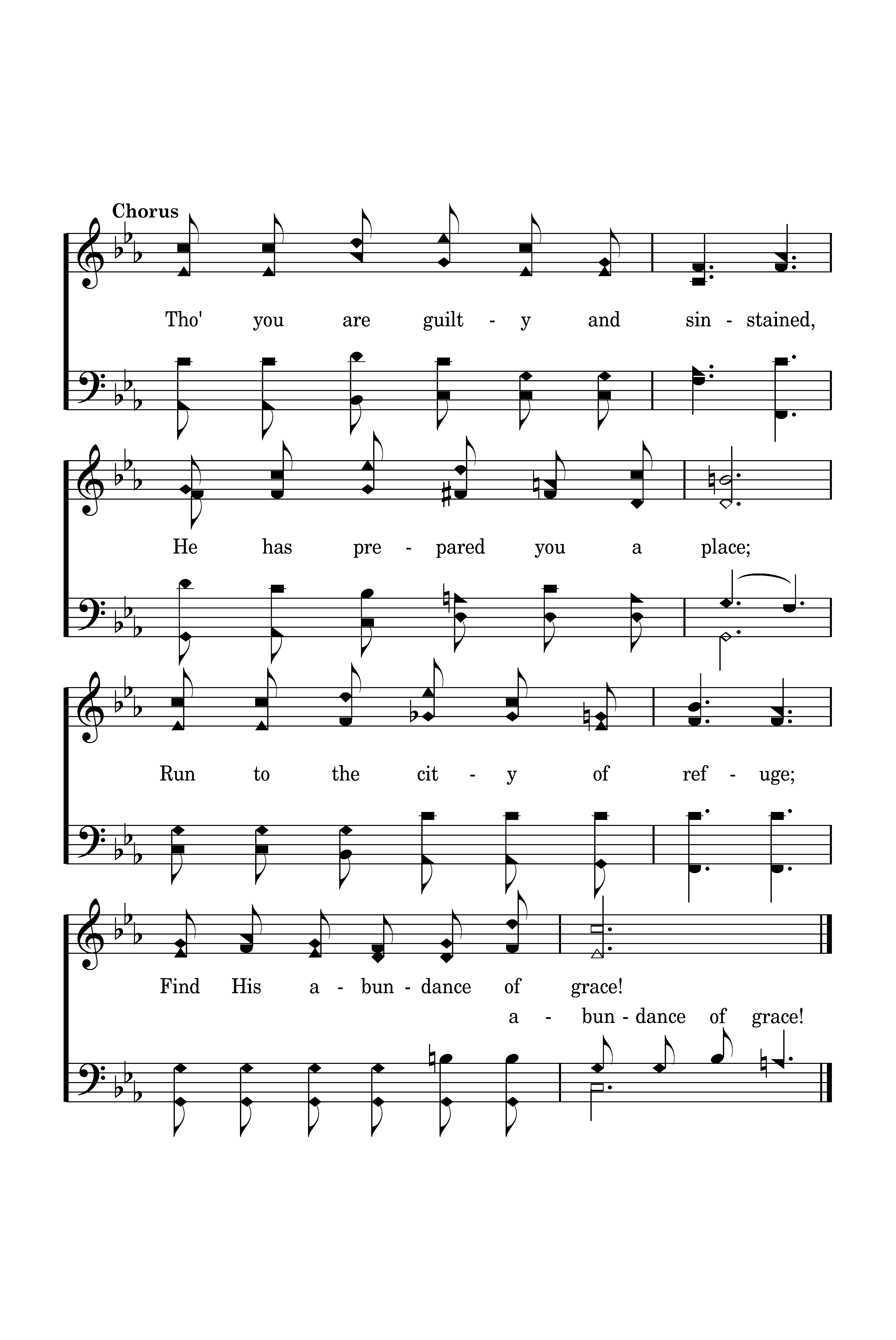 Tho' you are guilty and sinstained, He has prepared you a place; Run to the city of refuge; Find His abundance of grace!