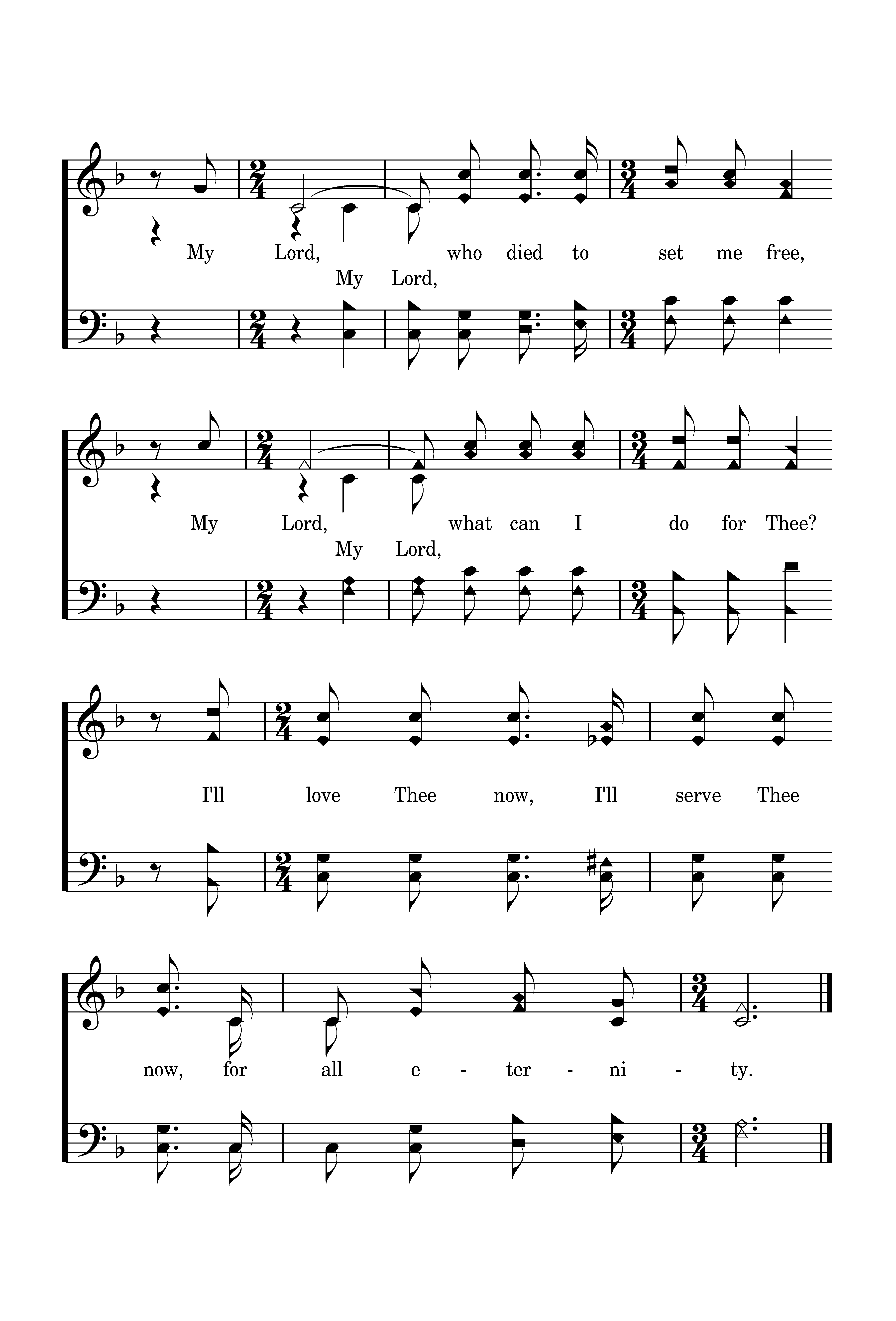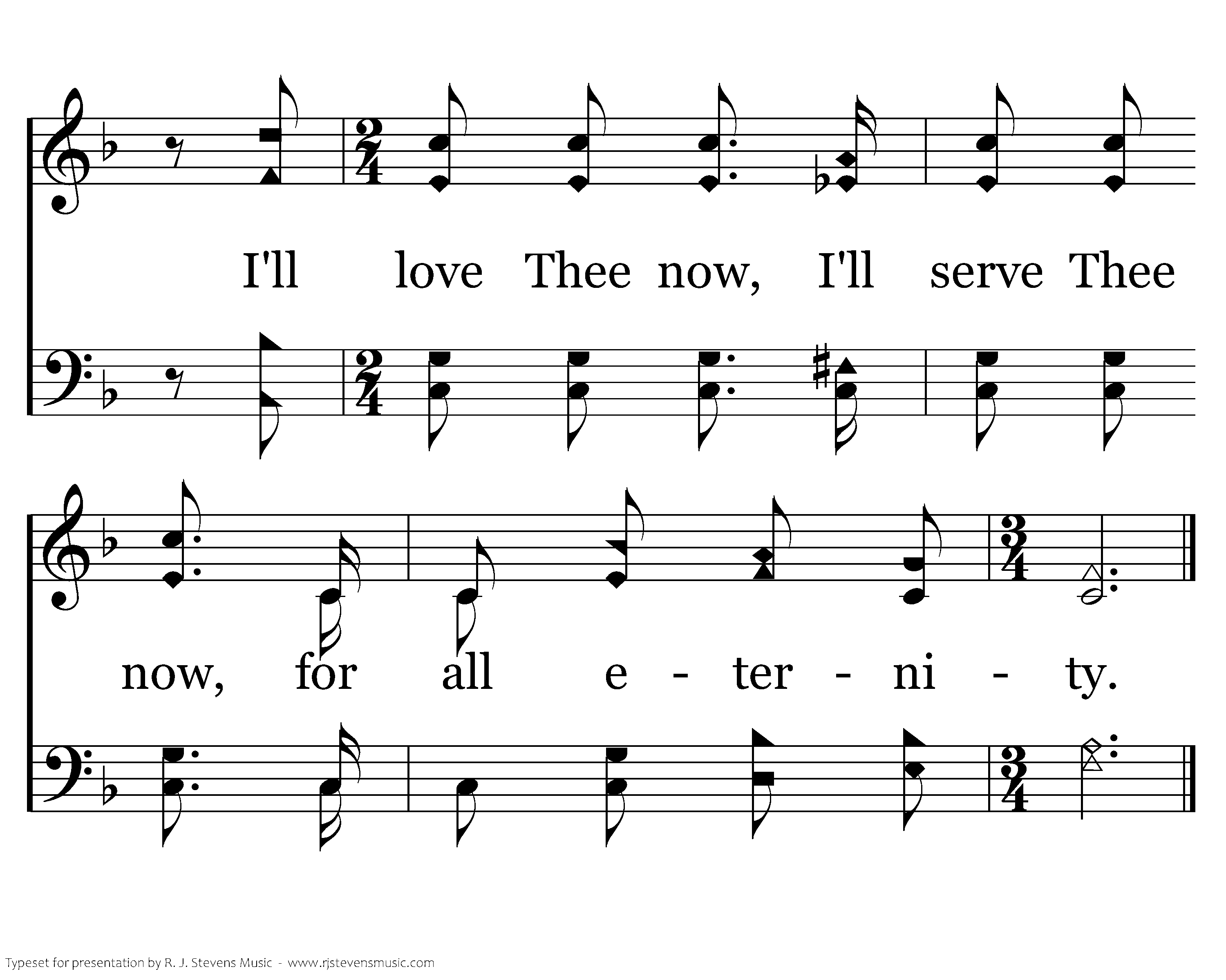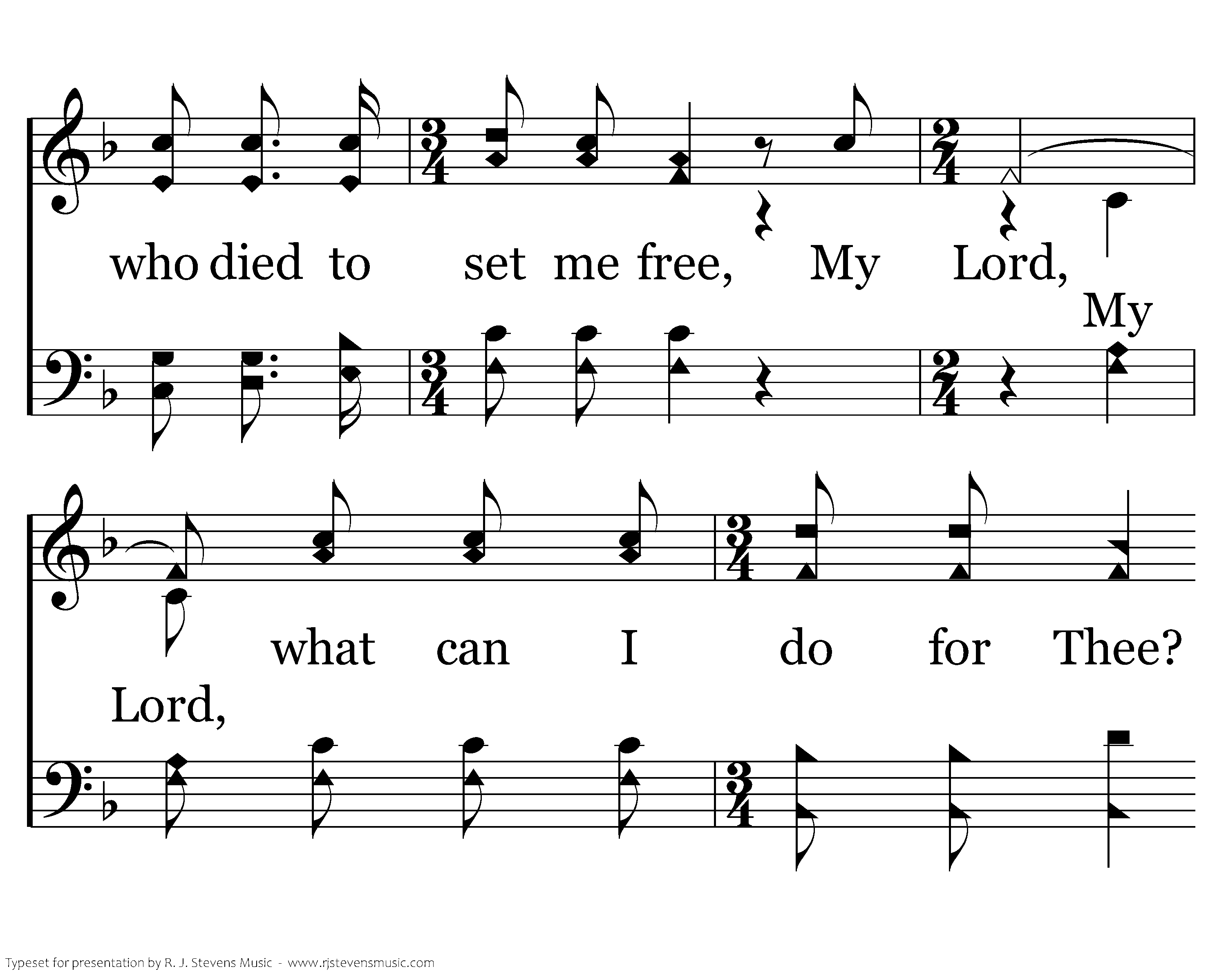 My Lord, who died on Calvary; My Lord, who died to set me free, My Lord, what can I do for Thee? I'll love Thee now, I'll serve Thee now, for all eternity.