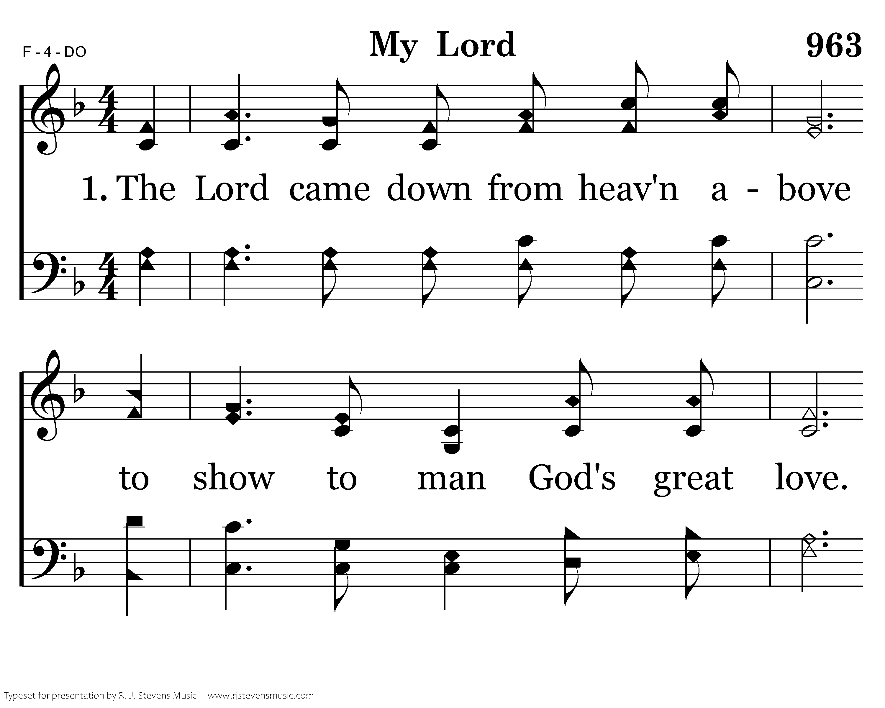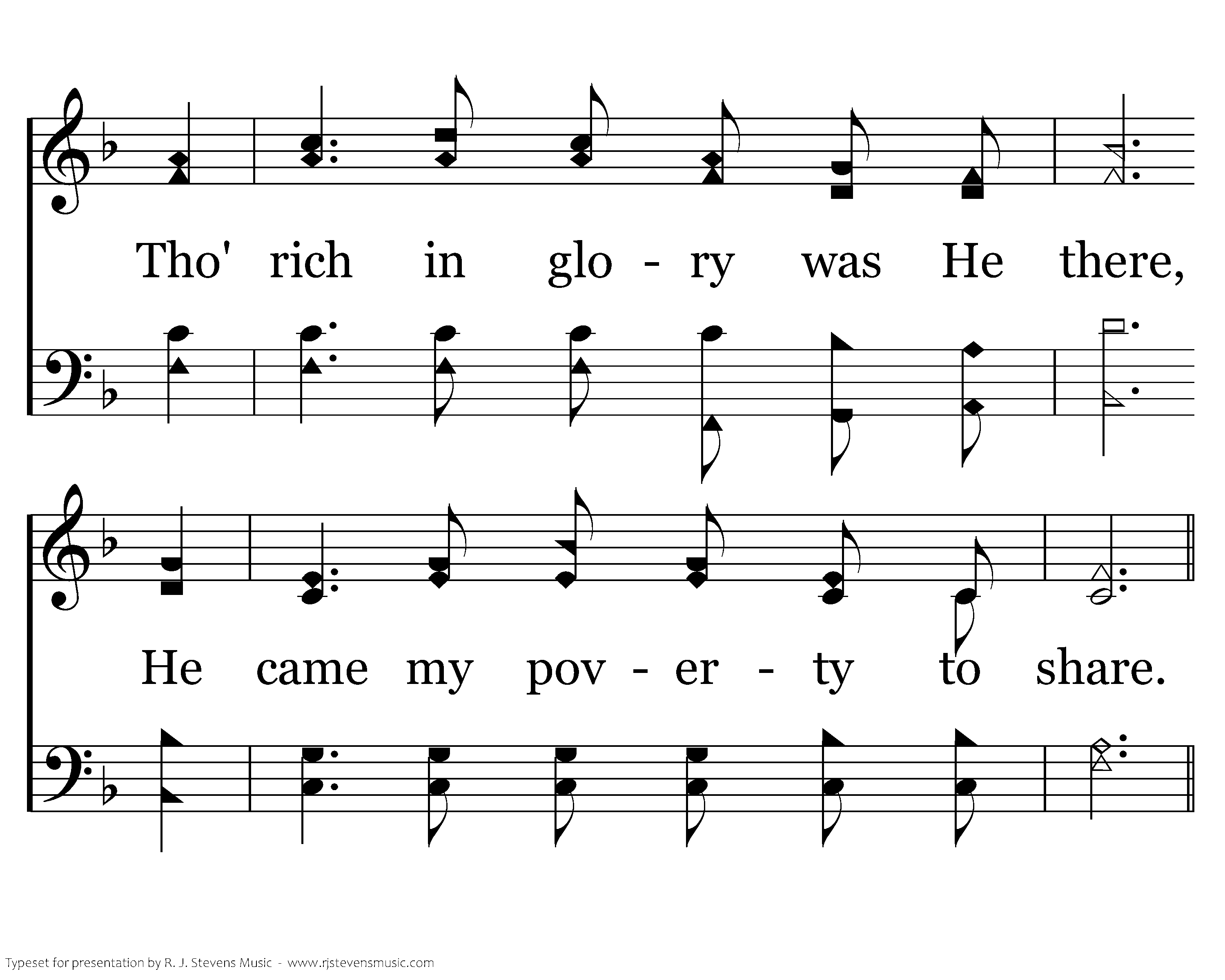 The Lord came down from heav'n above to show to man God's great love. Tho' rich in glory was He there, He came my poverty to share.