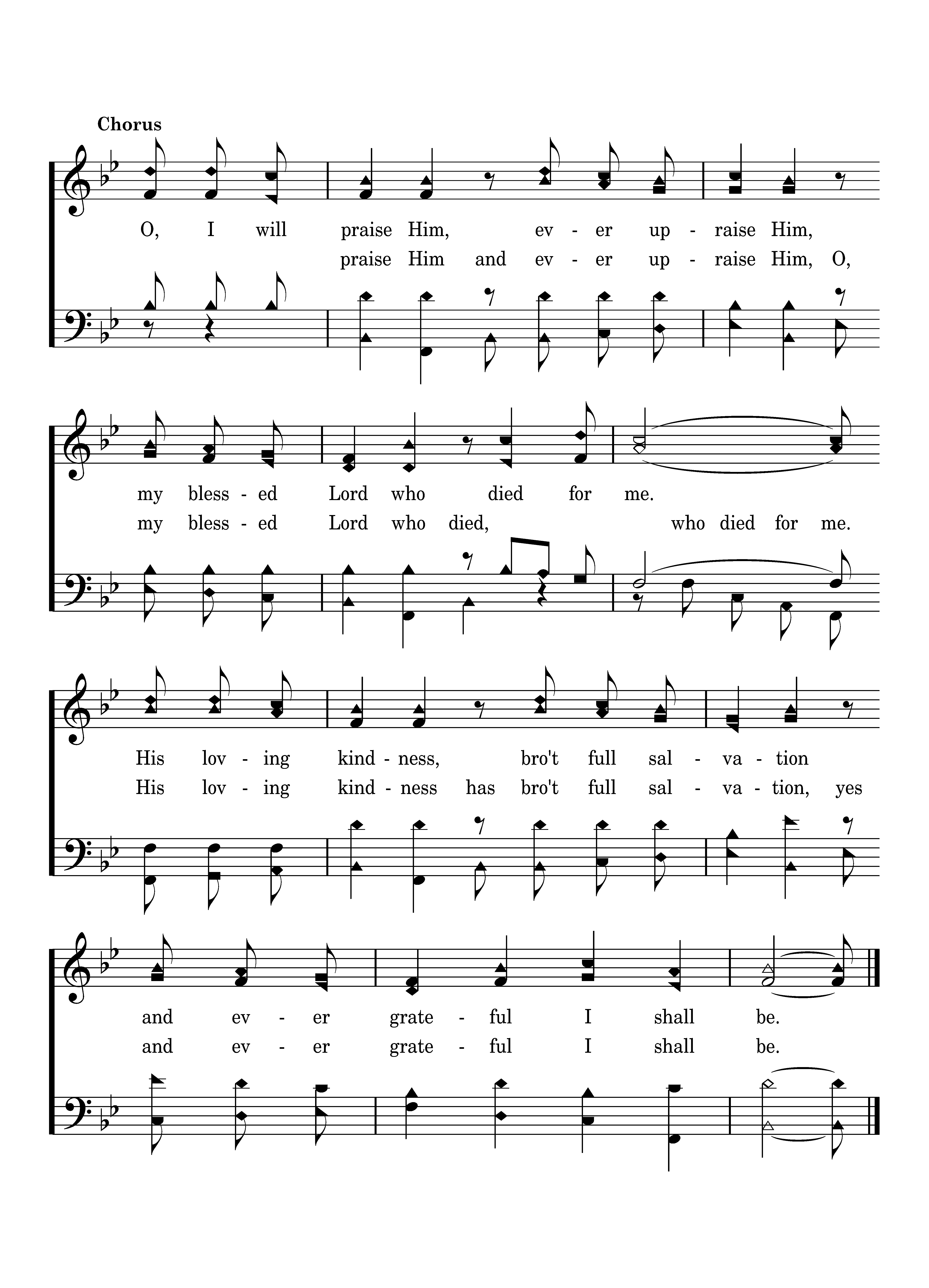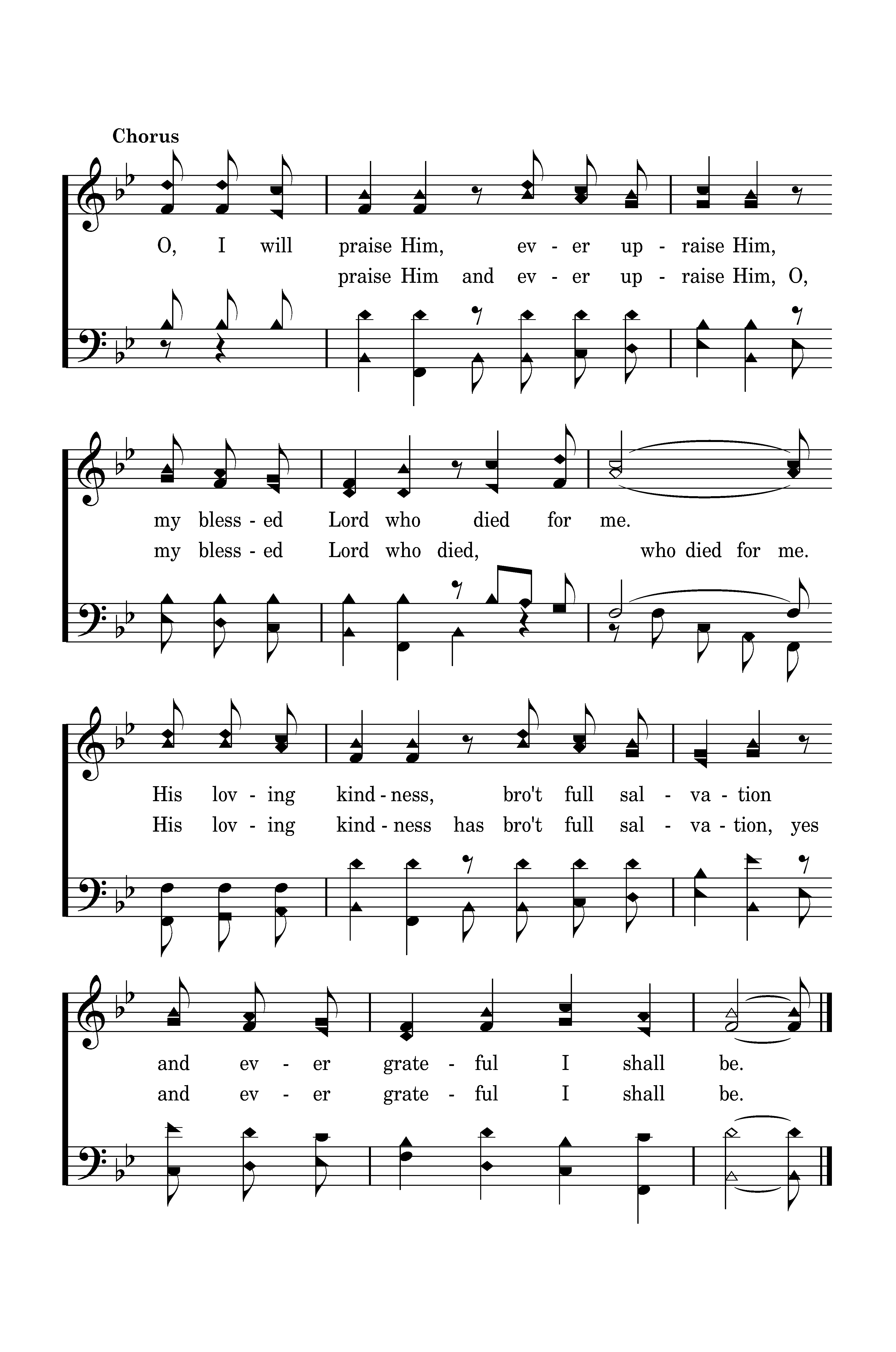 O, I will praise Him, ever upraise Him, my blessed Lord who died for me. His loving kindness, bro't full salvation and ever grateful I shall be.