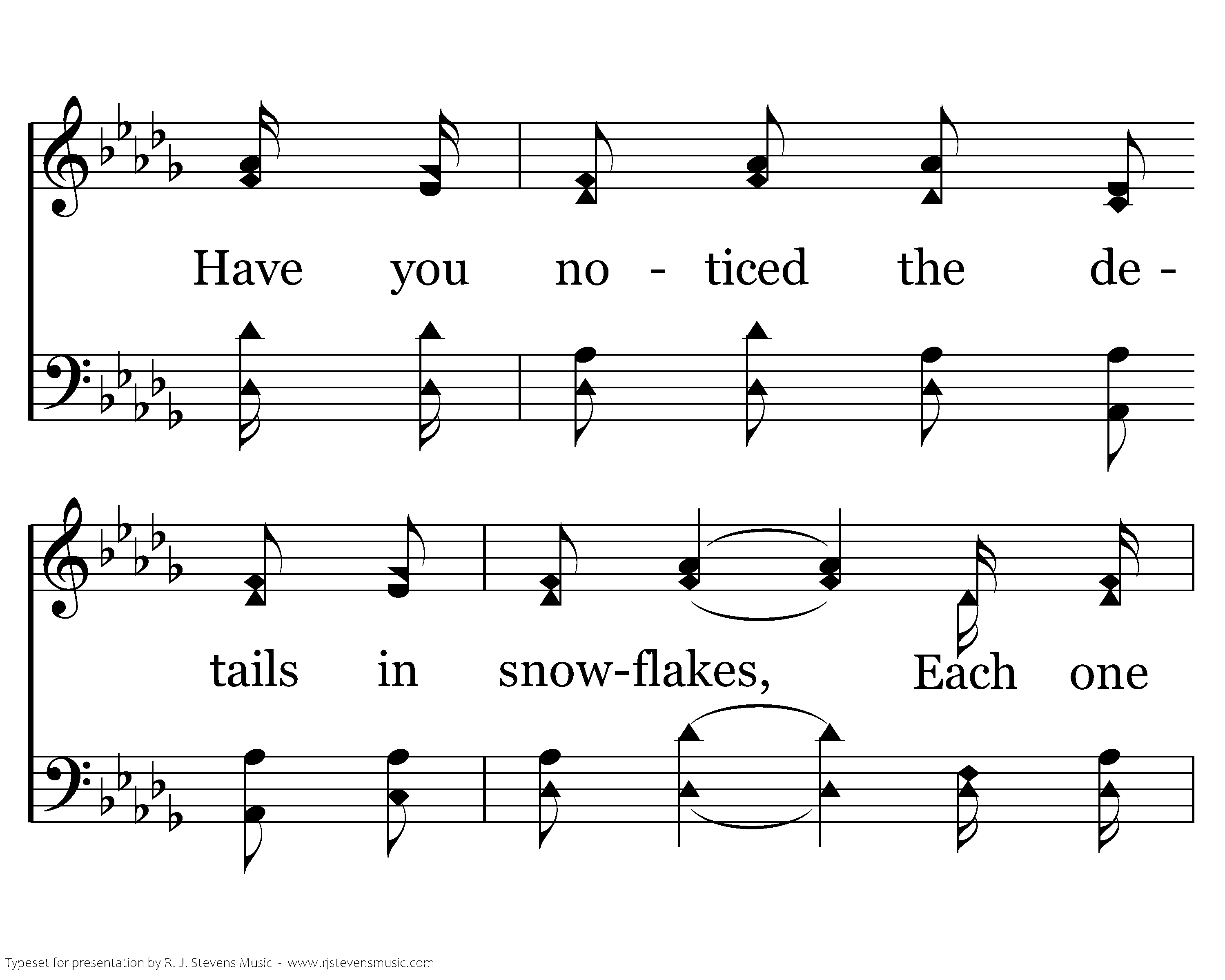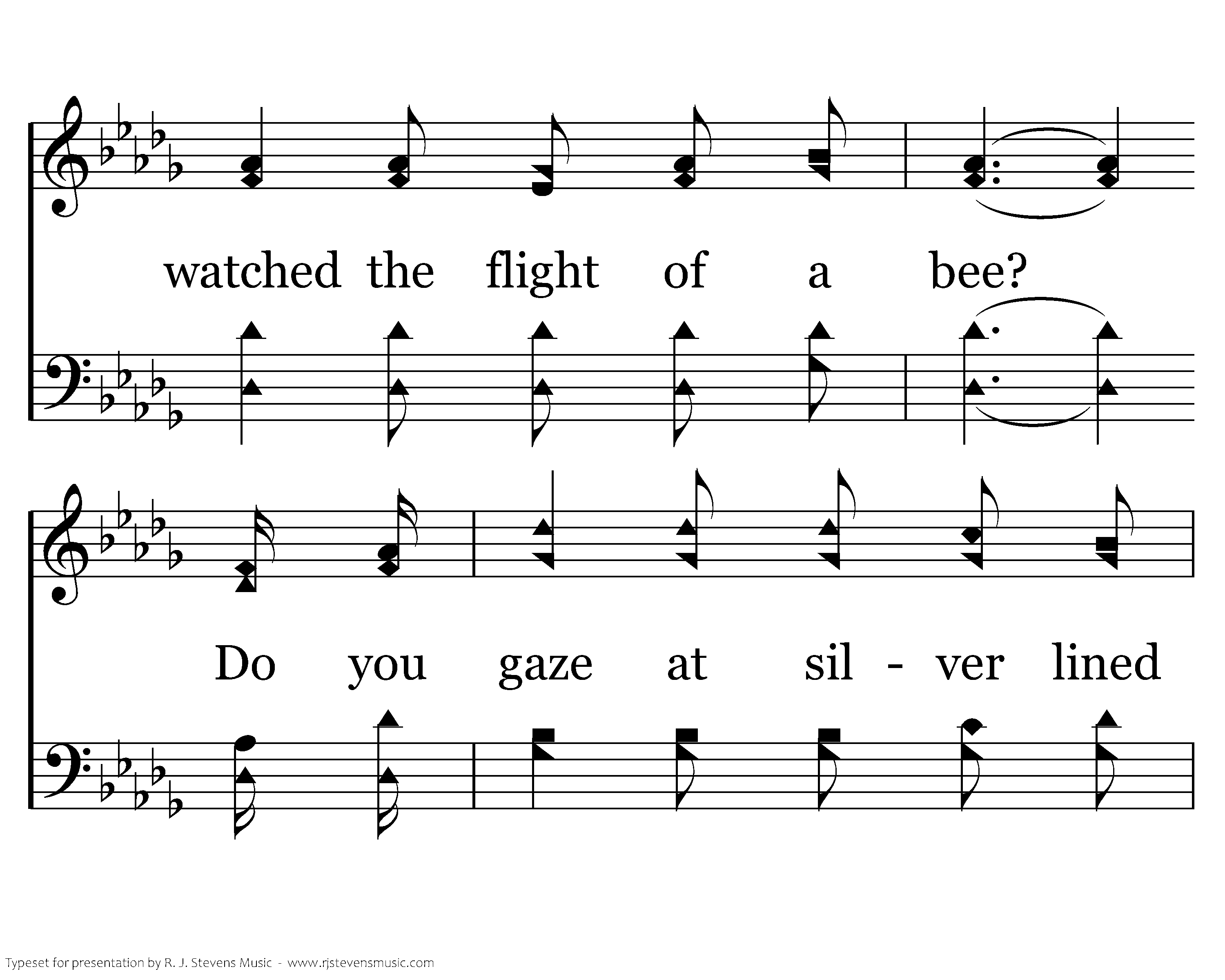 Do you listen to mockingbirds singing? Have you watched the flight of a bee? Do you gaze at silver lined clouds in the sky? Imagine what heaven will be. Have you noticed the details in snowflakes, Each one bright unique mystery? If our God created no two flakes alike, Just imagine what heaven will be.