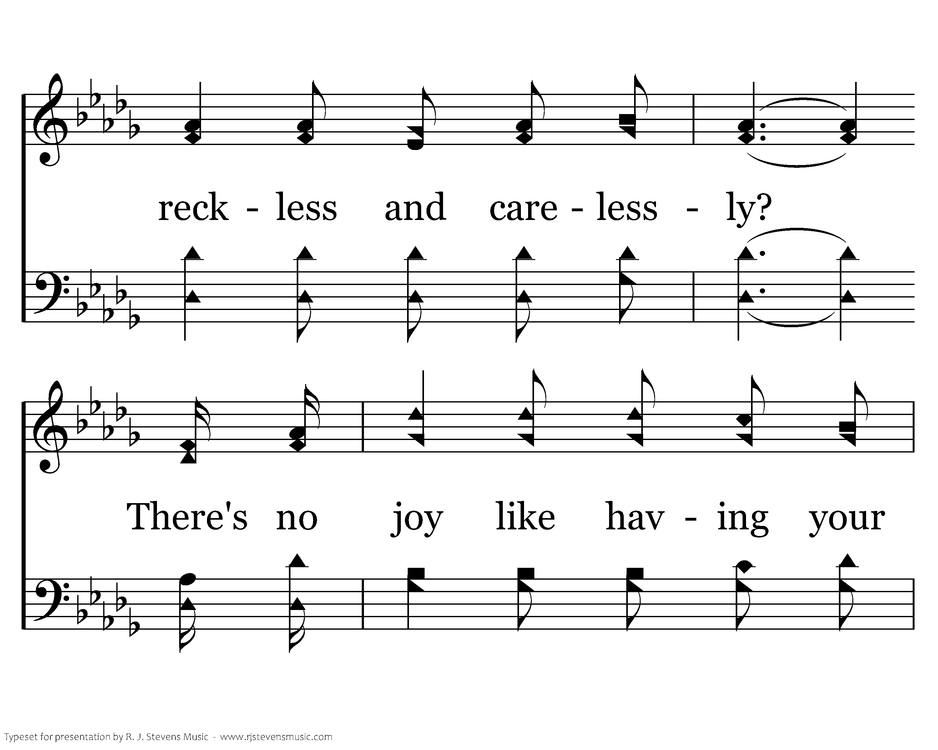 When presened with your little baby, Precious gift that you oversee, Does your heart swell nigh unto bursting each day? Imagine what heaven will be. Do you blush to remember your past sins, Living reckless and carelessly? There's no joy like having your sins all forgiv'n. Just imagine what heaven will be.