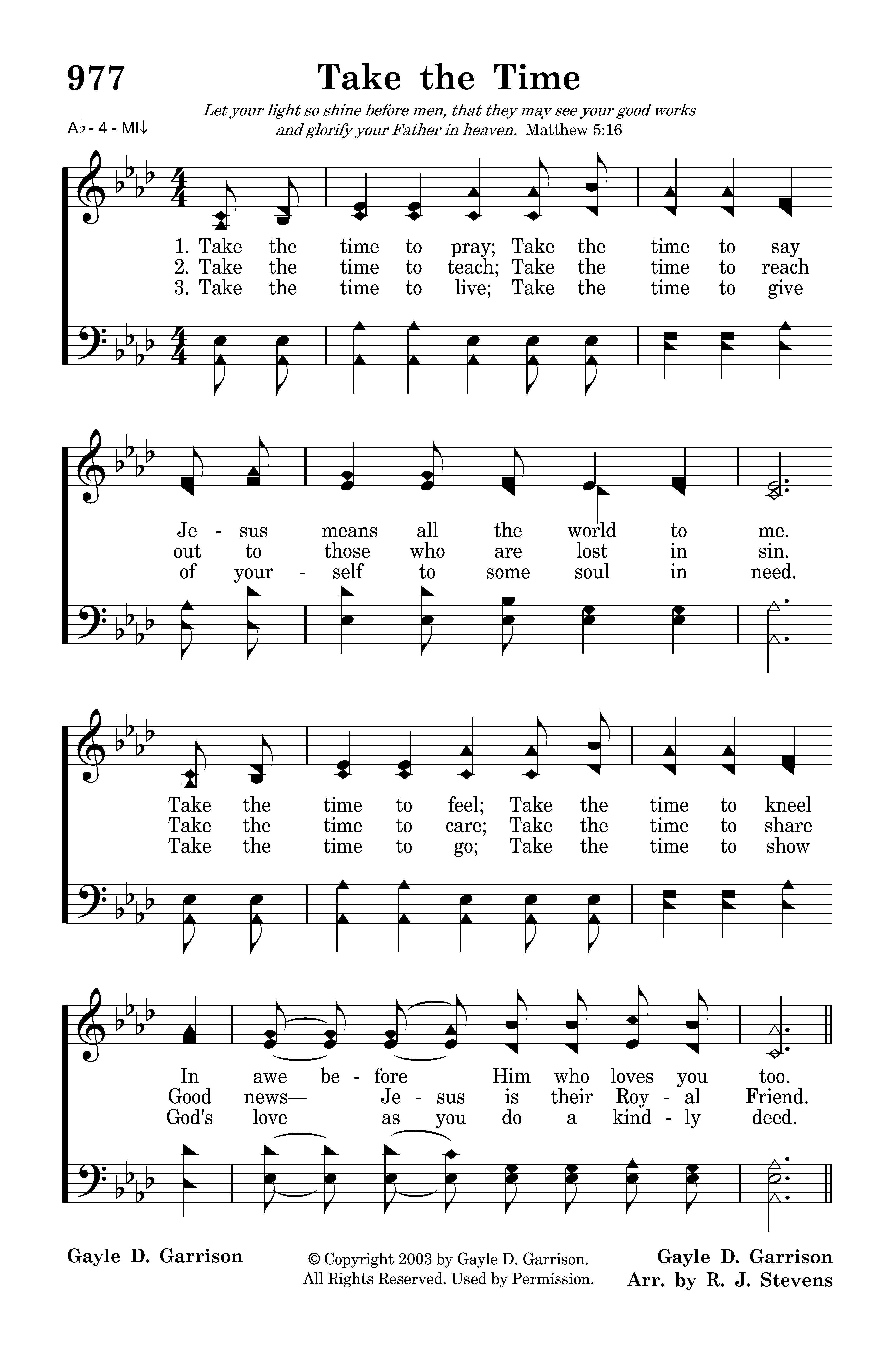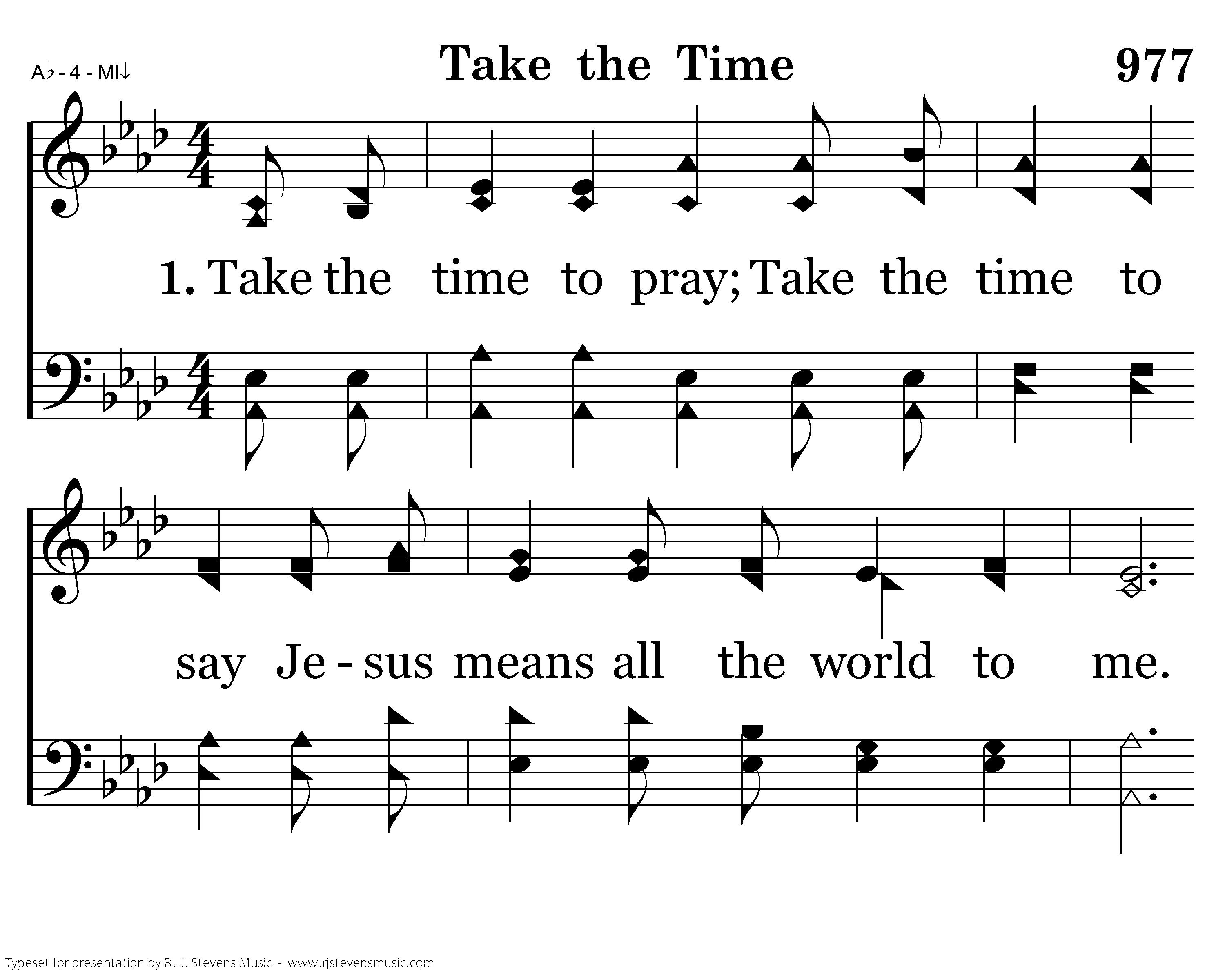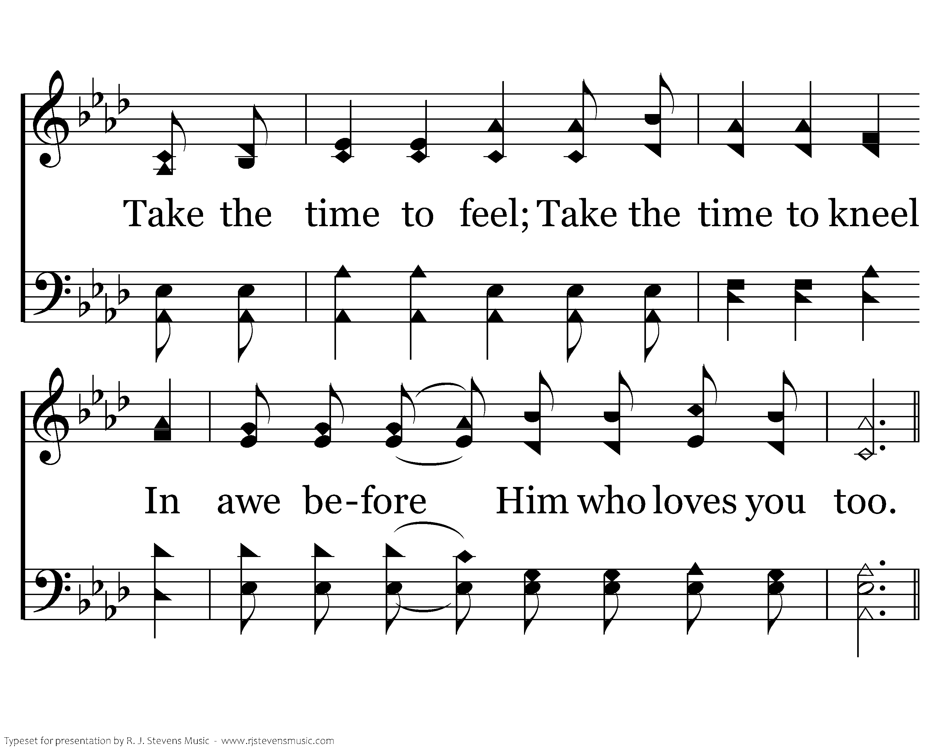Take the time to pray; Take the time to say Jesus means all the world to me. Take the time to feel; Take the time to kneel In awe before Him who loves you too.