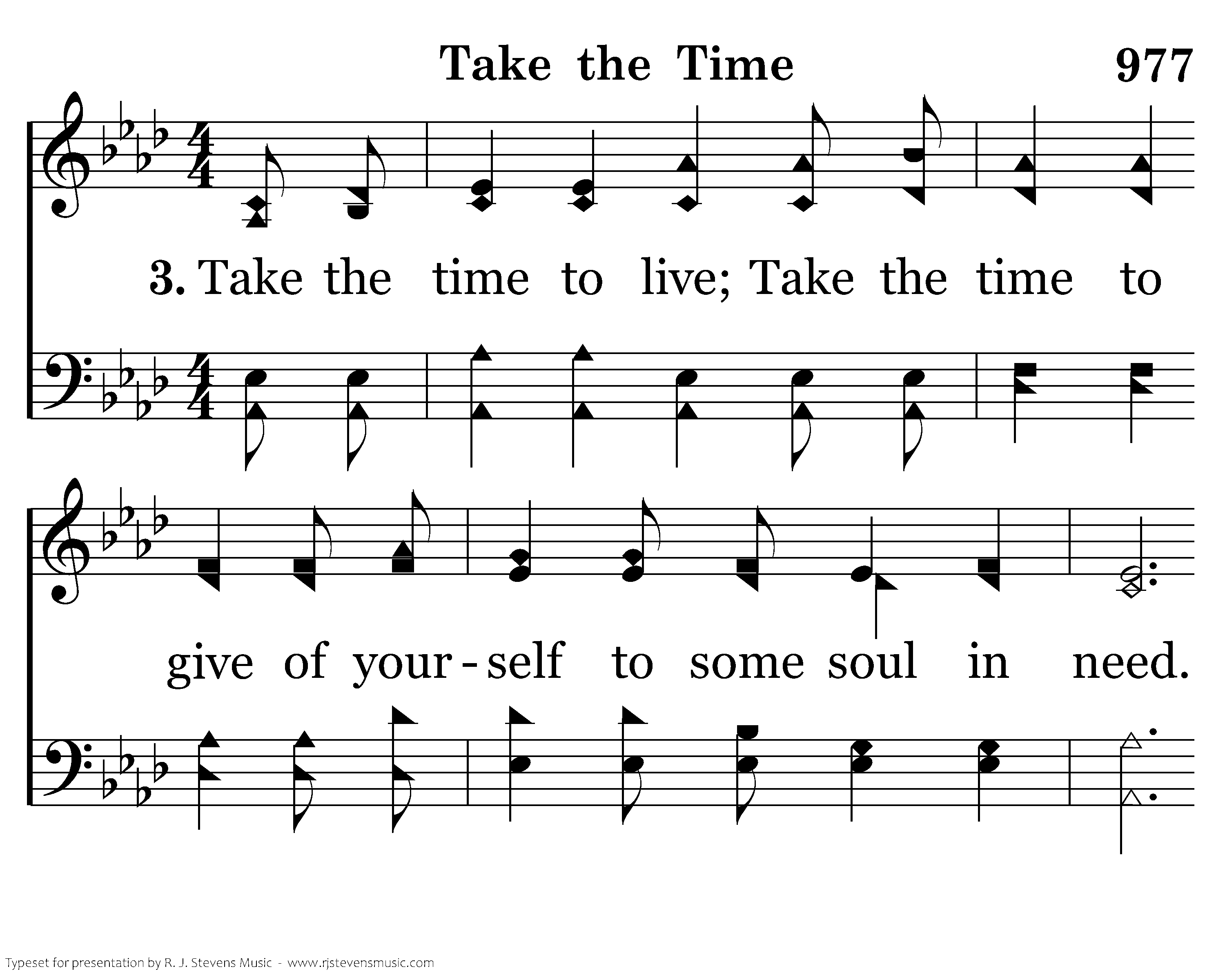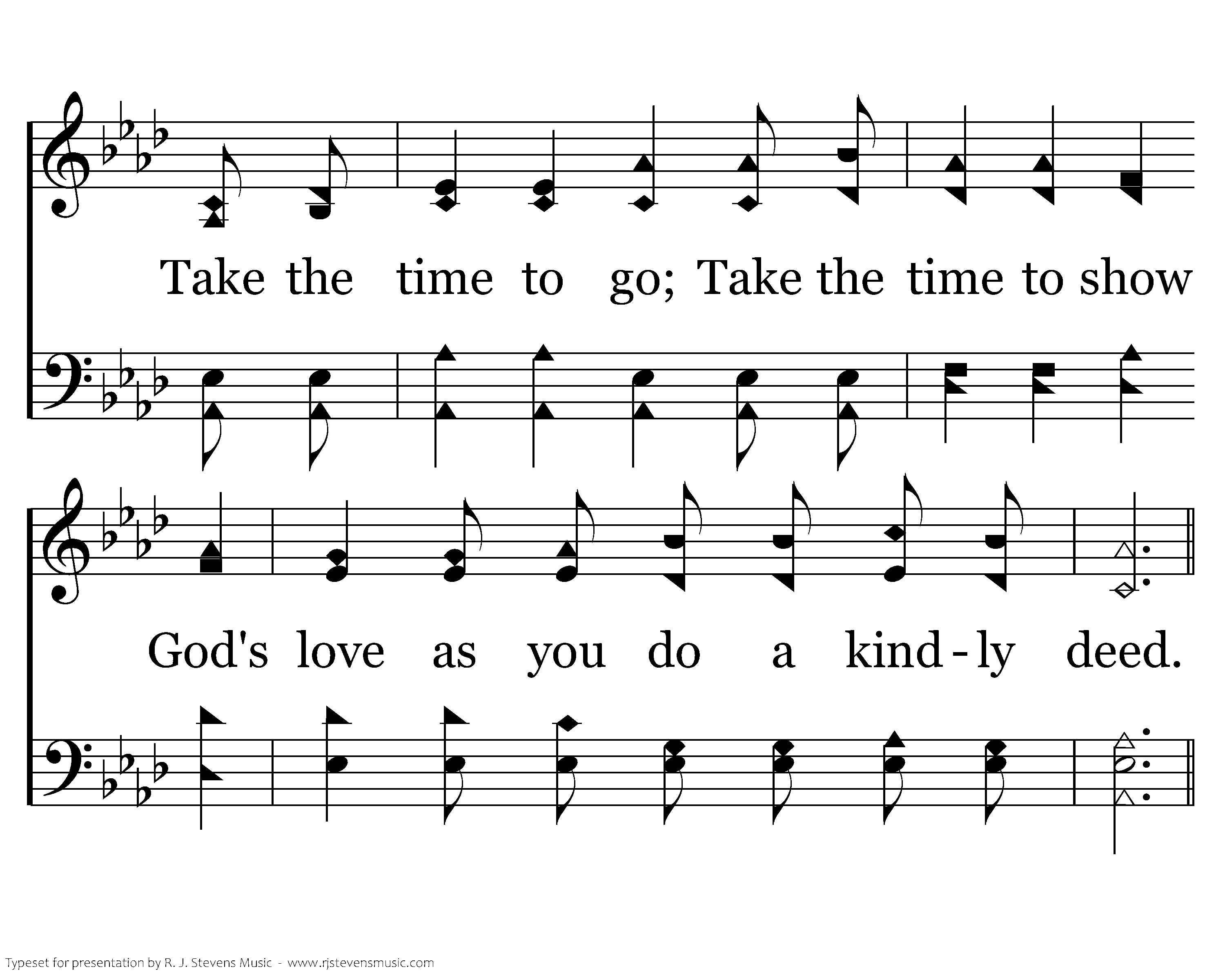 Take the time to live; Take the time to give of yourself to some soul in need. Take the time to go; Take the time to show God's love as you do a kindly deed.