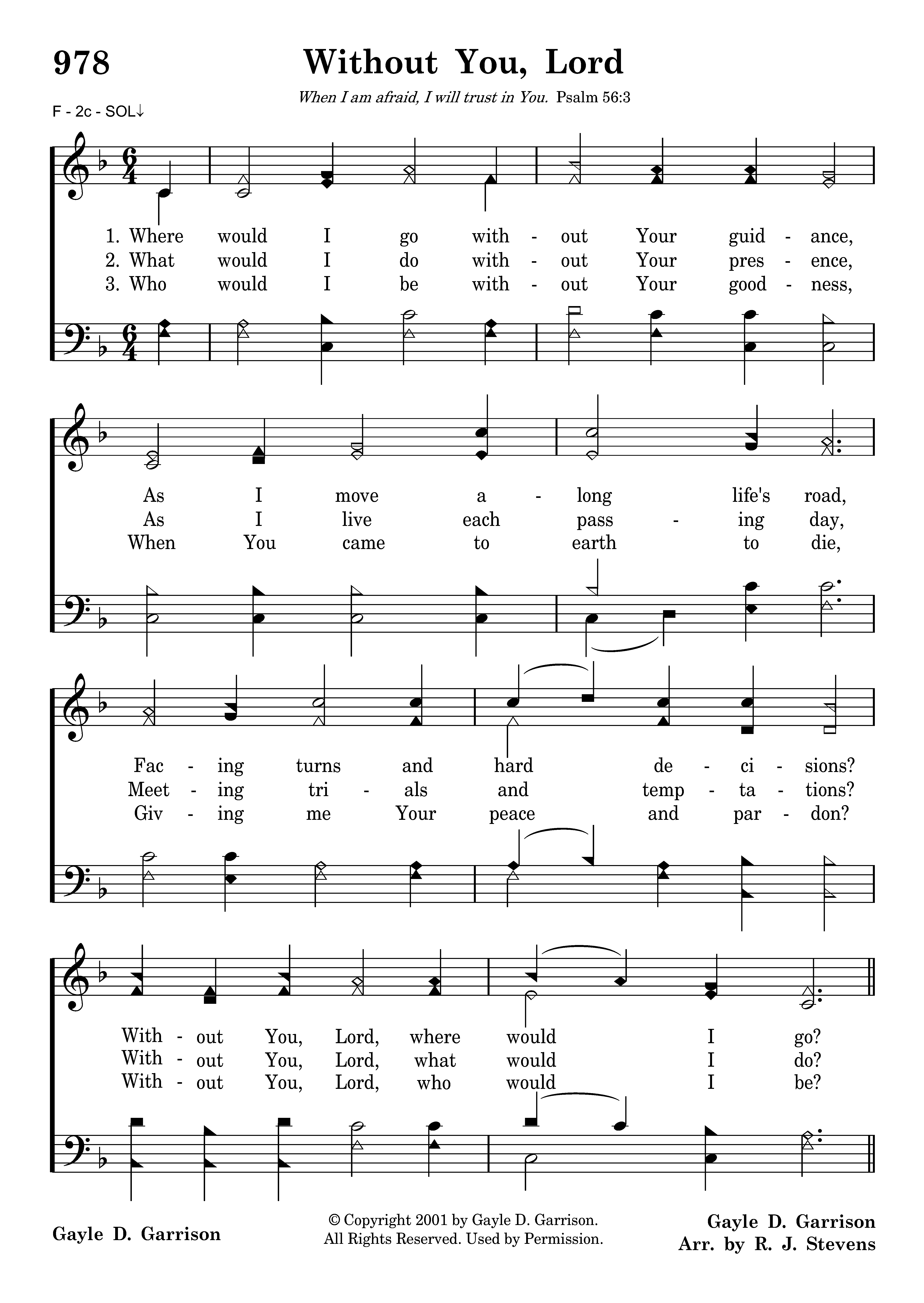 Where would I go withgo without Your guidance, As I move along life's road, Facing turns and hard decisions? Without You, Lord, where would I go?