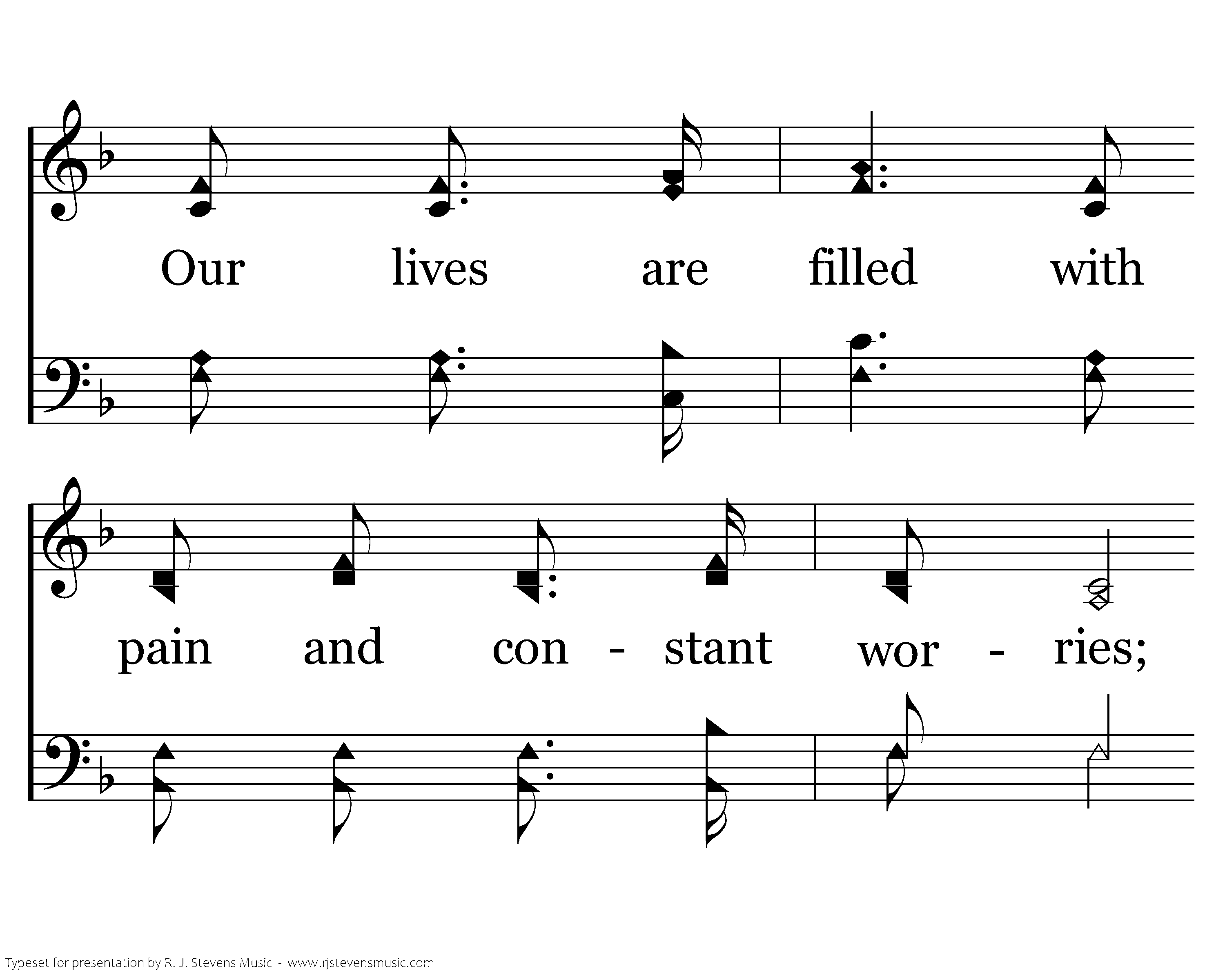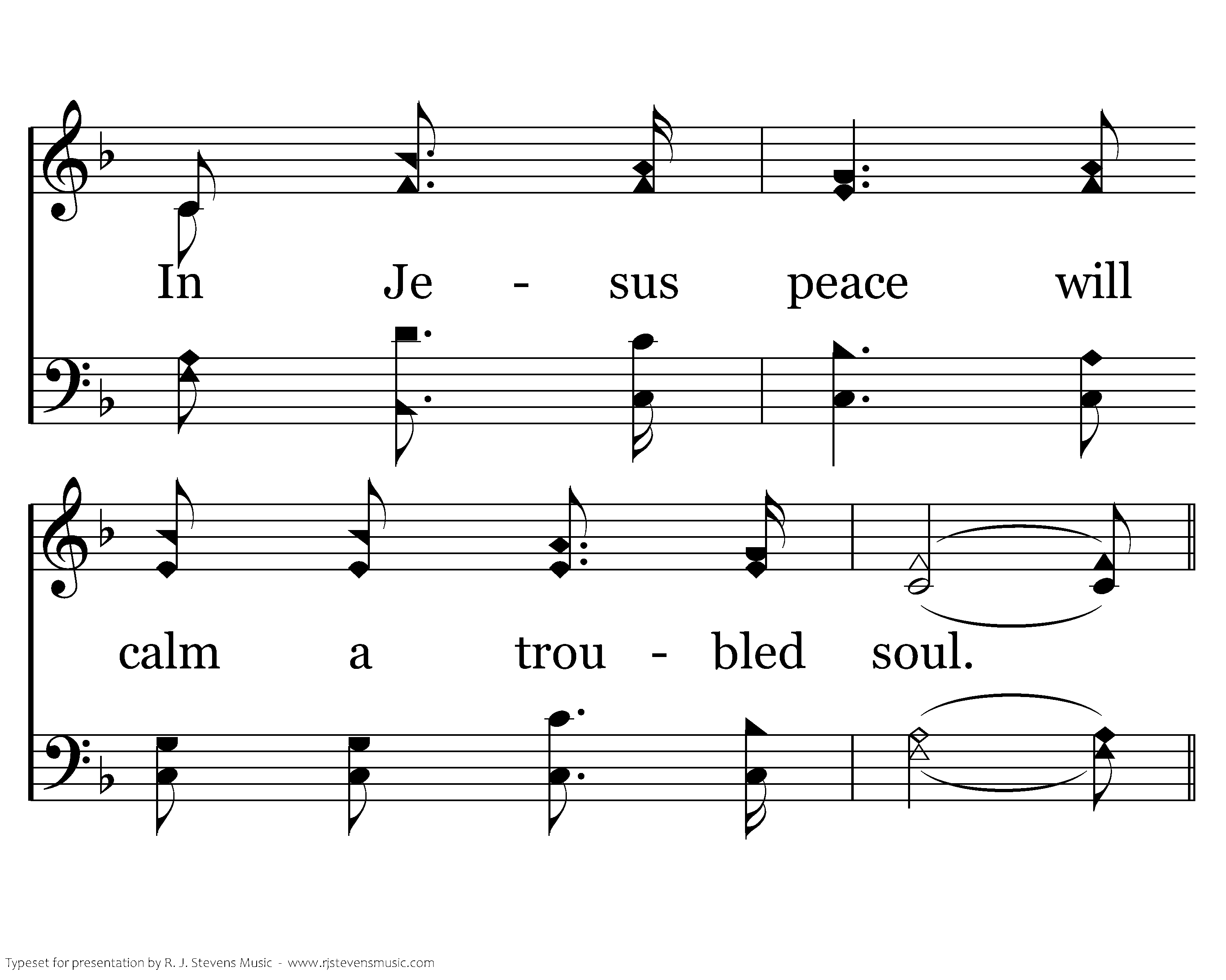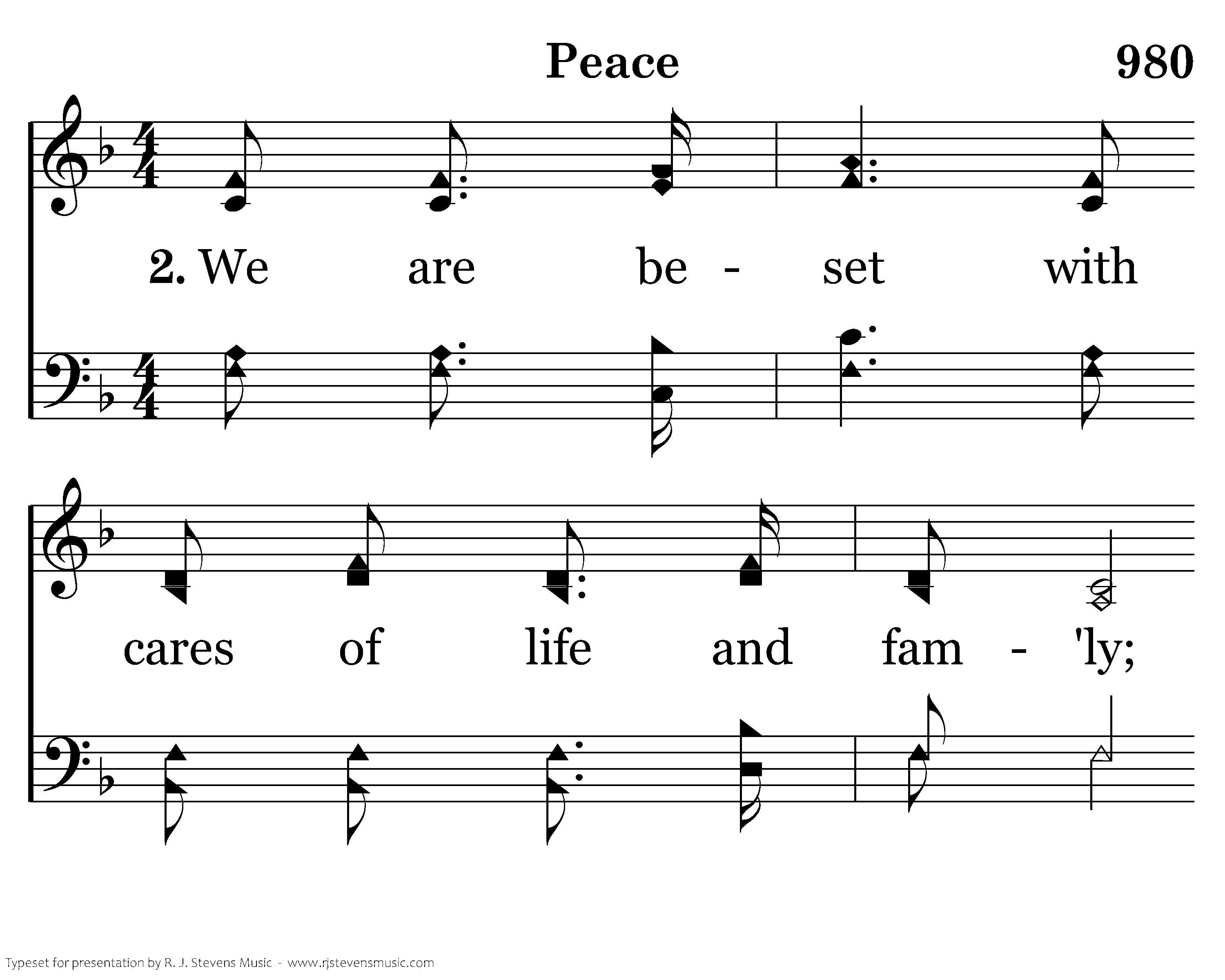 We are beset with cares of life and fam'ly; Distressed by tests that we cannot control. Our lives are filled with pain and constant worries; In Jesus peace will calm a troubled soul.