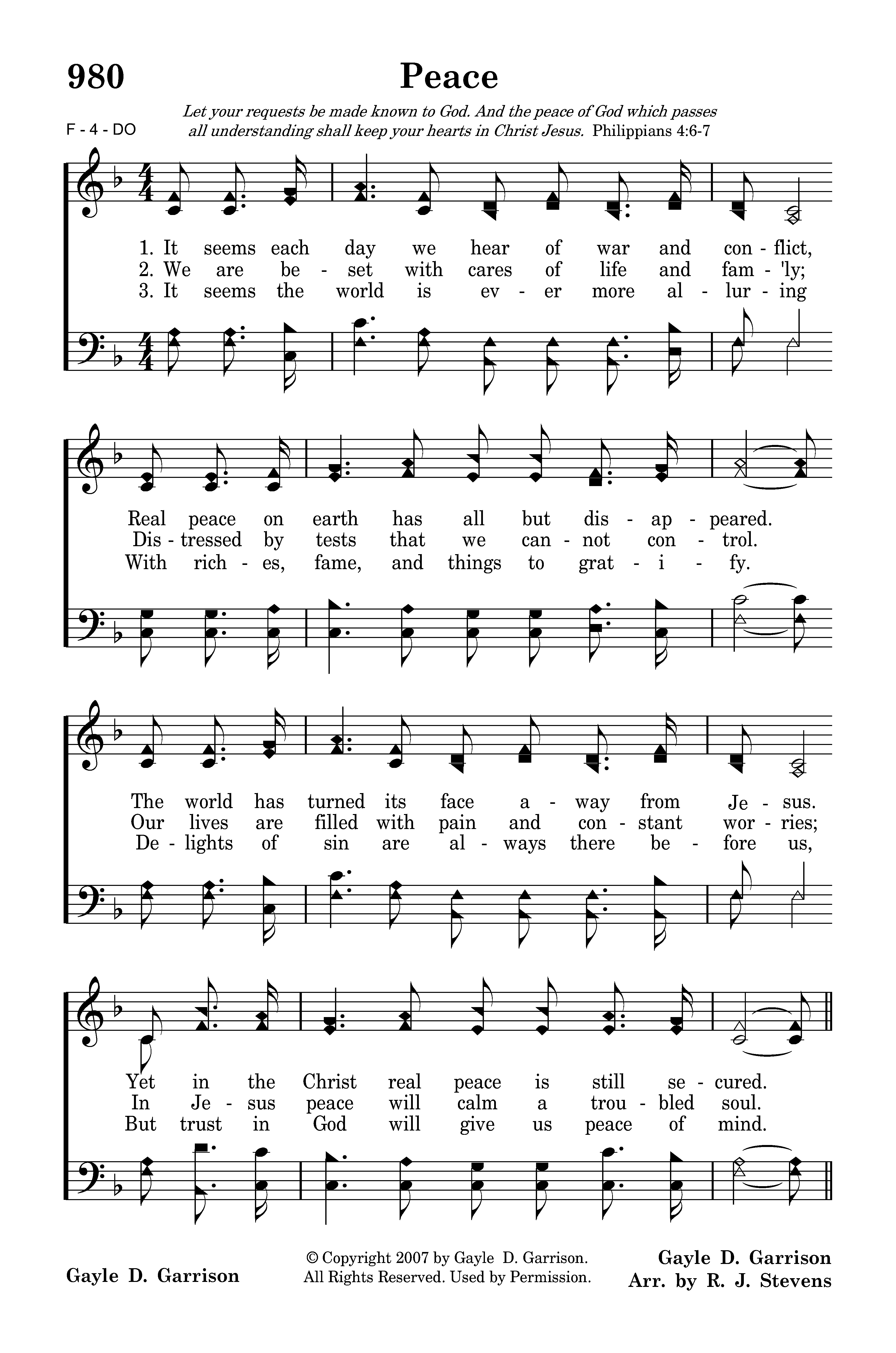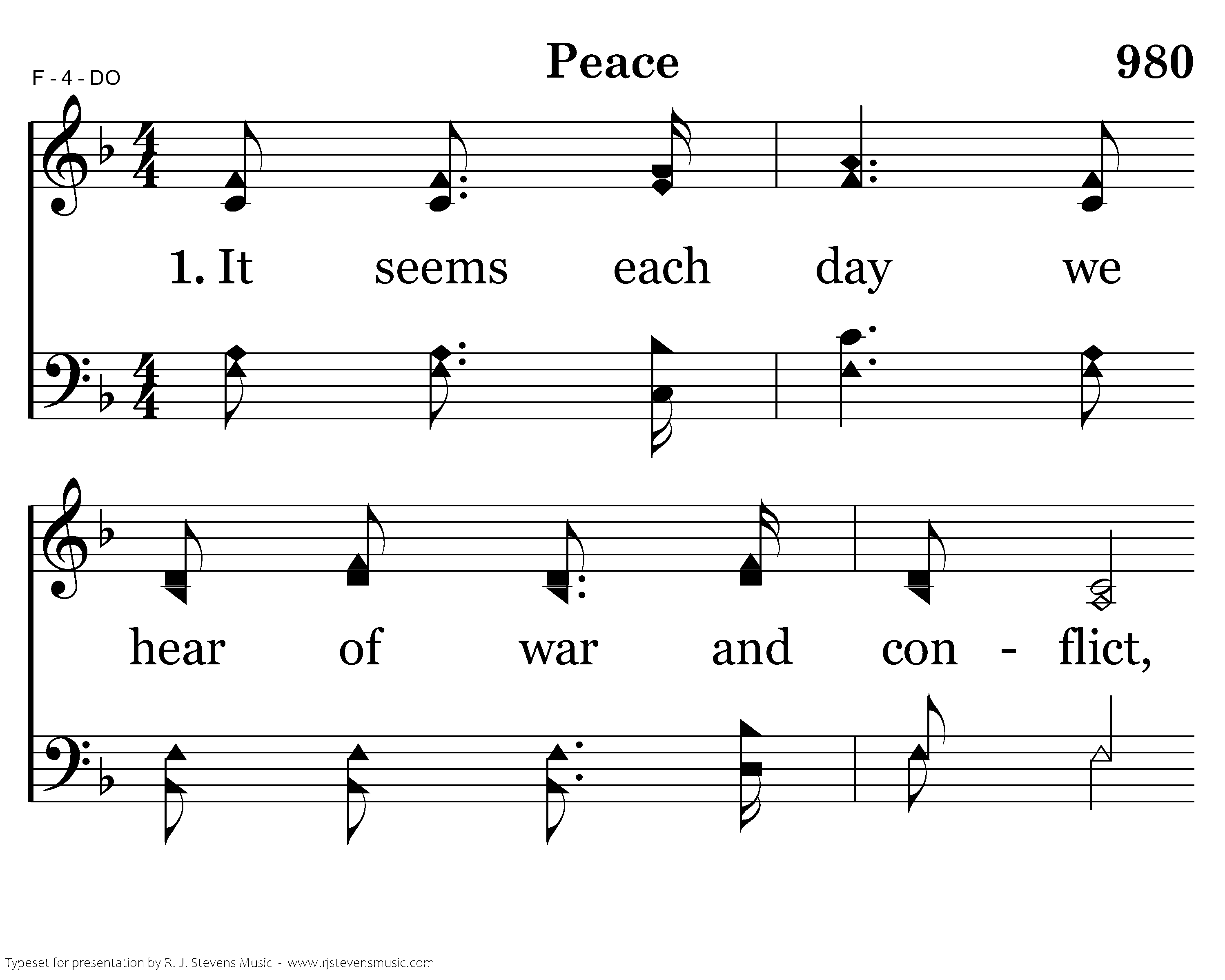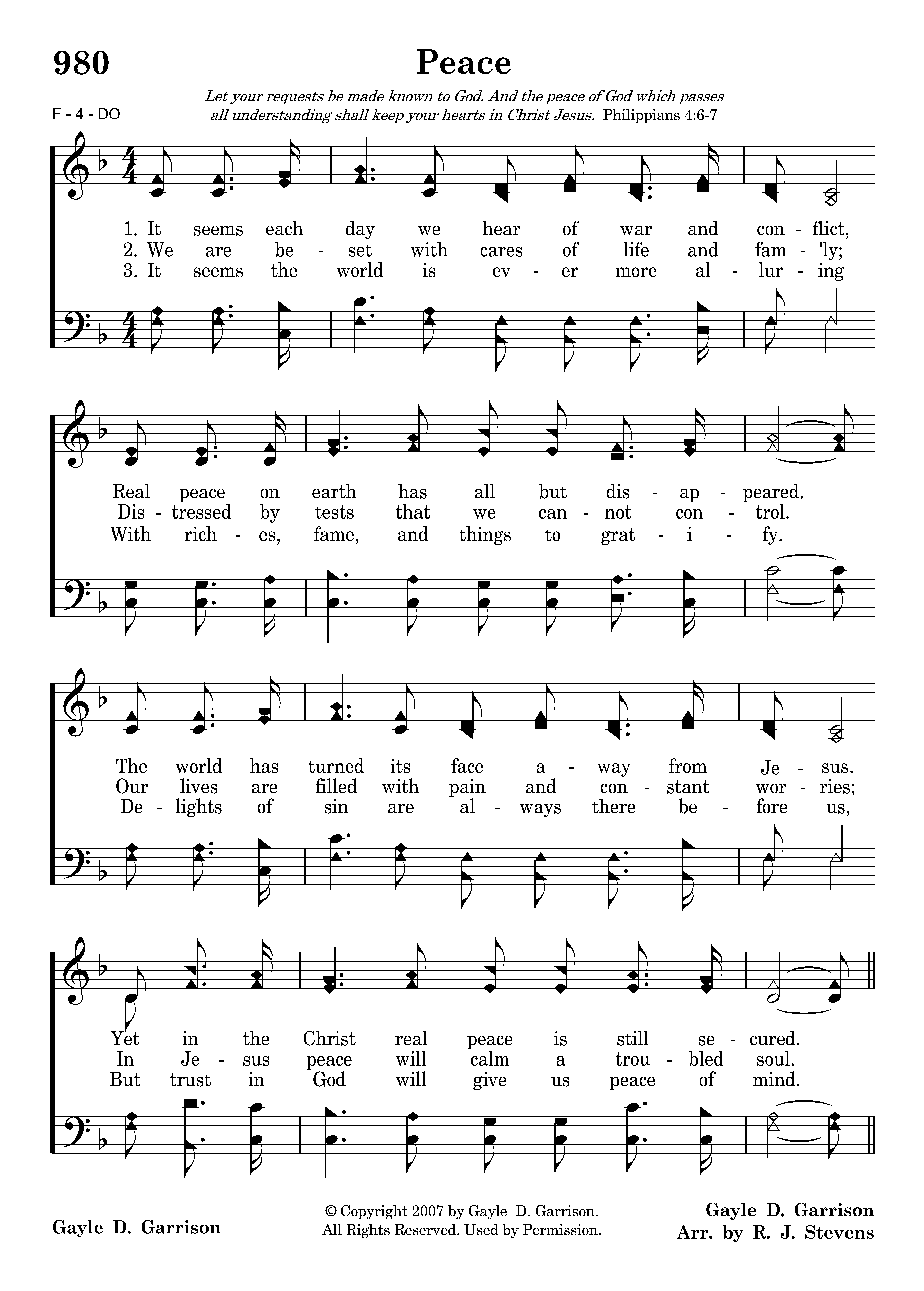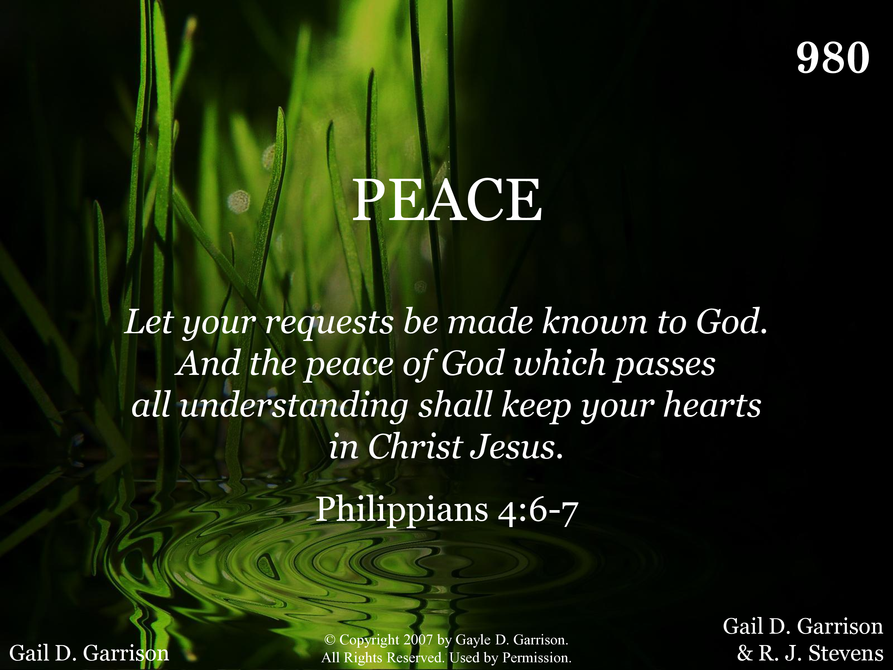 We are beset with cares of life and fam'ly; Distressed by tests that we cannot control. Our lives are filled with pain and constant worries; In Jesus peace will calm a troubled soul.