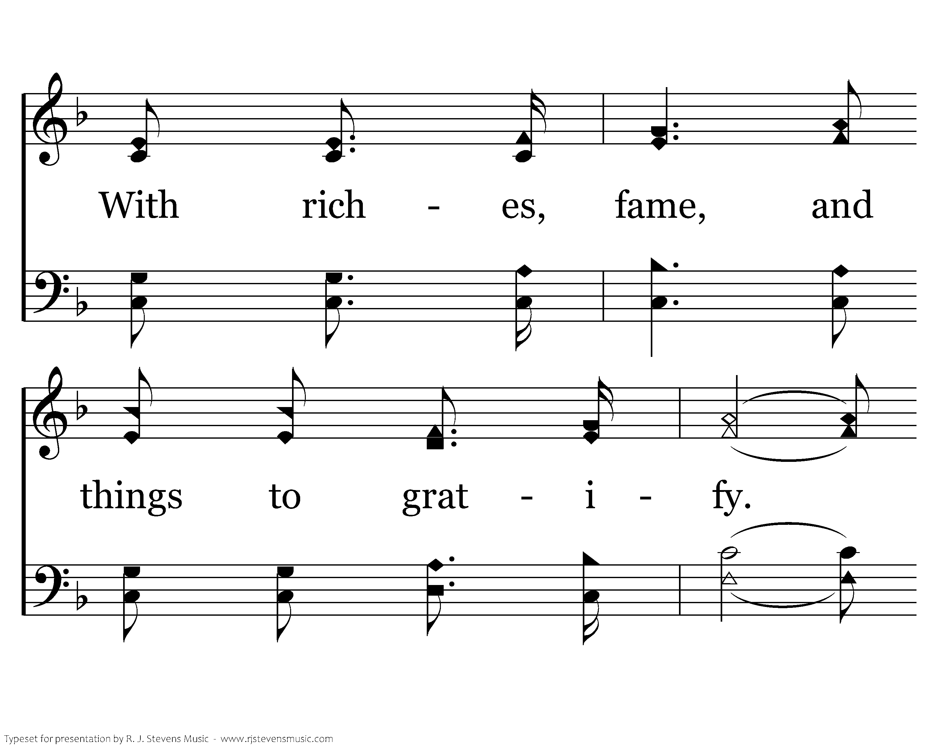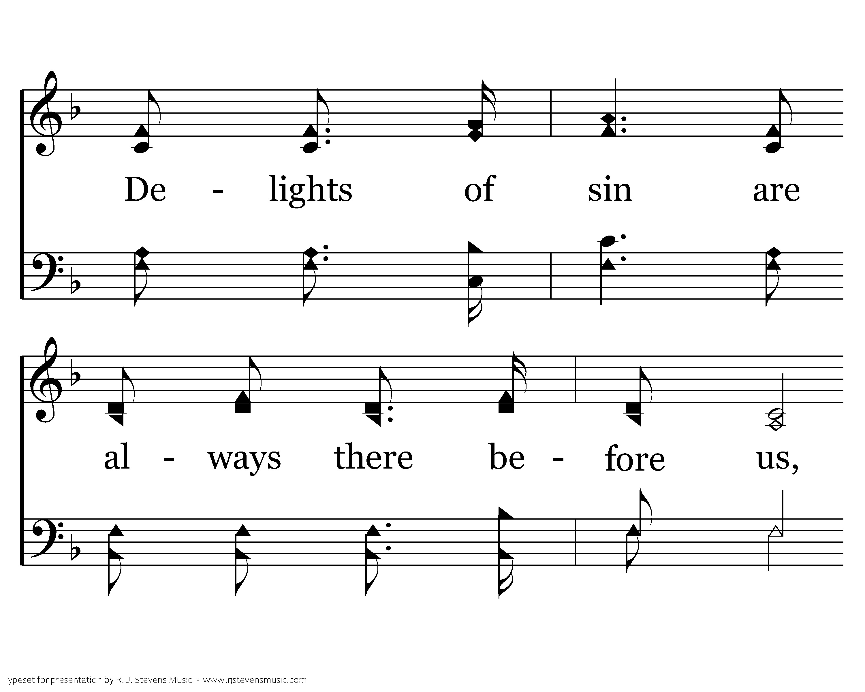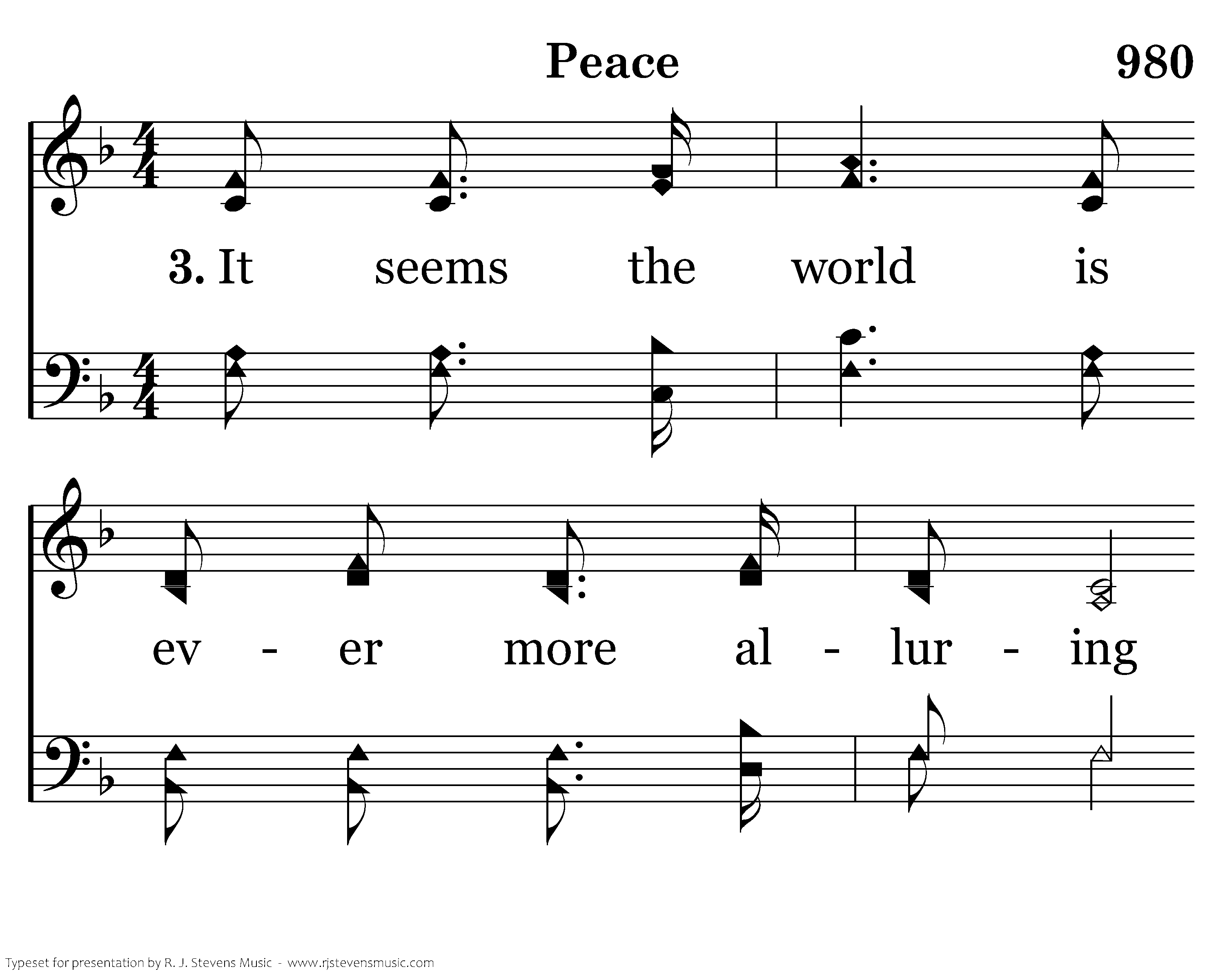 It seems the world is ever more alluring With riches, fame, and things to gratify. Delights of sin are always there before us, But trust in God will give us peace of mind.