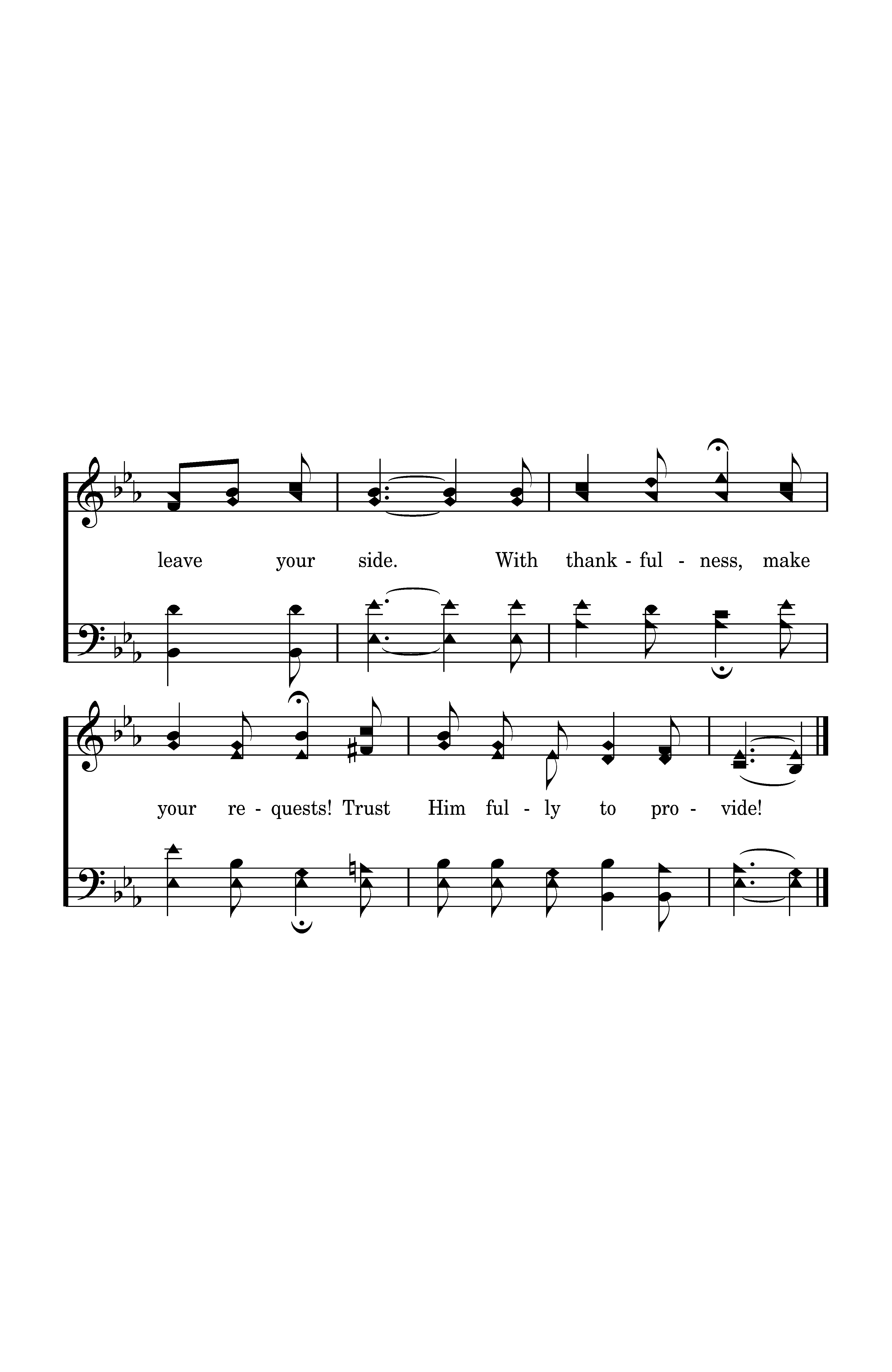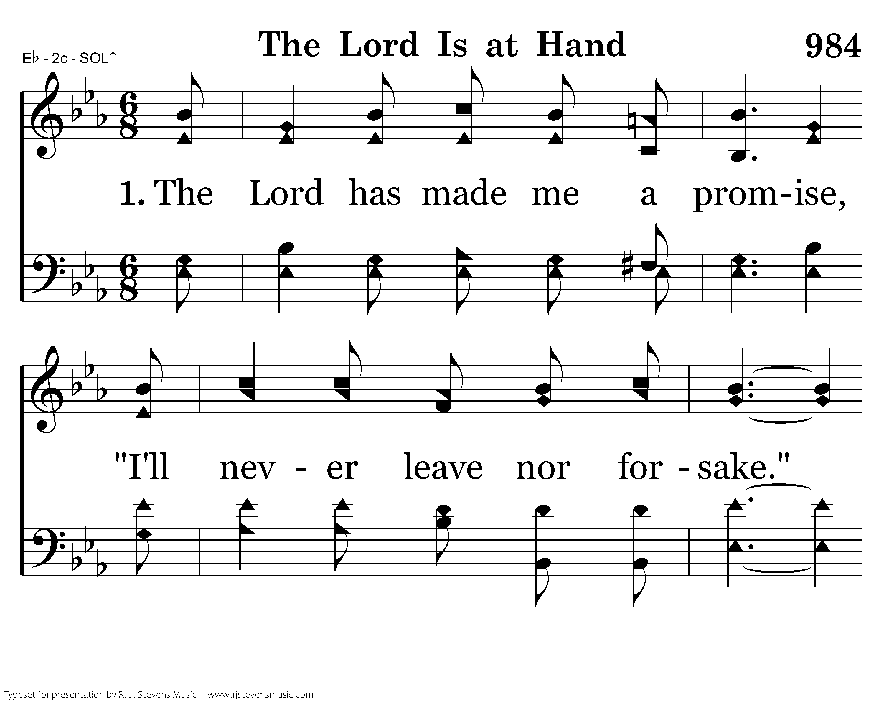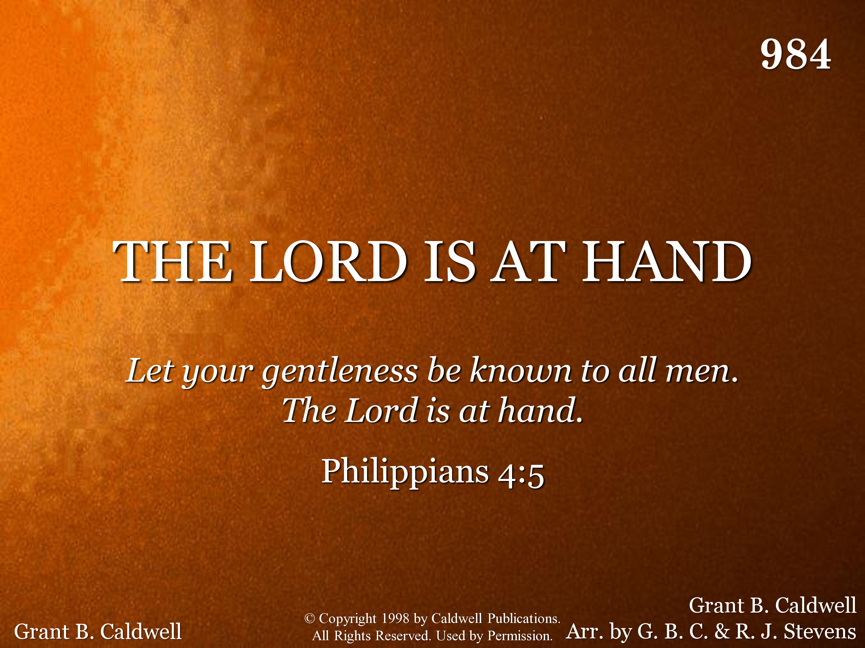 The Lord's at hand! Yes, He's at hand! He'll never leave your side. With thankfulness, make your requests! Trust Him fully to provide!