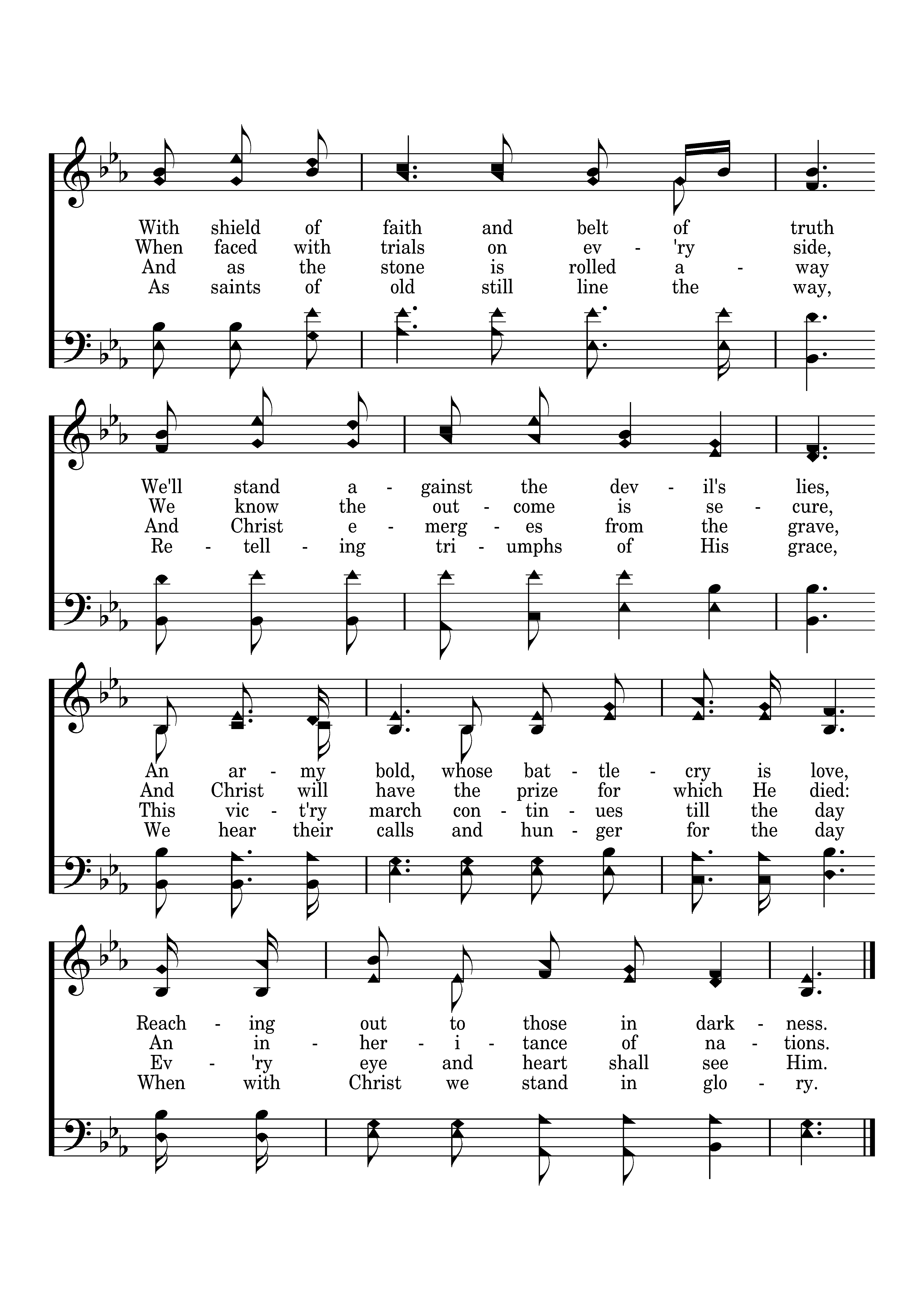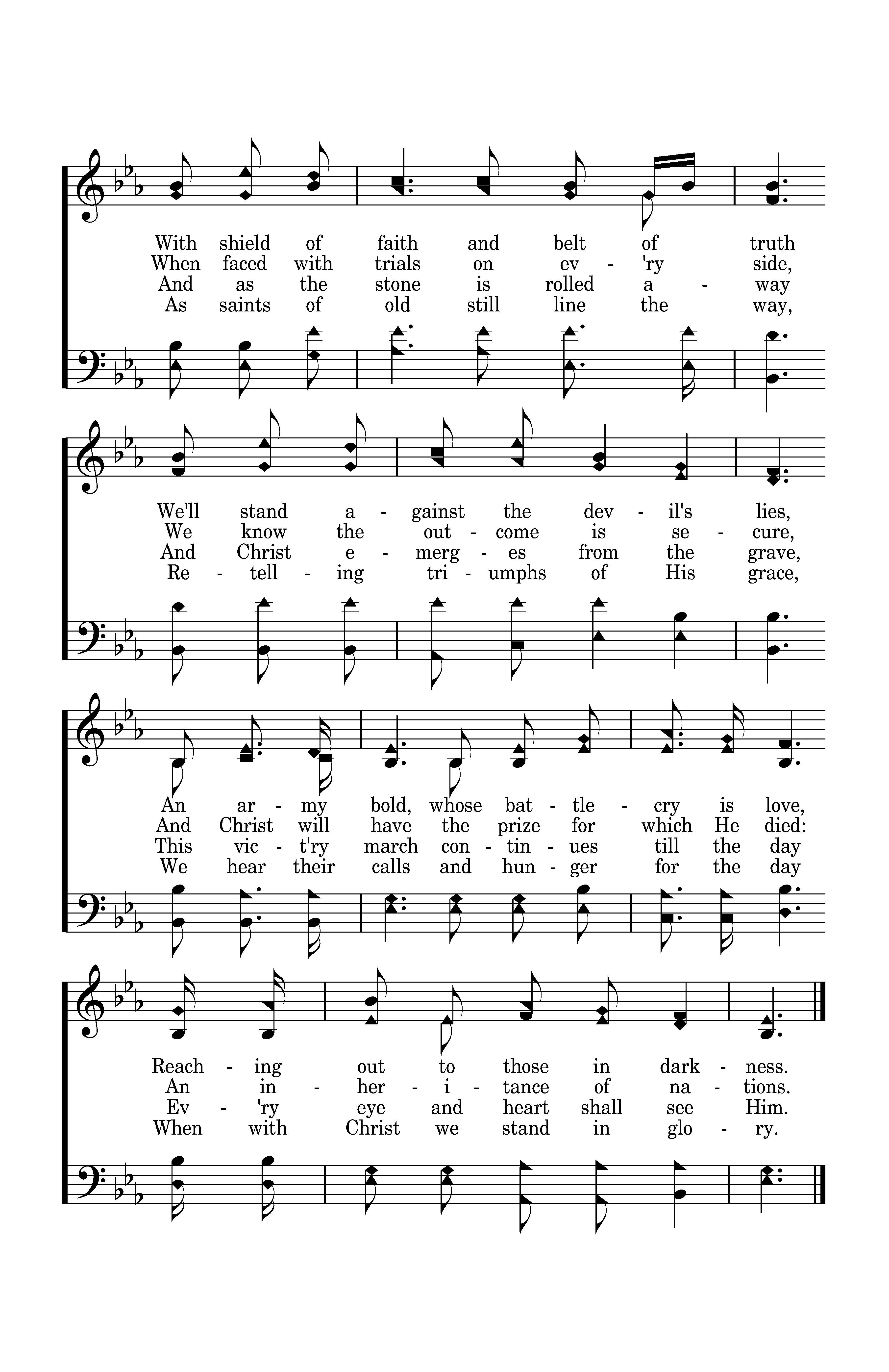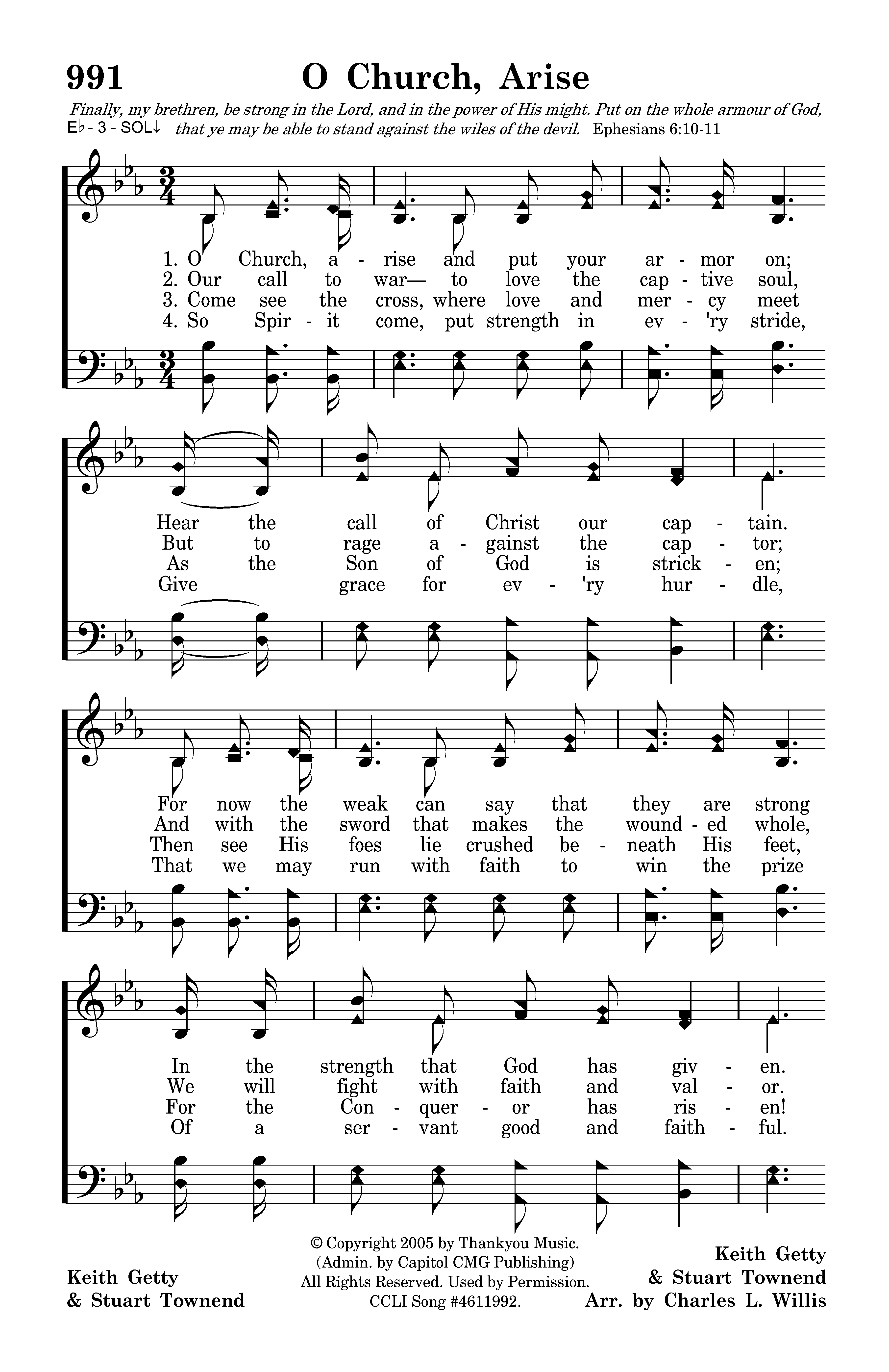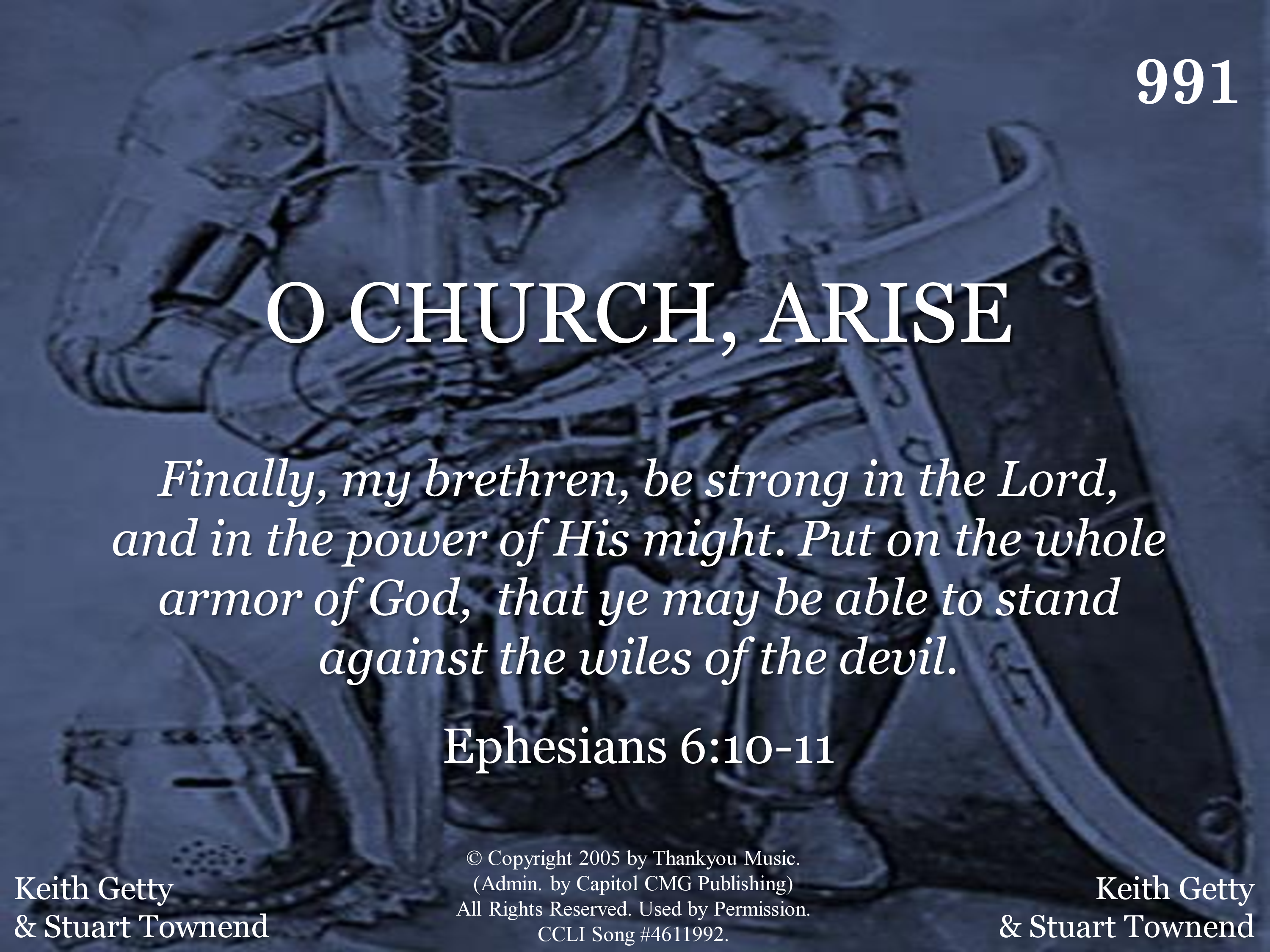 O Church, arise and put your armor on; Hear the call of Christ our captain. For now the weak can say that they are strong In the strength that God has given. With shield of faith and belt of truth We'll stand against the devil's lies, An army bold, whose battlecry is love, Reaching out to those in darkness.
