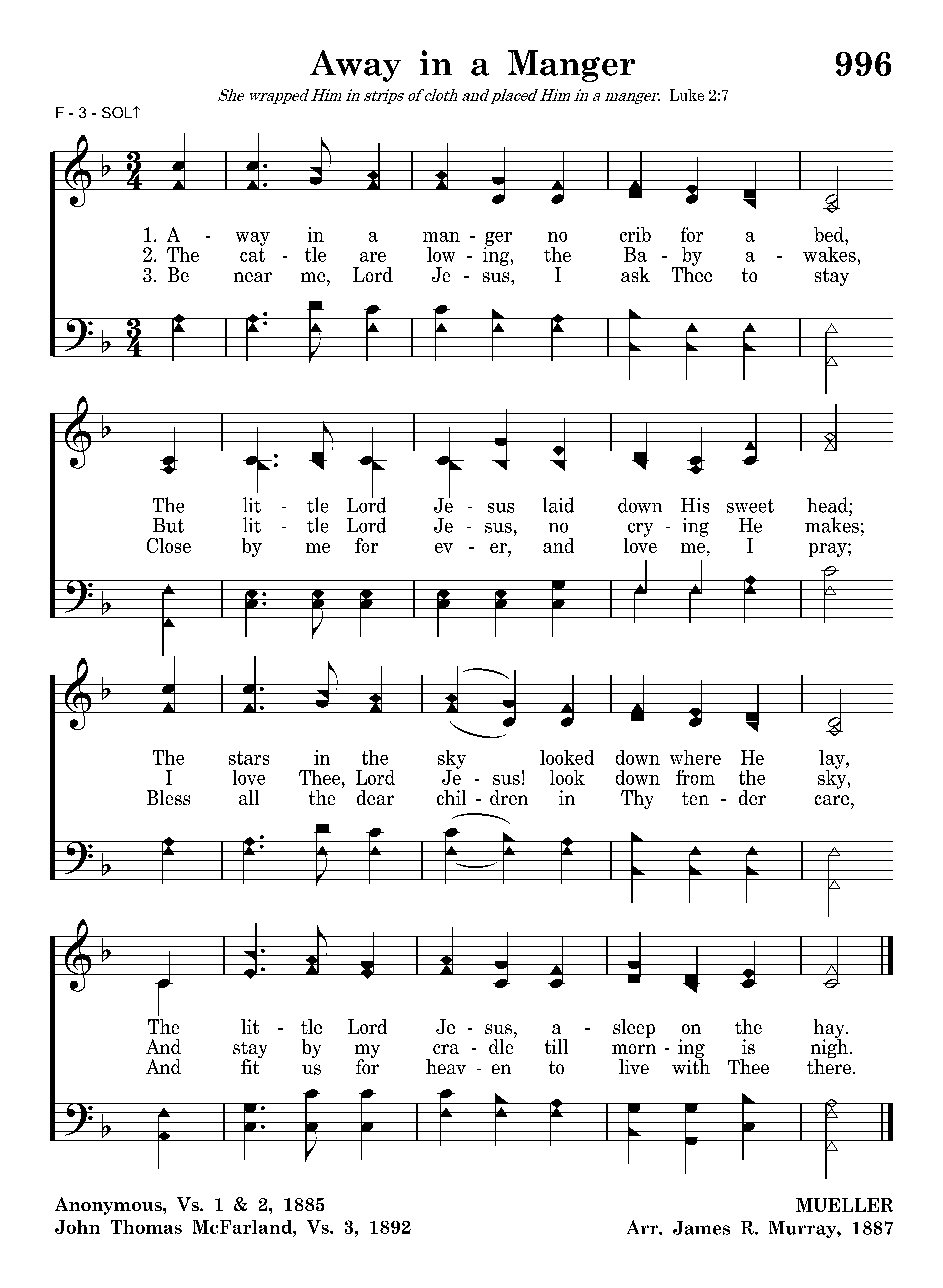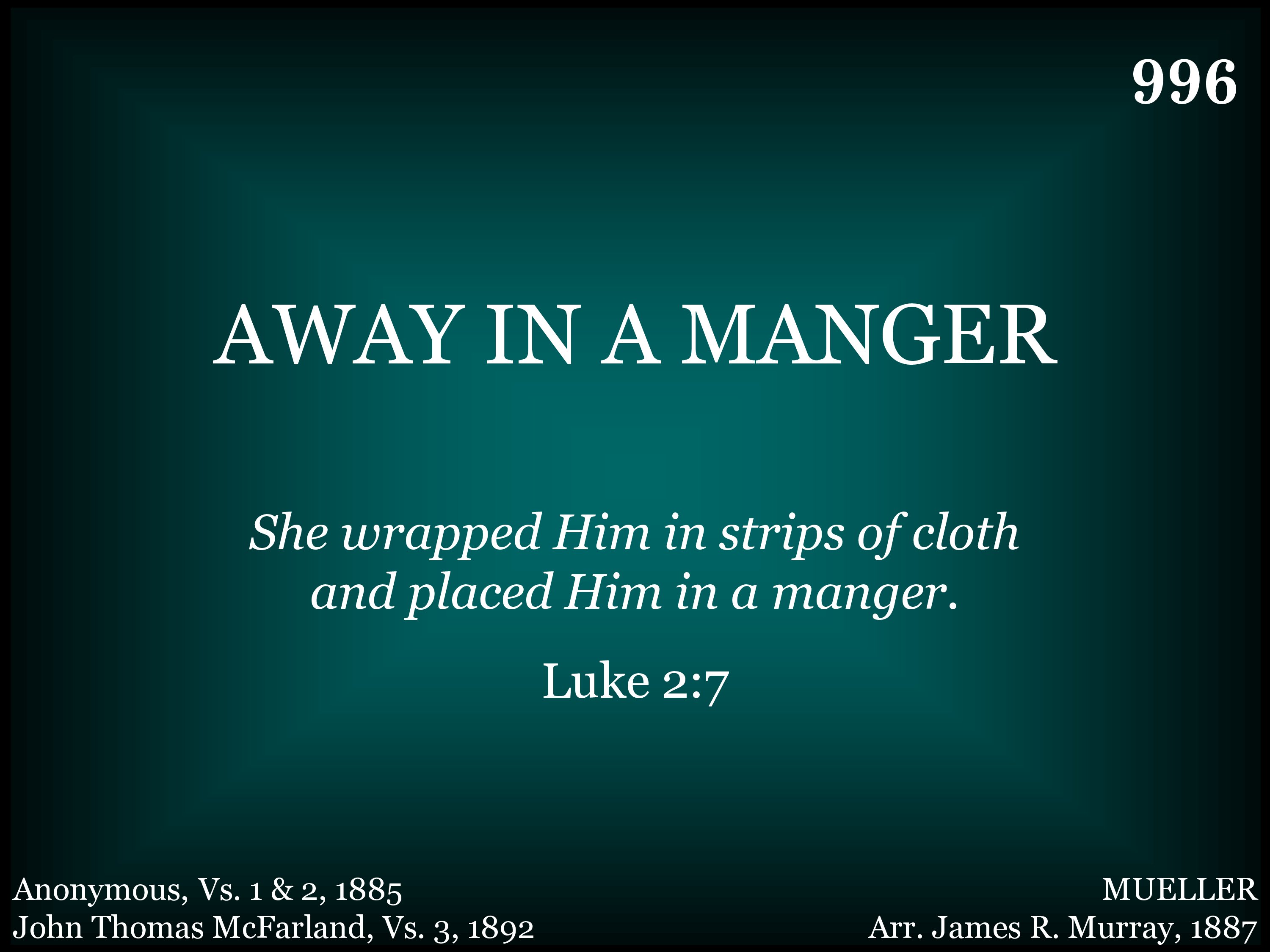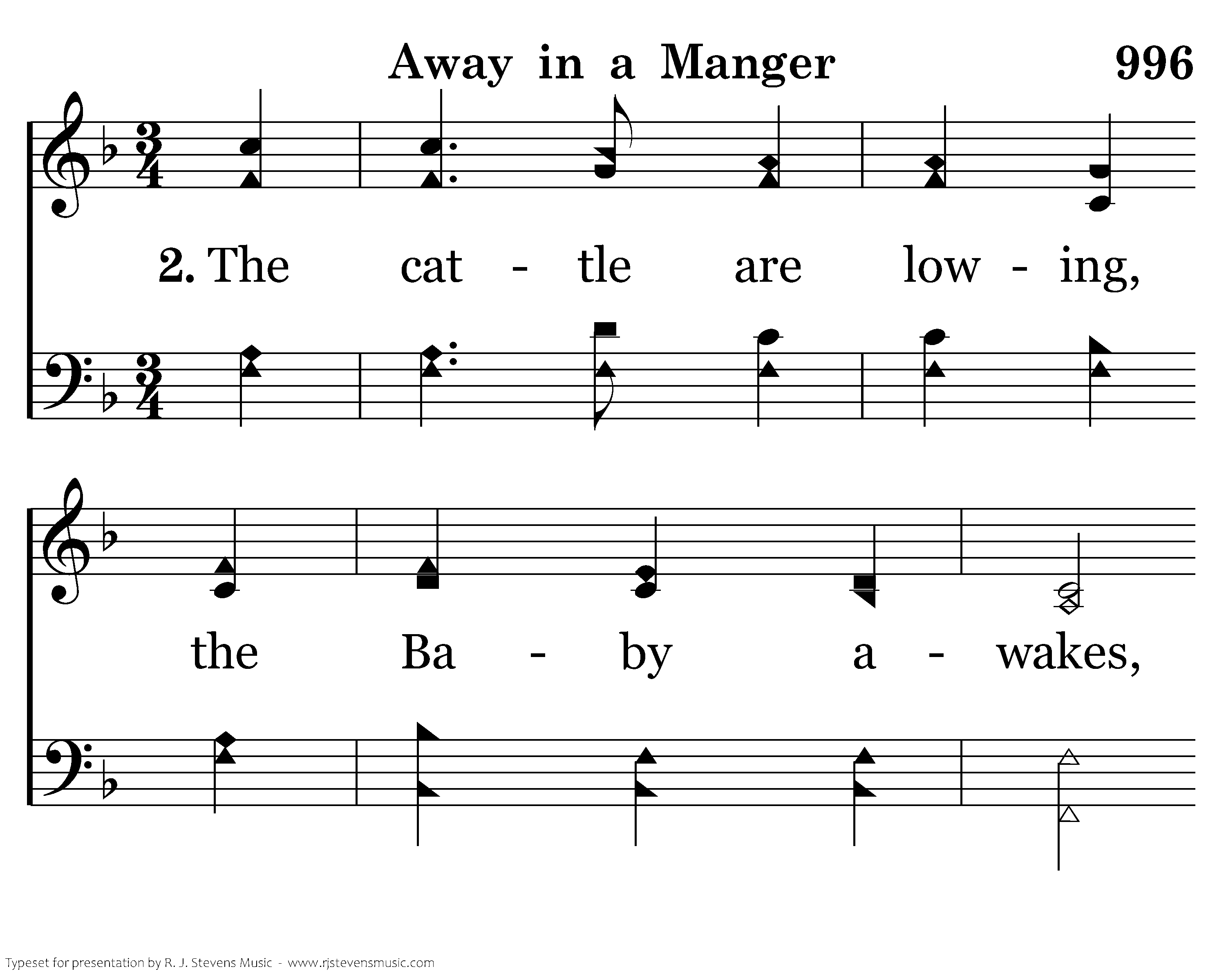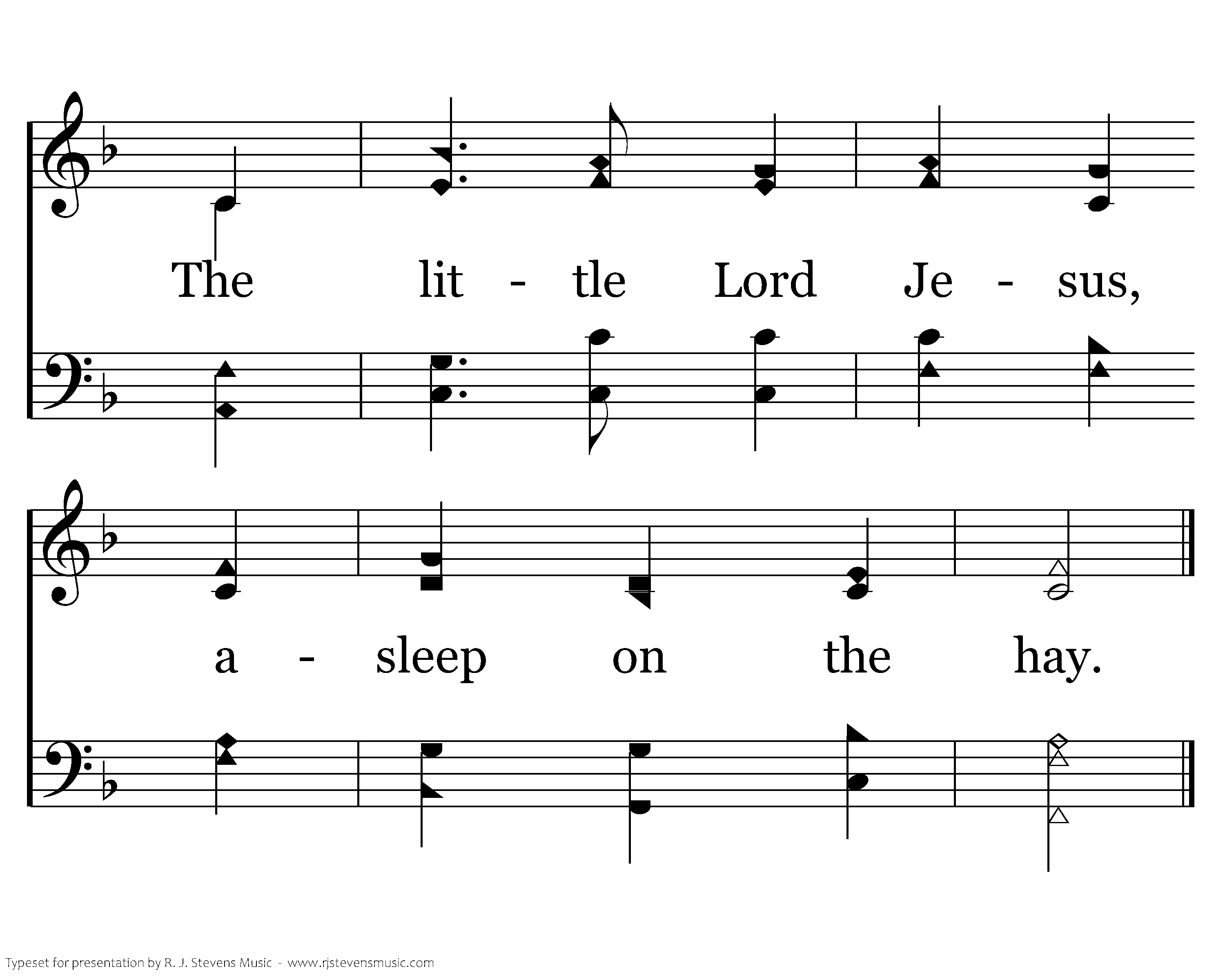 Away in a manger no crib for a bed, The little Lord Jesus laid down His sweet head; The stars in the sky looked down where He lay, The little Lord Jesus, asleep on the hay.