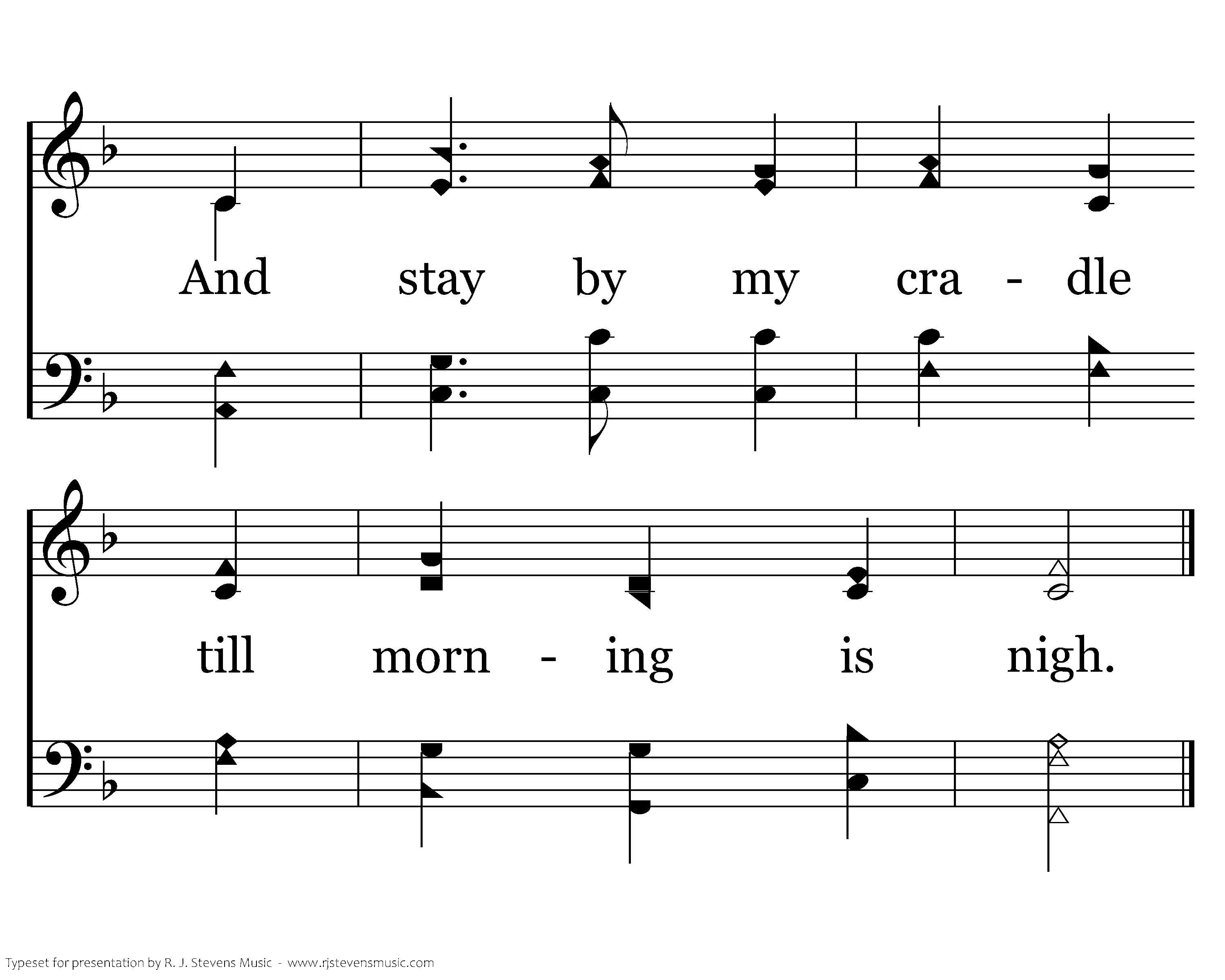 The cattle are lowing, the Baby awakes, But little Lord Jesus, no crying He makes; I love Thee, Lord Jesus! look down from the sky, And stay by my cradle till morning is nigh.