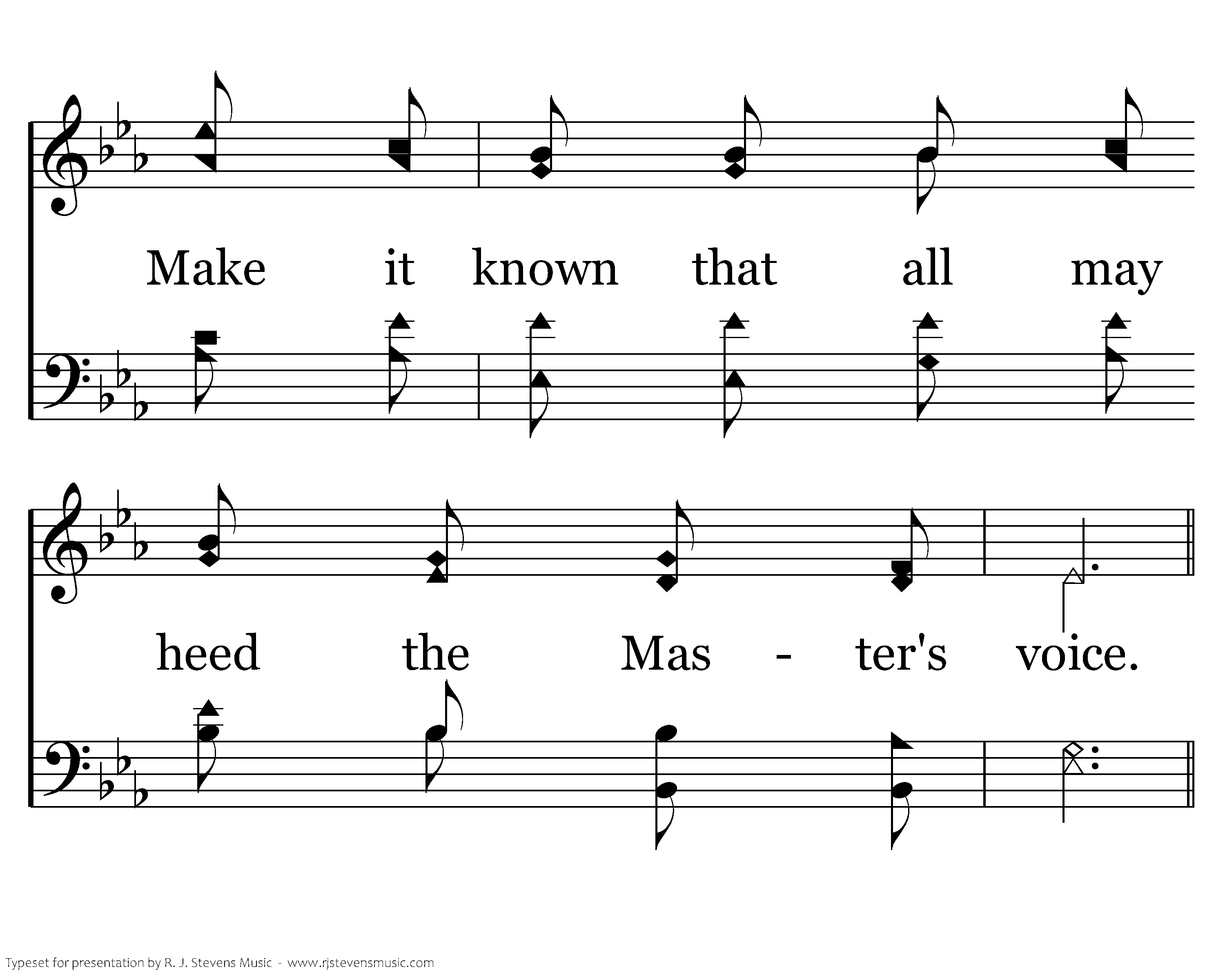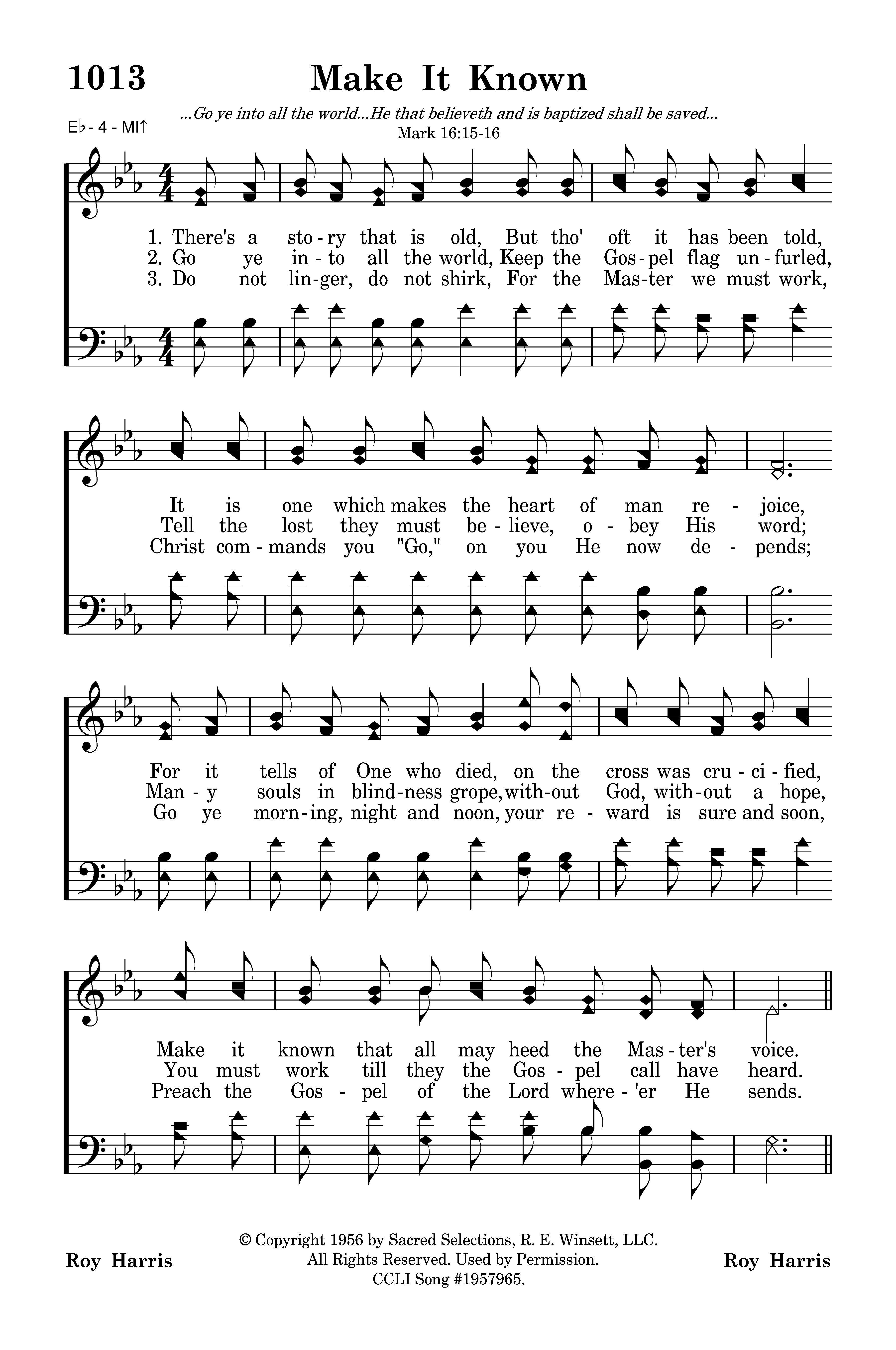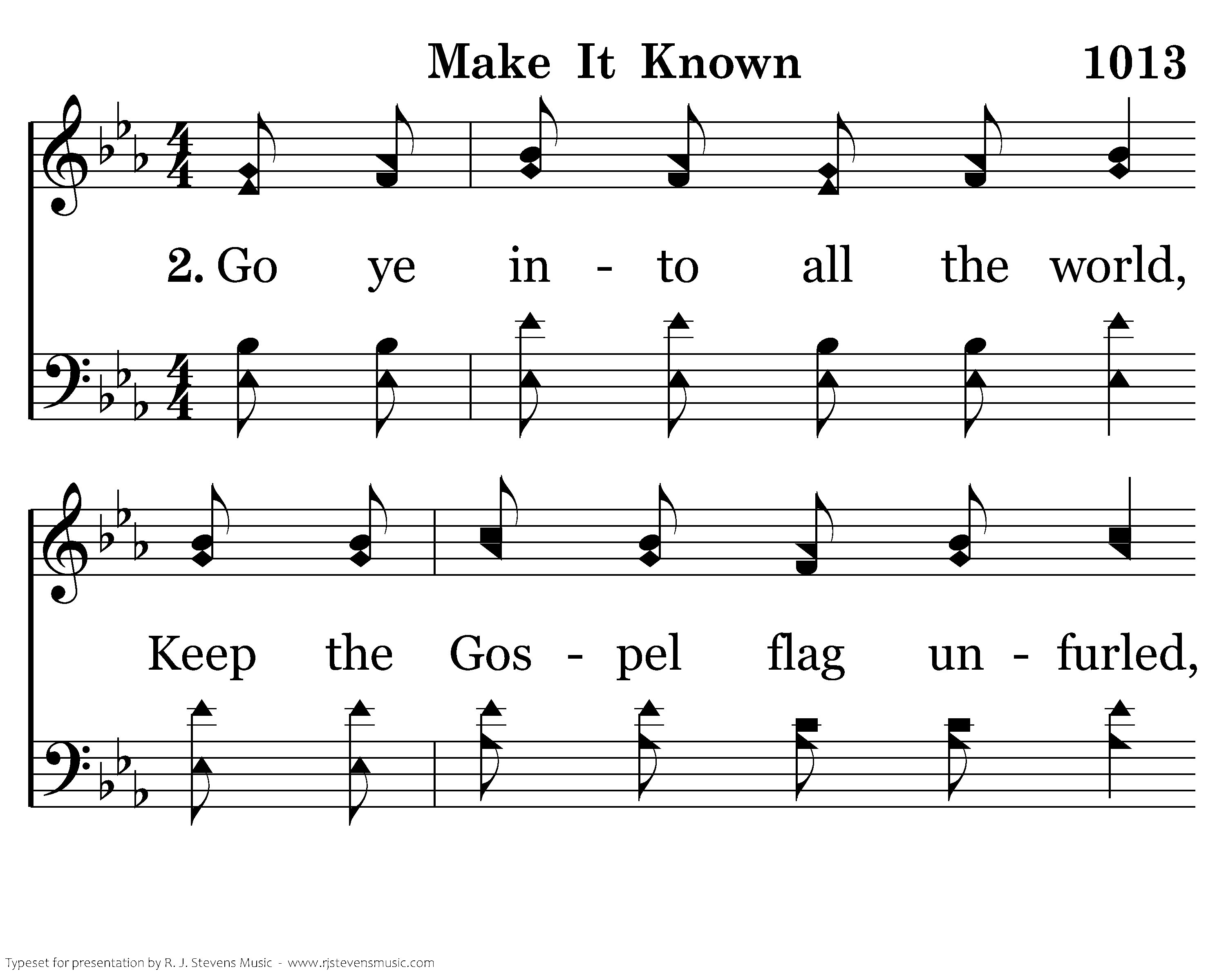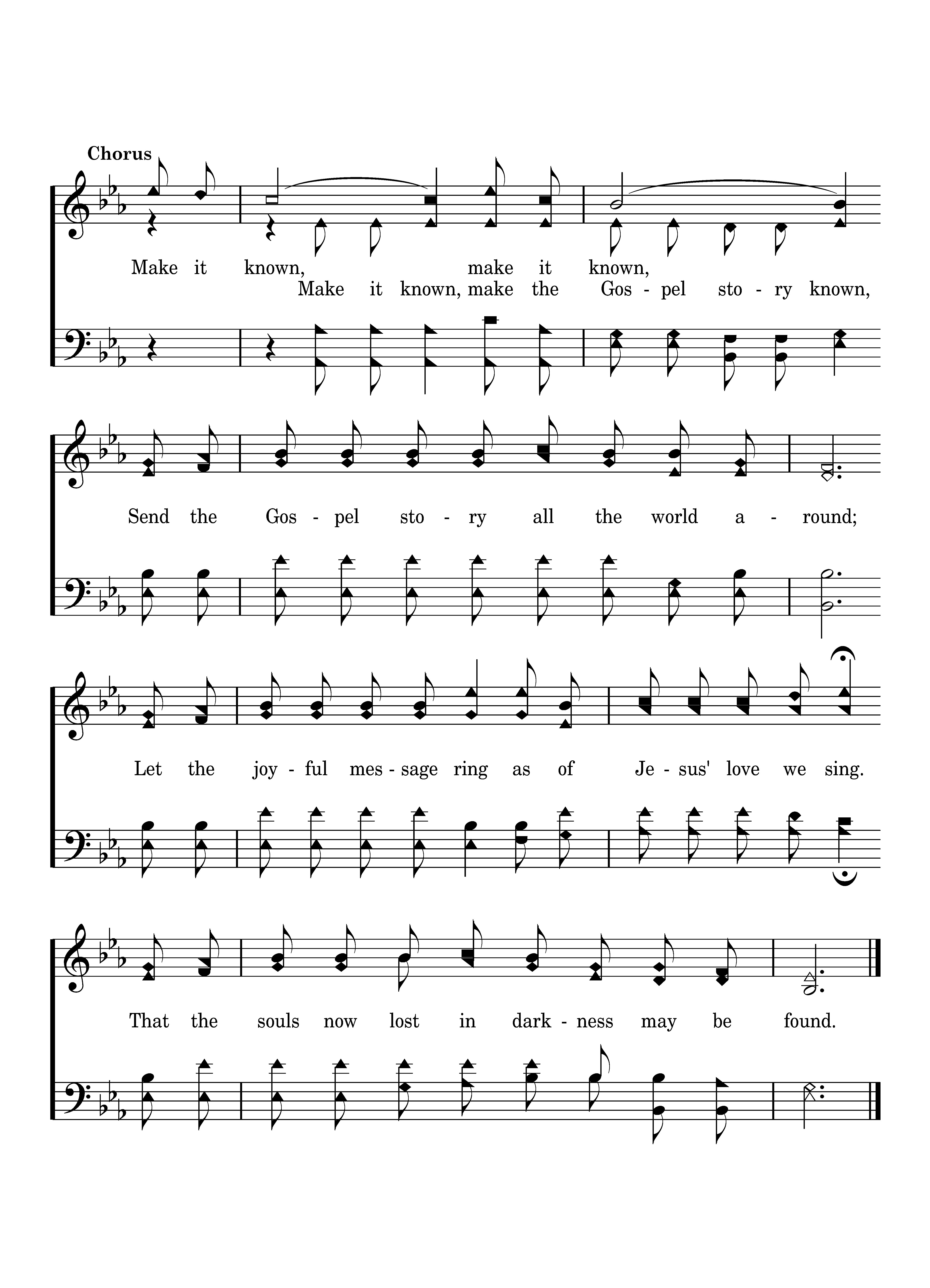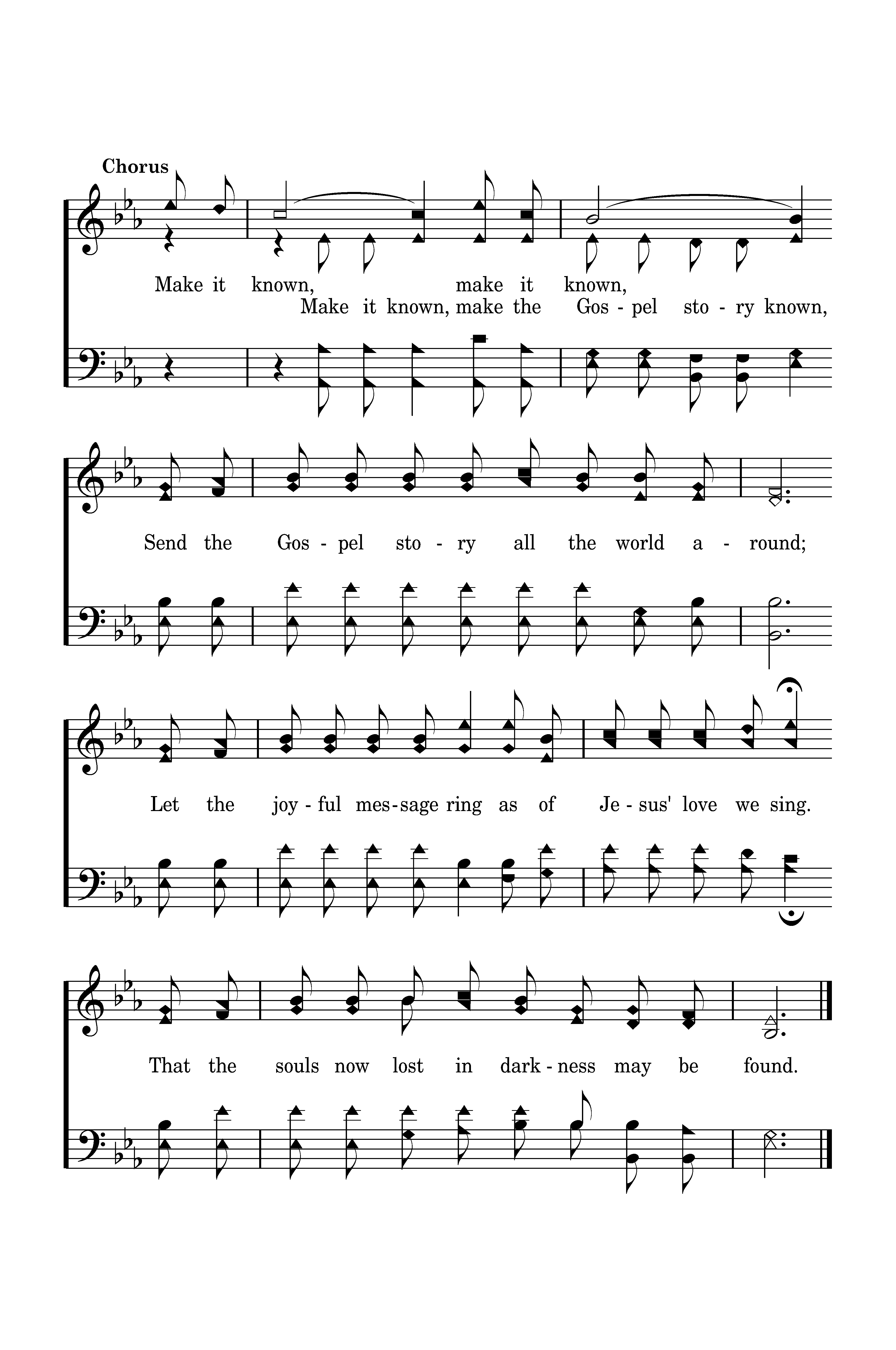 Make it known, make it known, Send the Gospel story all the world around; Let the joyful message ring as of Jesus' love we sing. That the souls now lost in darkness may be found.