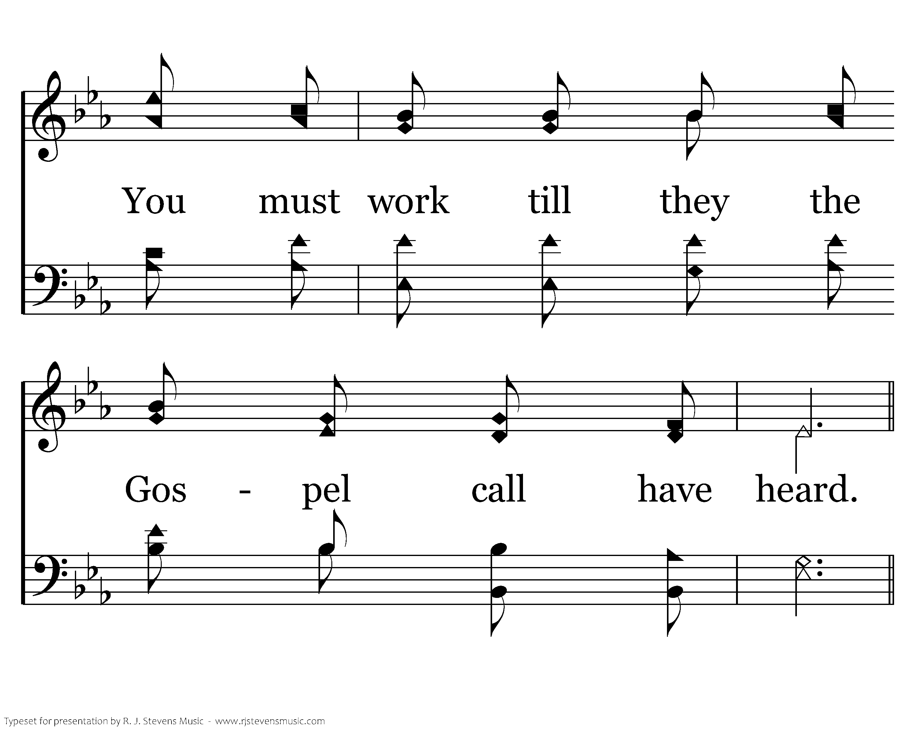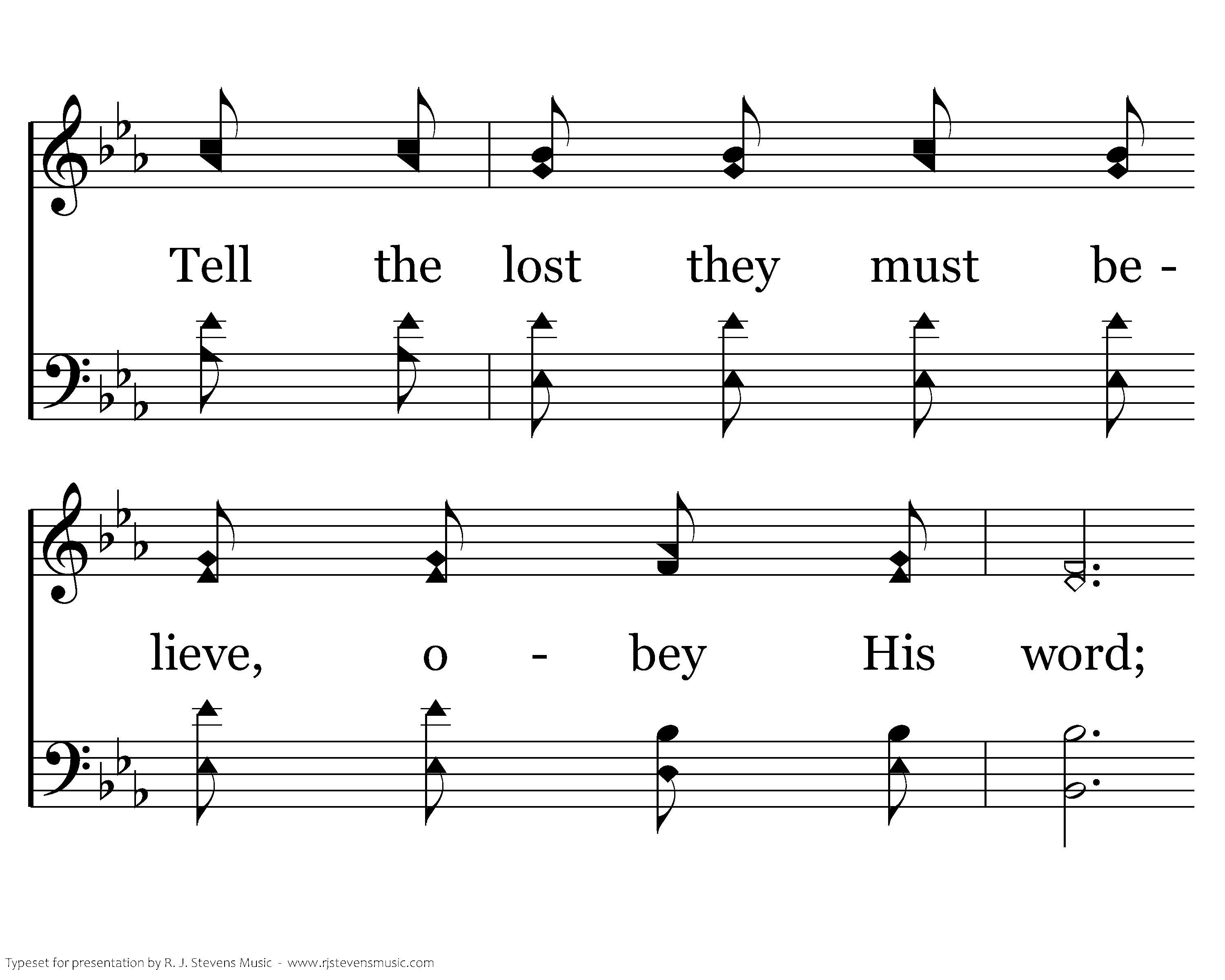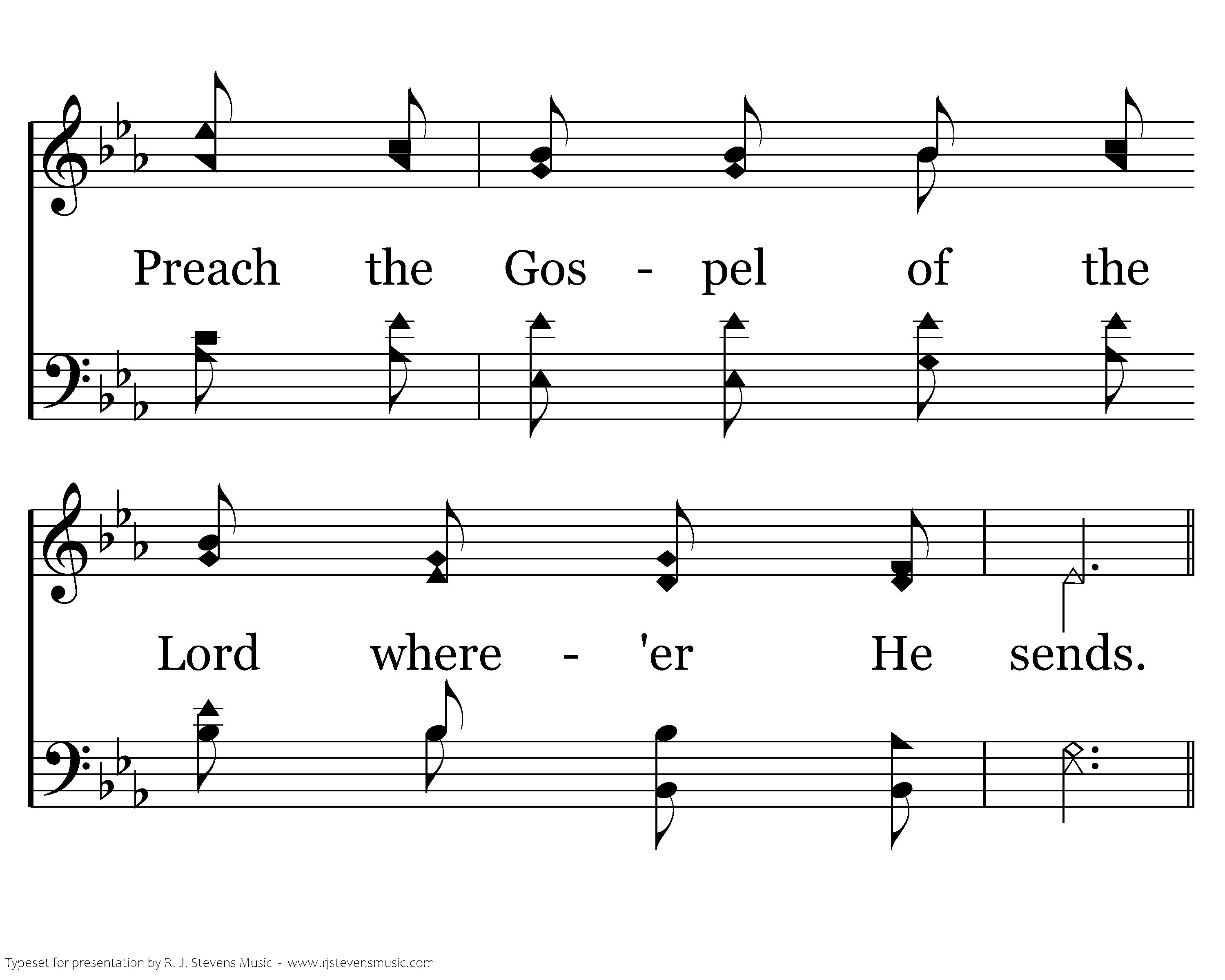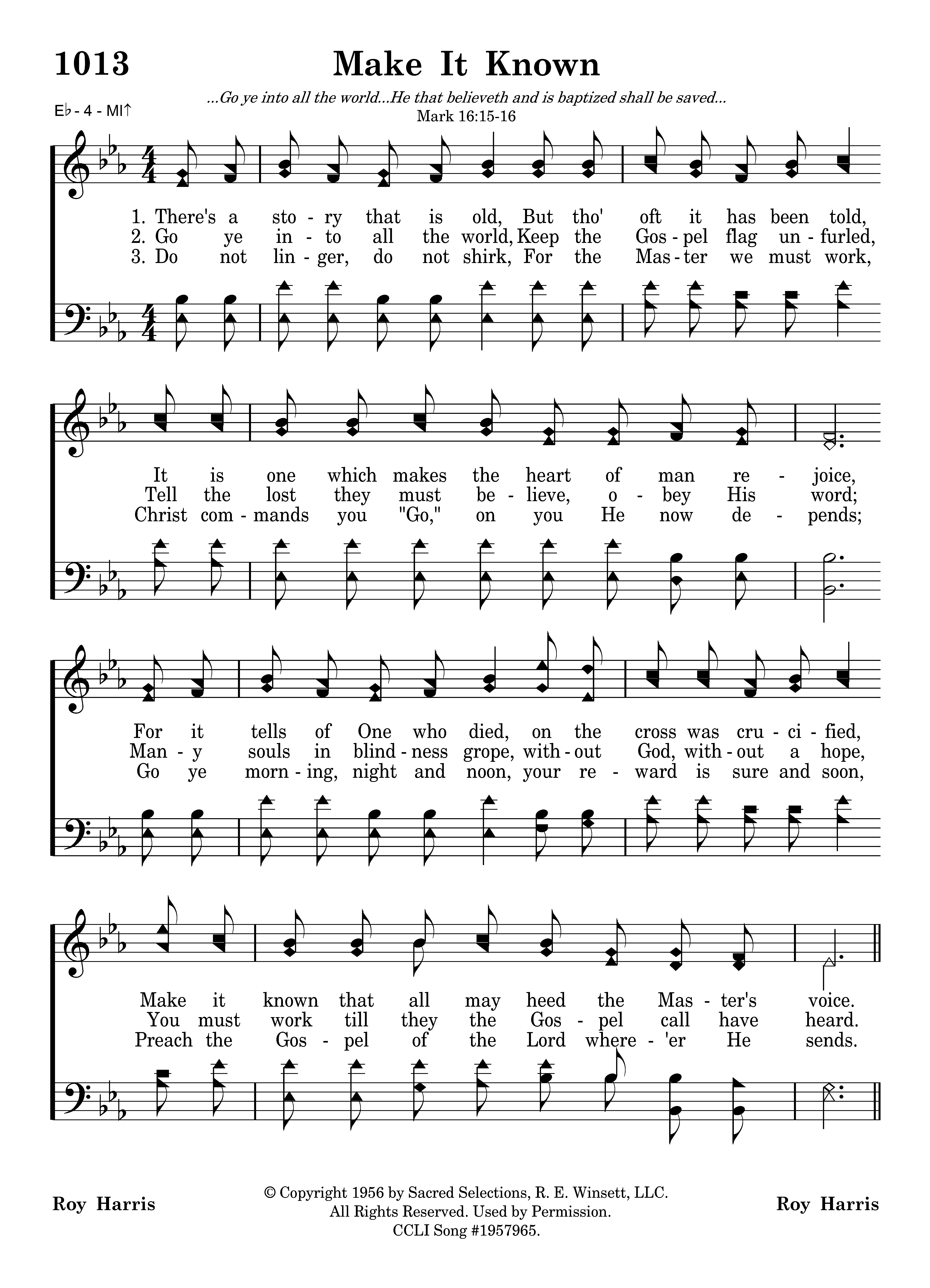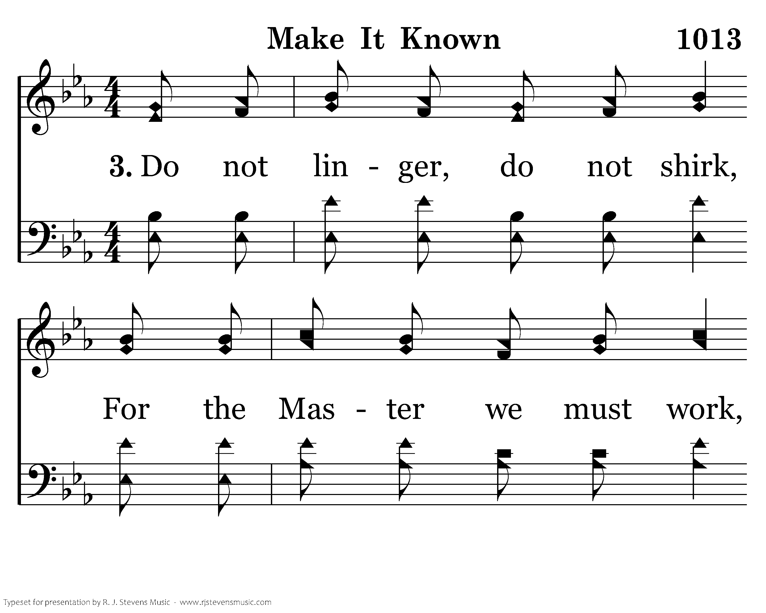 Make it known, make it known, Send the Gospel story all the world around; Let the joyful message ring as of Jesus' love we sing. That the souls now lost in darkness may be found.