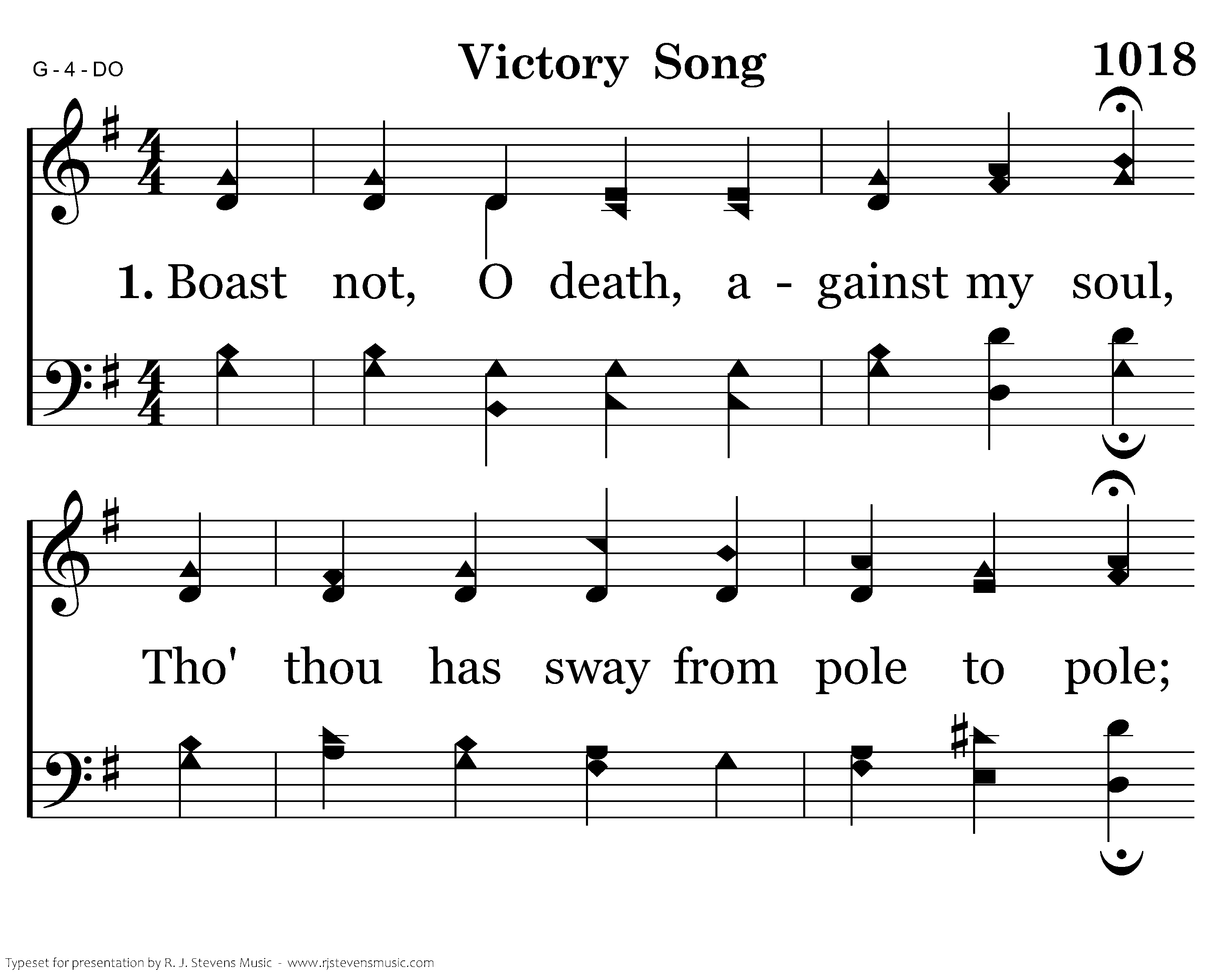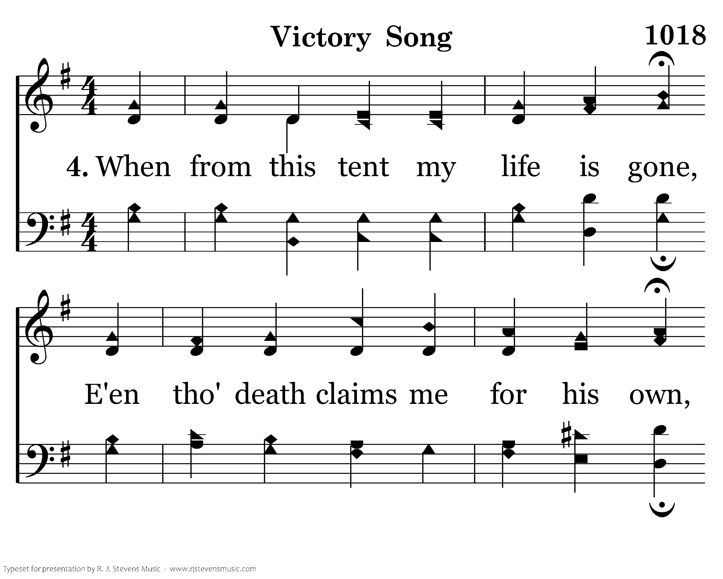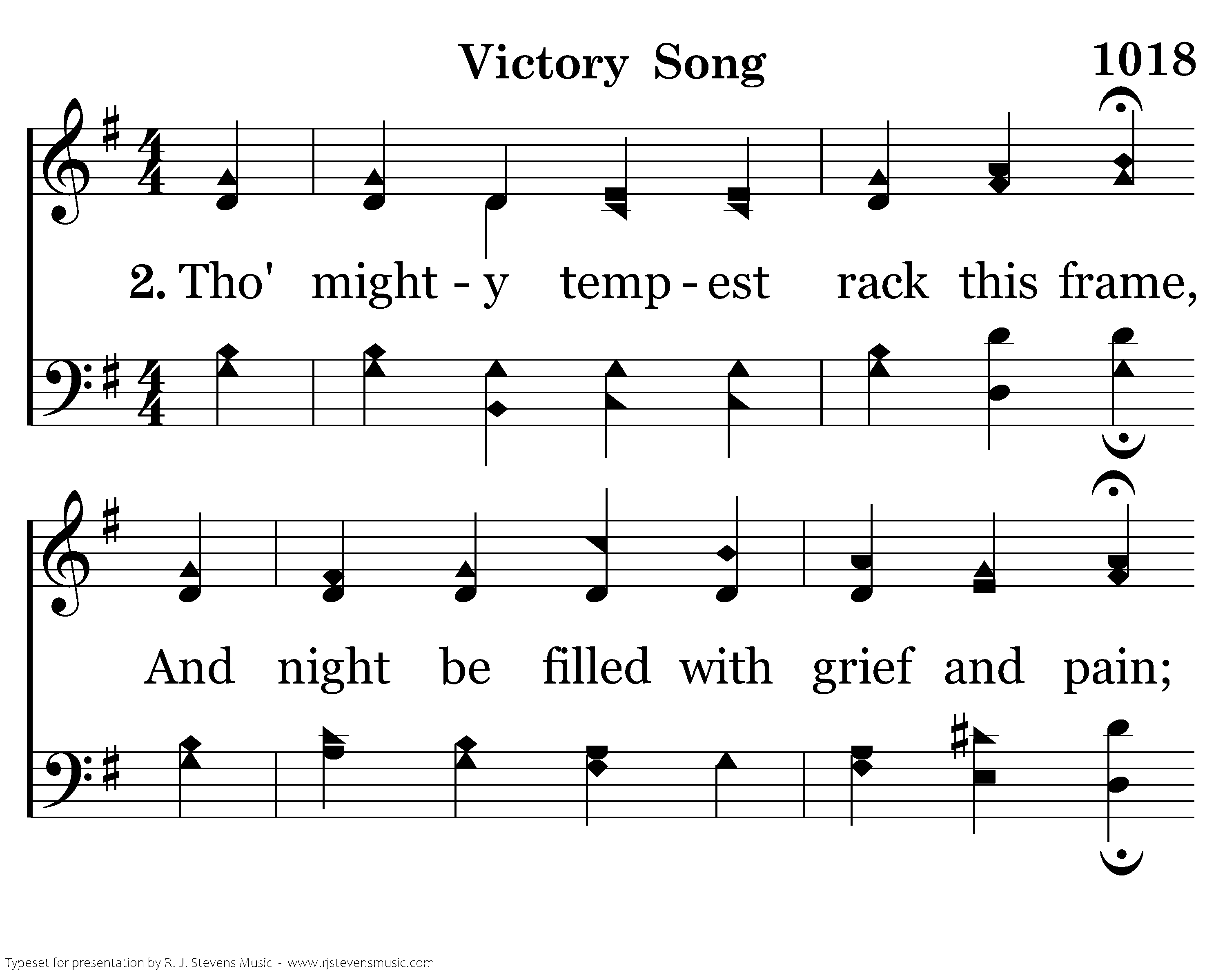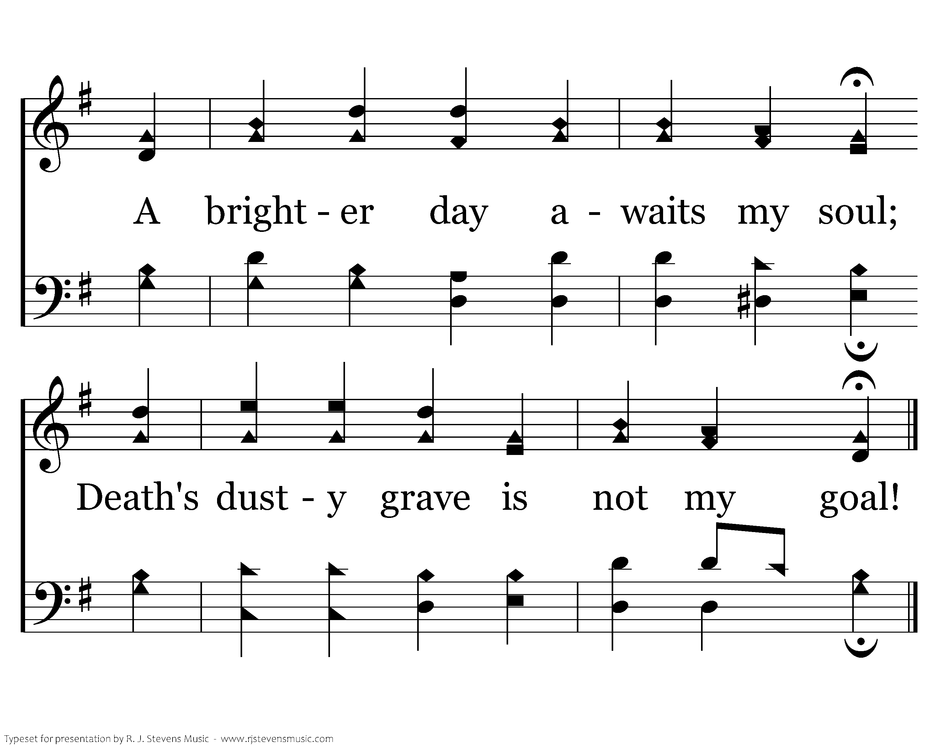 Tho' mighty tempest rack this frame, And night be filled with grief and pain; A brighter day awaits my soul; Death's dusty grave is not my goal!