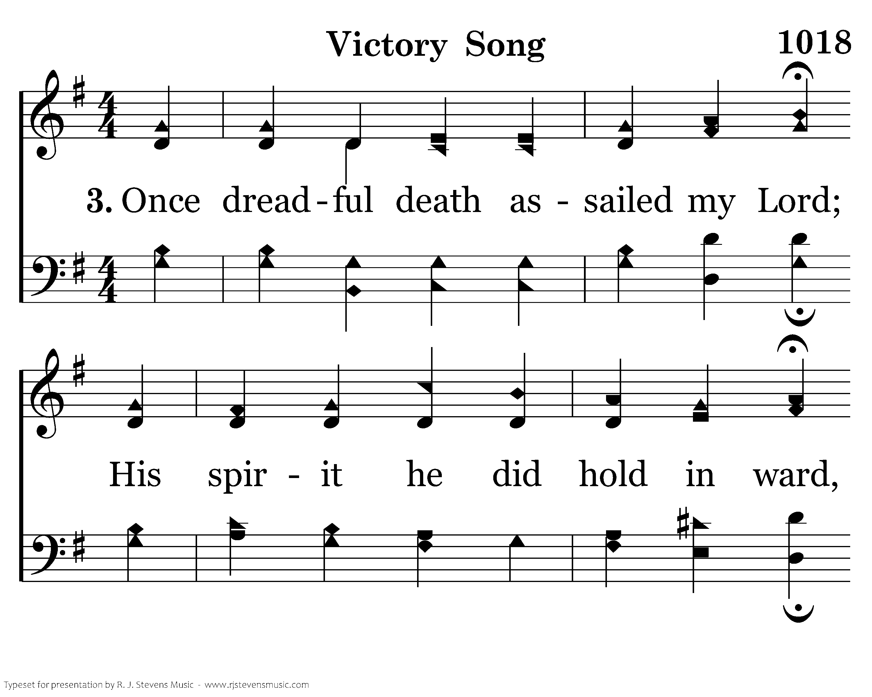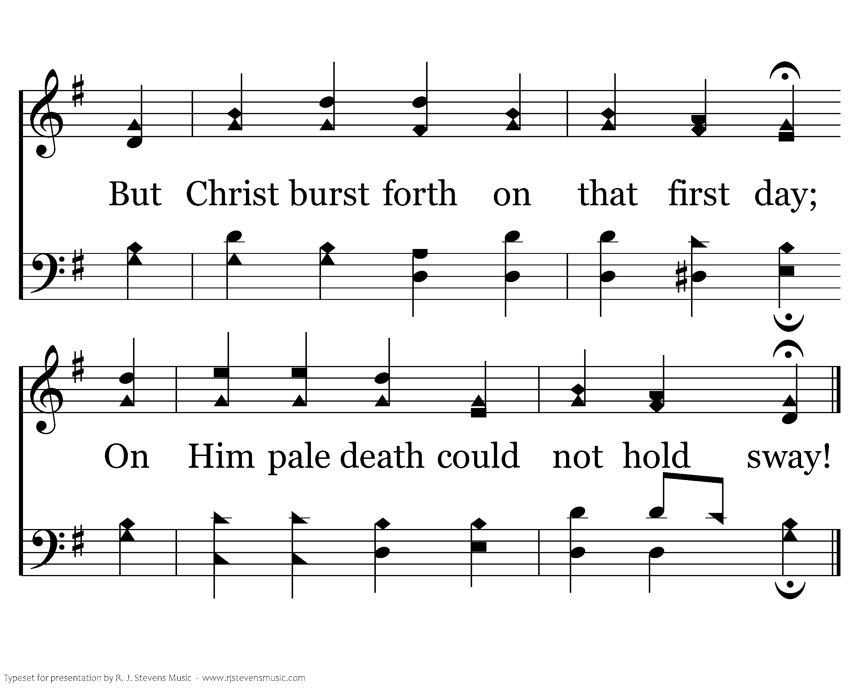 Once dreadful death assailed my Lord; His spirit he did hold in ward, But Christ burst forth on that first day; On Him pale death could not hold sway!