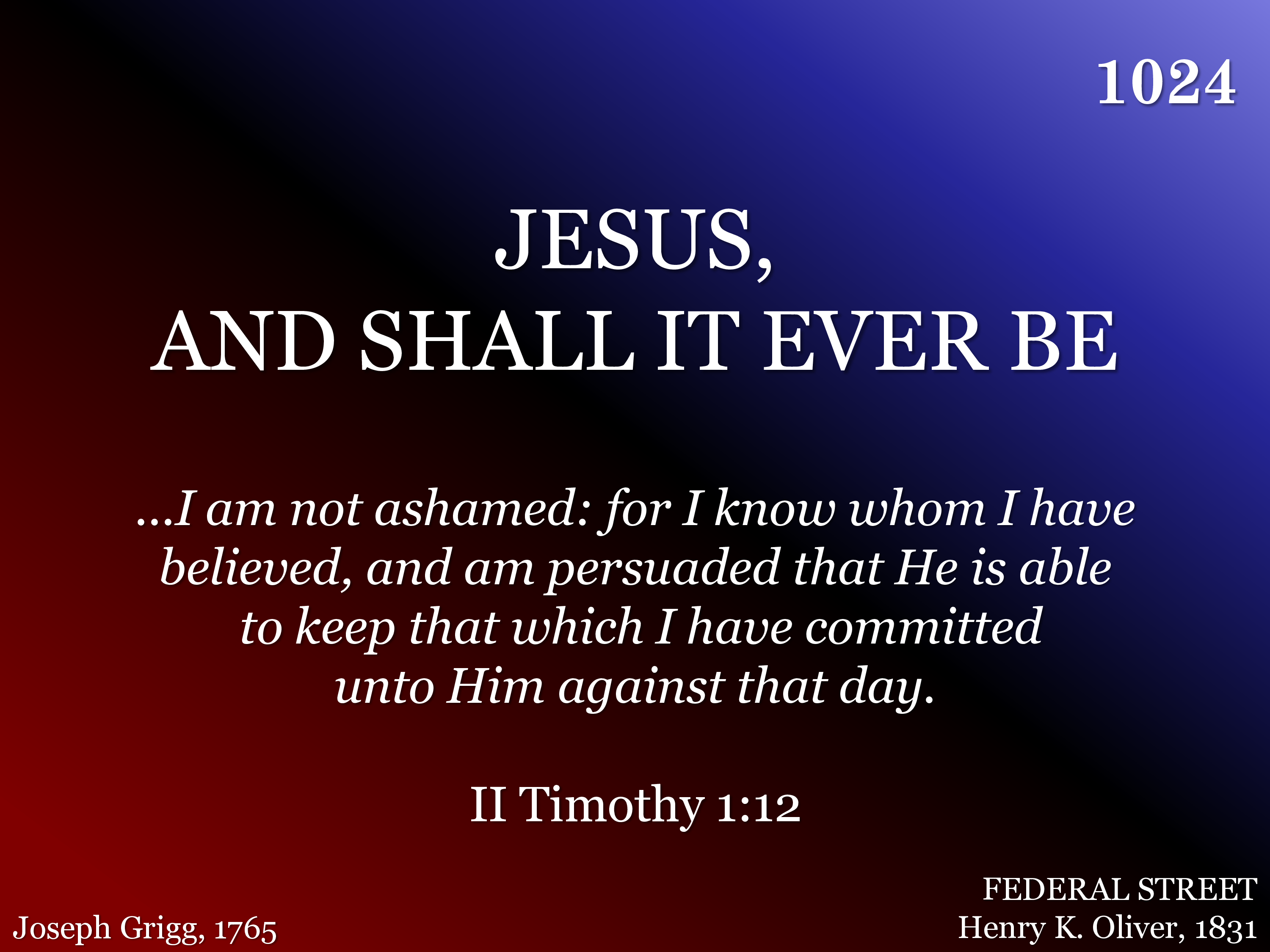 Jesus, and shall it ever be A mortal man ashamed of Thee? Ashamed of Thee, whom angels praise, Whose glories shine thru endless days?