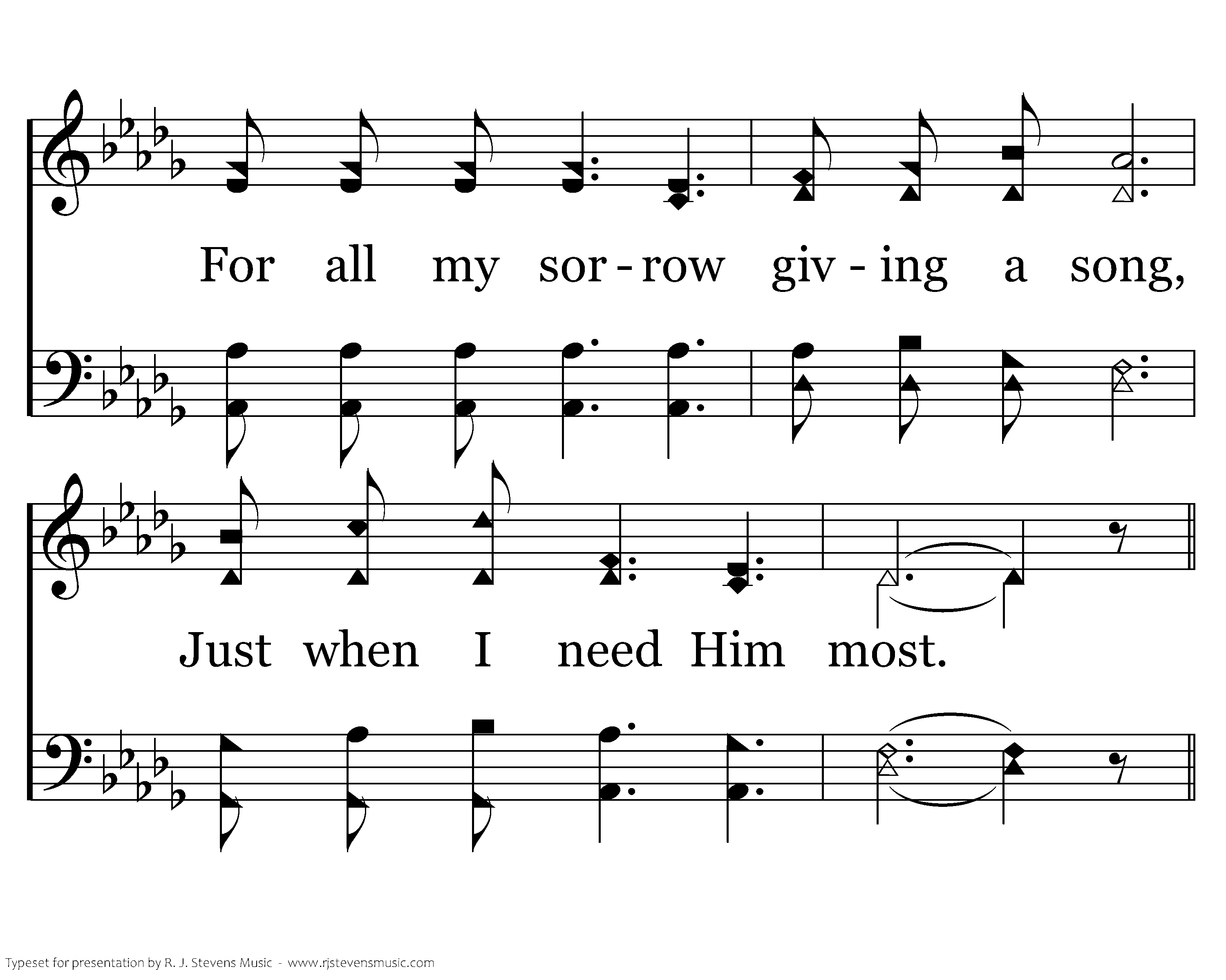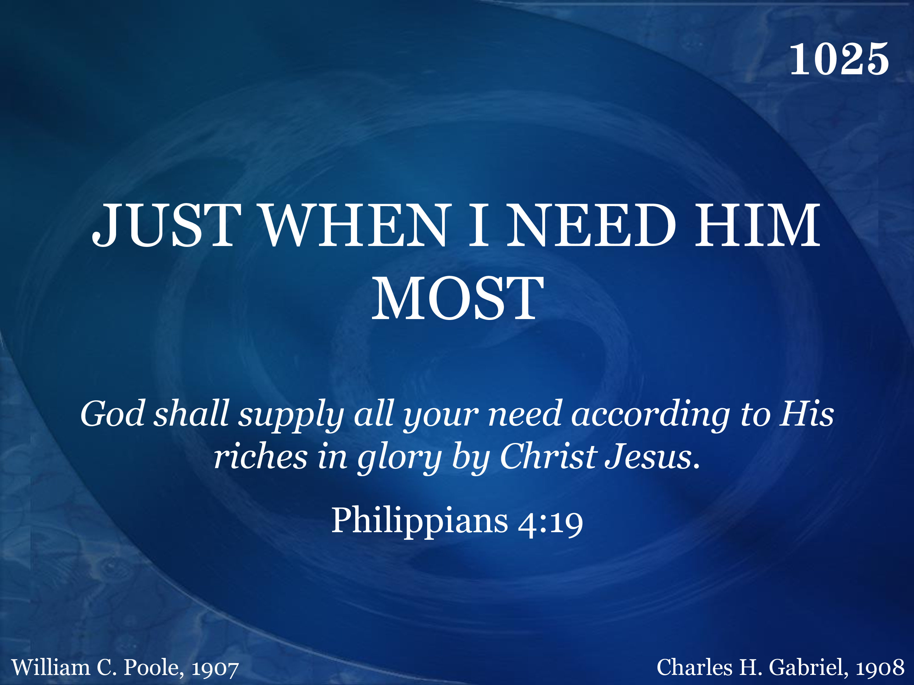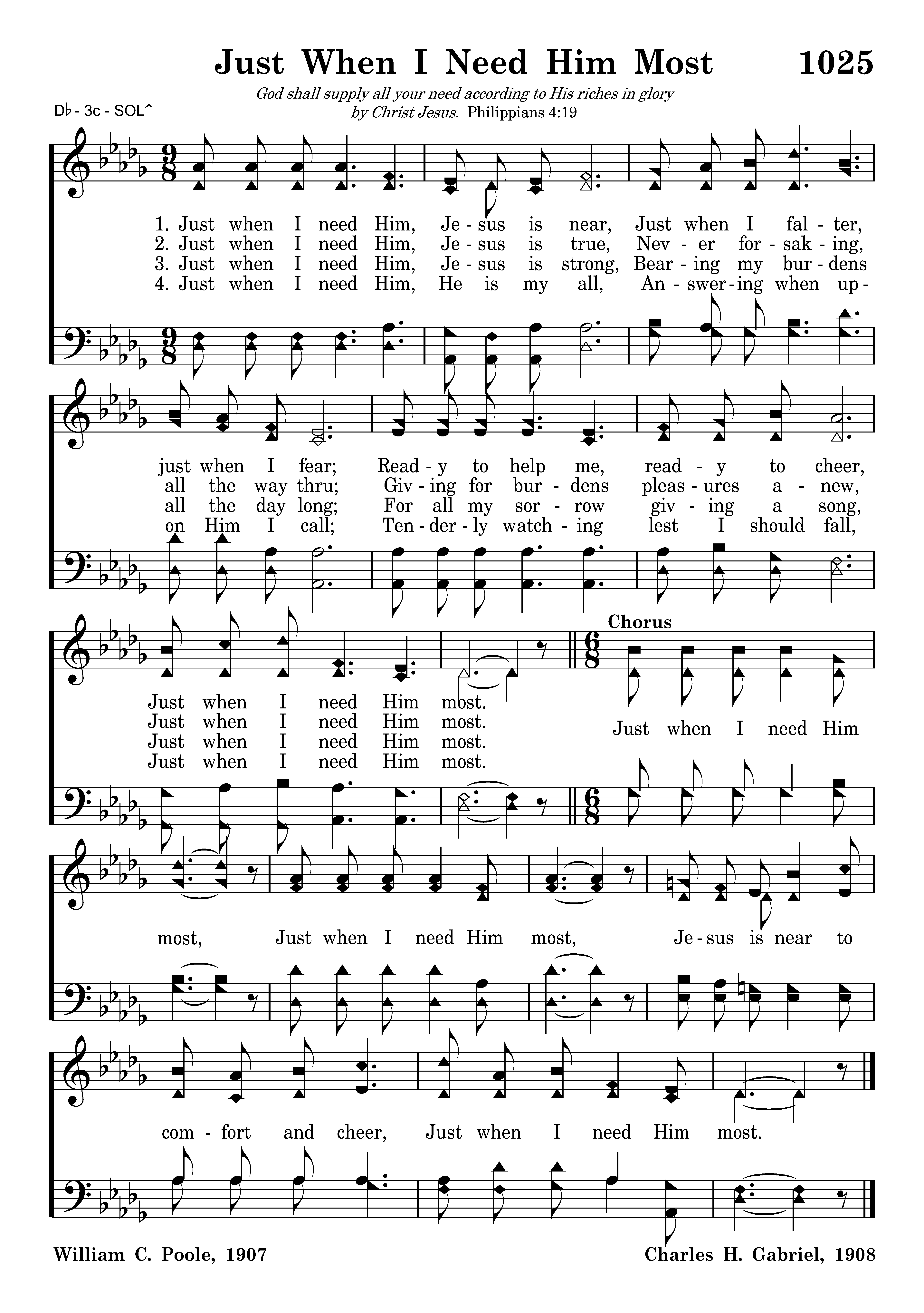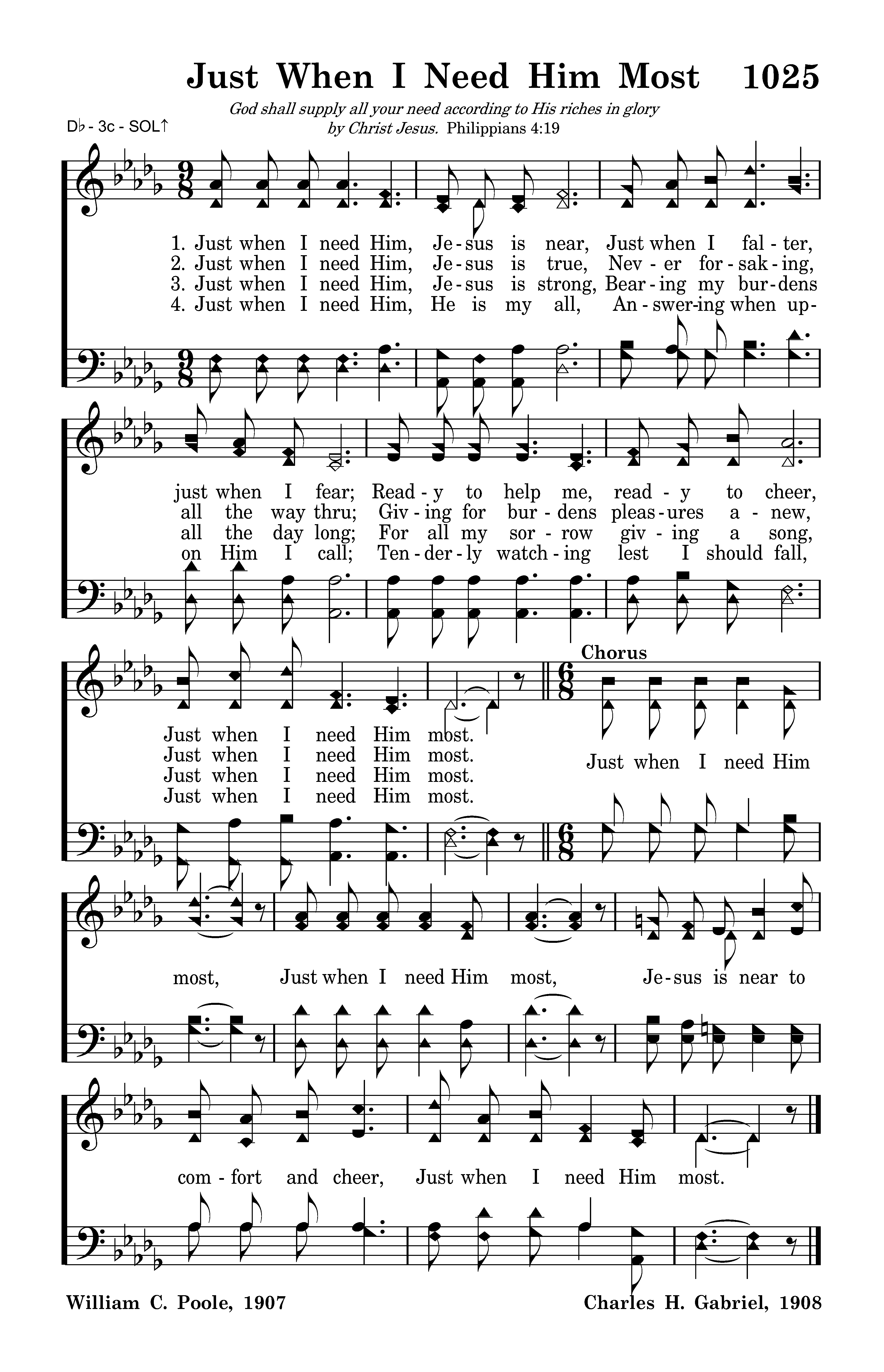 Just when I need Him, Jesus is strong, Bearing my burdens all the day long; For all my sorrow giving a song, Just when I need Him most.