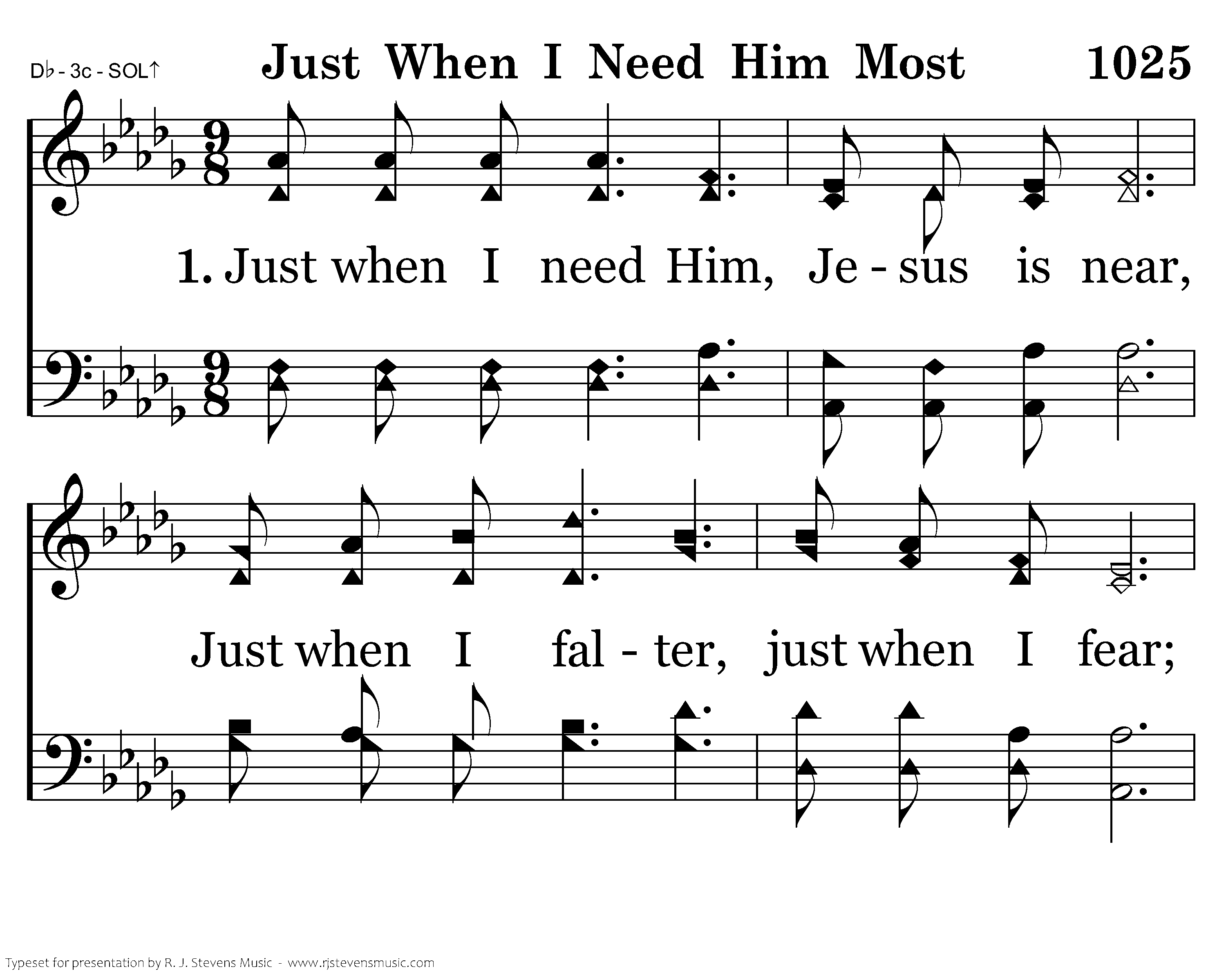 Just when I need Him, Jesus is near, Just when I falter, just when I fear; Ready to help me, ready to cheer, Just when I need Him most.