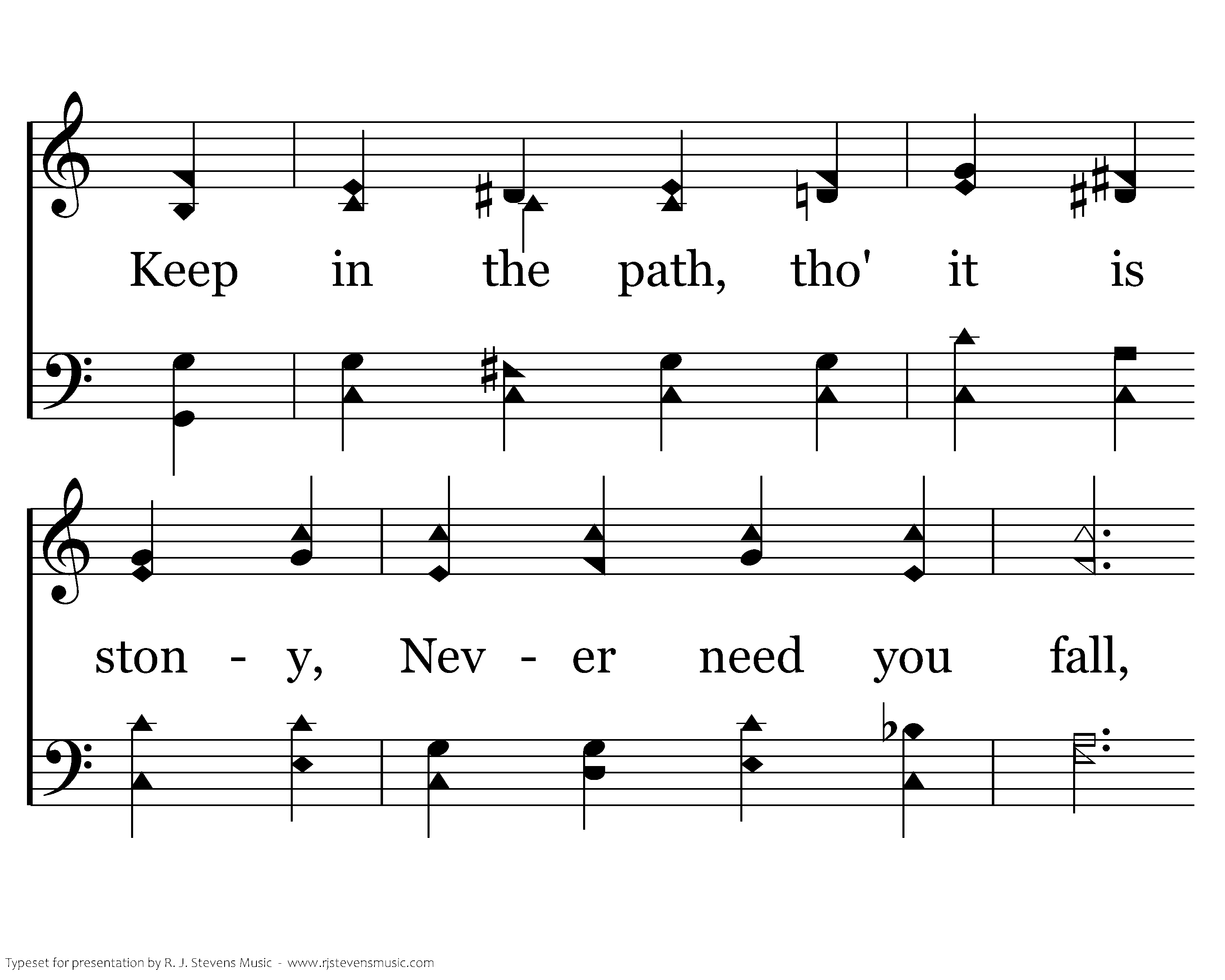 Like a lamp unto your feet, The light makes plain the way, Turning not aside where shadows linger, Lest afar you stray; Keep in the path, tho' it is stony, Never need you fall, Ever walk, safely walk, In the light that shines for all.