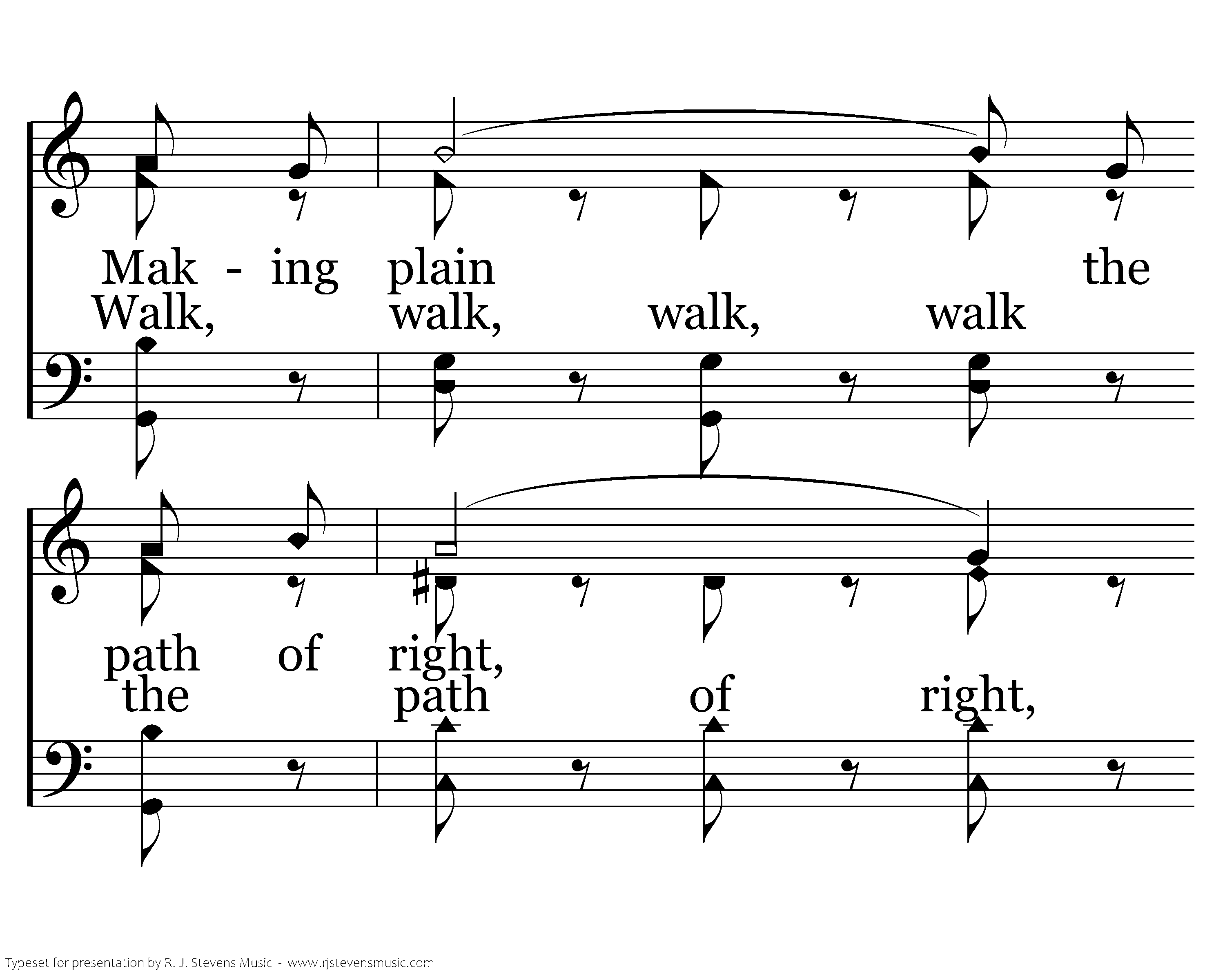 O walk, walk, walk in the light of God; In the light, the perfect light, Making plain the path of right, Walk in faith, walk in trust Up the slope where saints have trod; Keep the narrow way, Leading on to endless day, Walk in hope, walk in peace, In the perfect light of God.