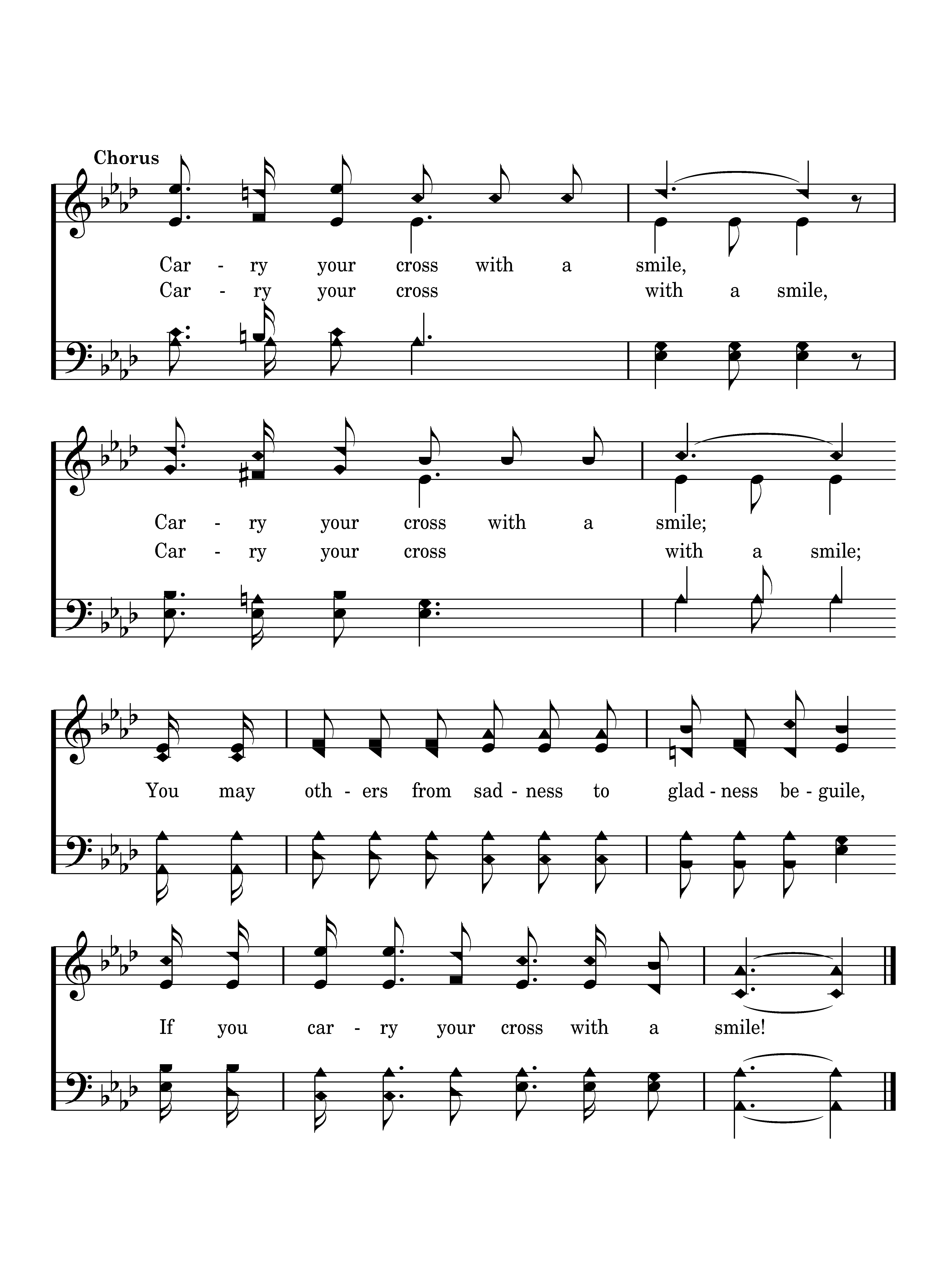 Carry your cross with a smile, Carry your cross with a smile; You may others from sadness to gladness beguile, If you carry your cross with a smile!