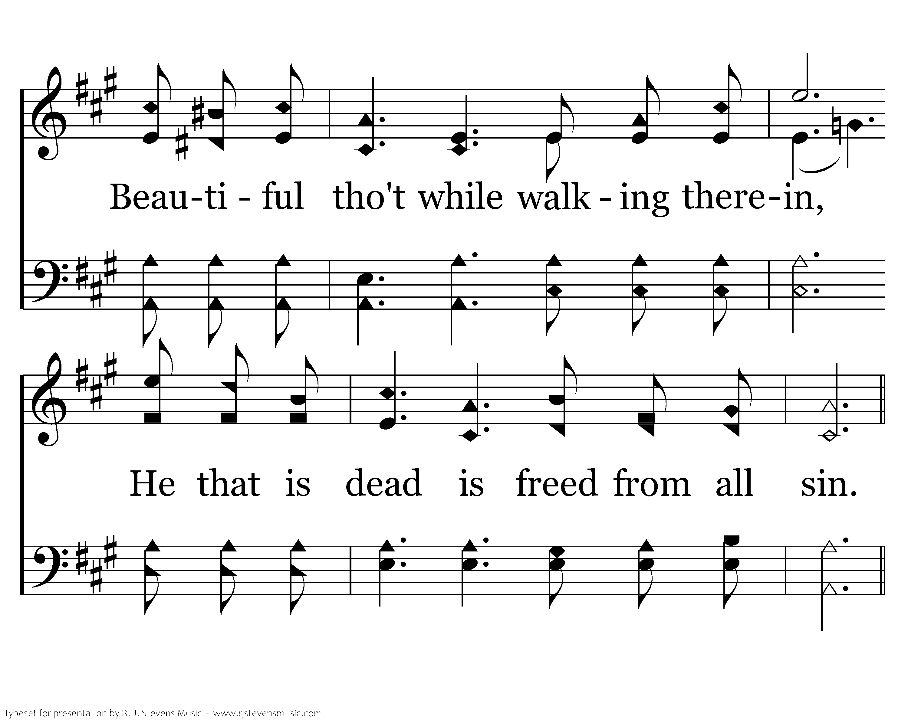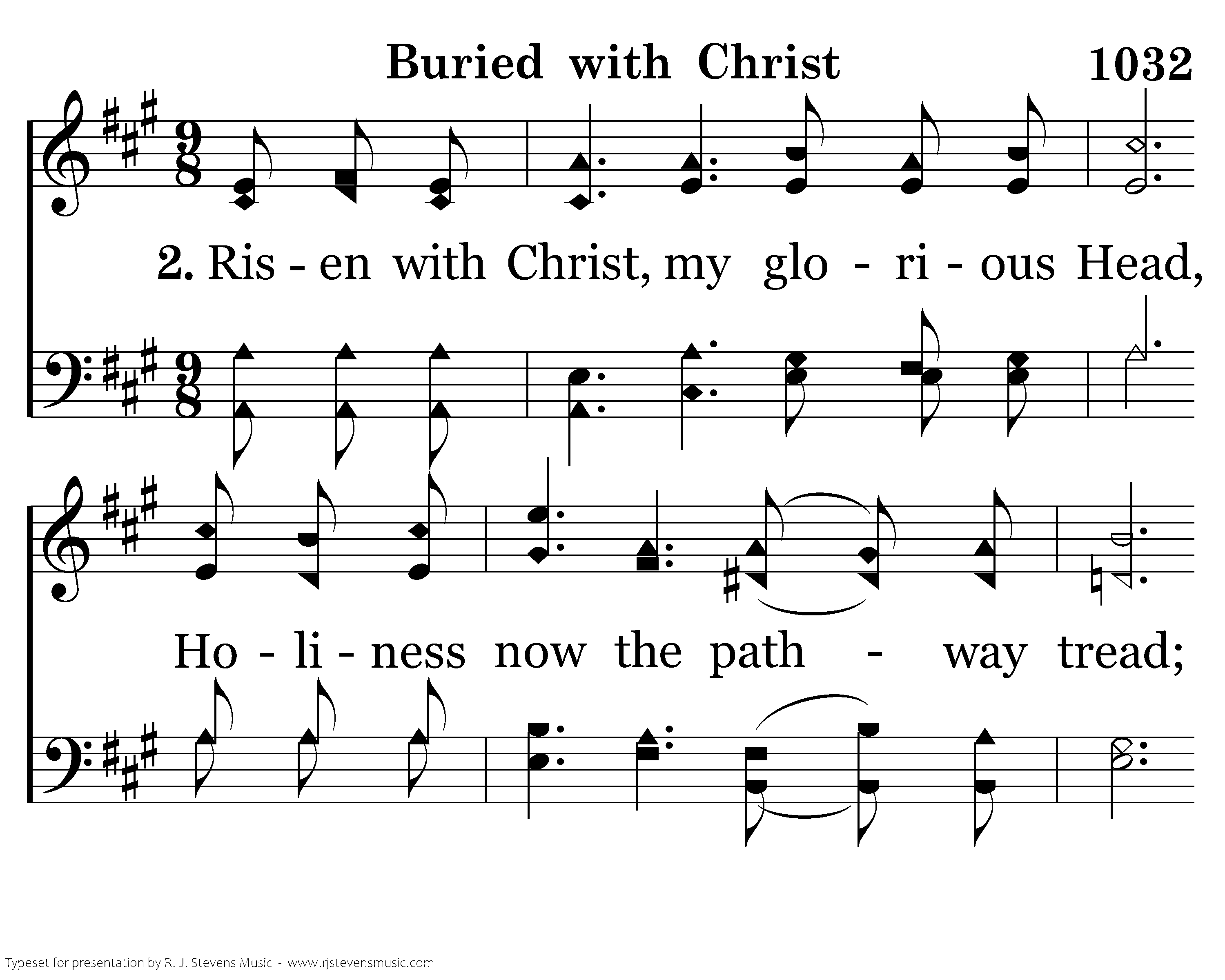 Risen with Christ, my glorious Head, Holiness now the pathway tread; Beautiful tho't while walking therein, He that is dead is freed from all sin.