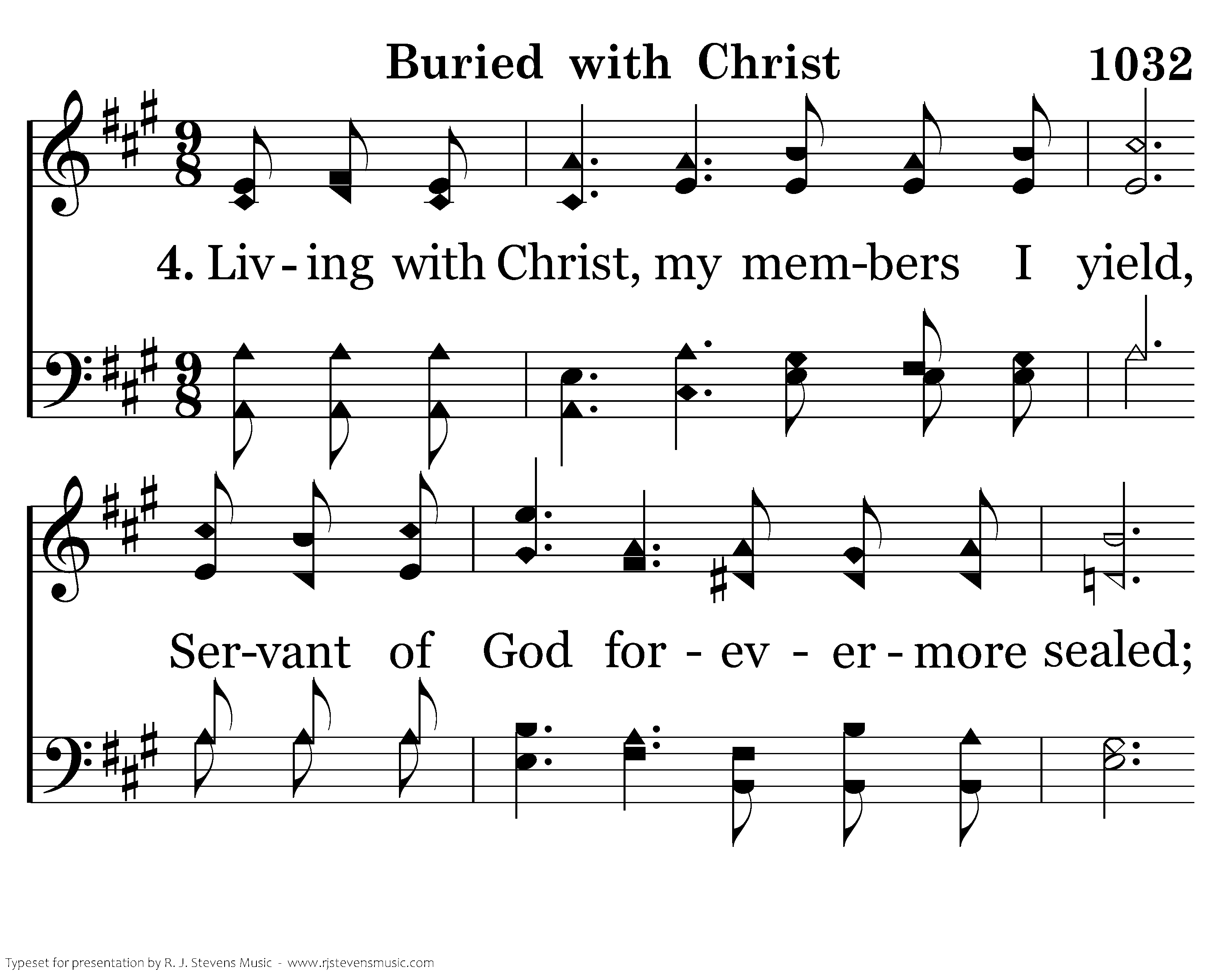 Living with Christ, Who dieth no more, Following Christ, who goeth before; I am from bondage utterly freed, Reckoning self as dead indeed.