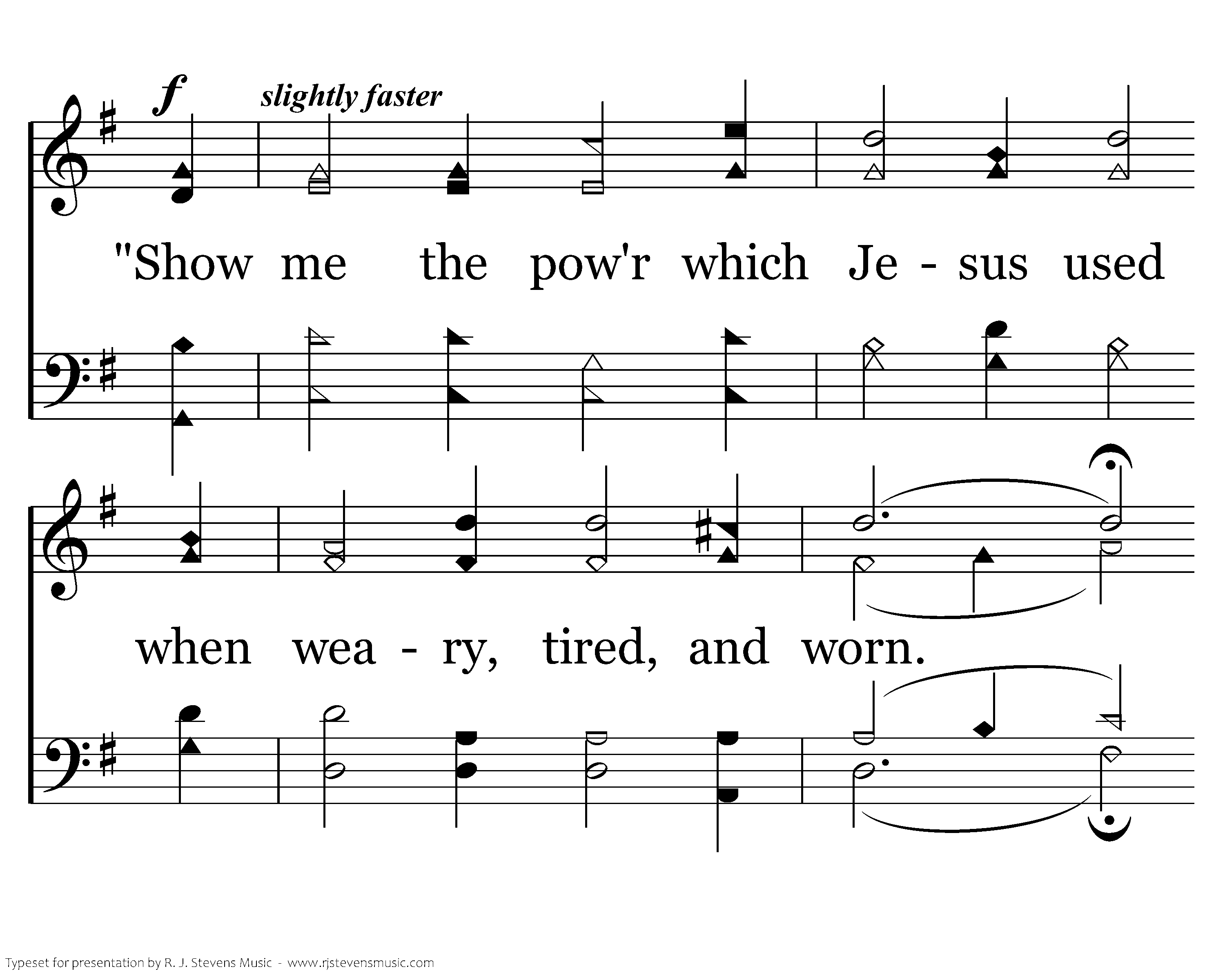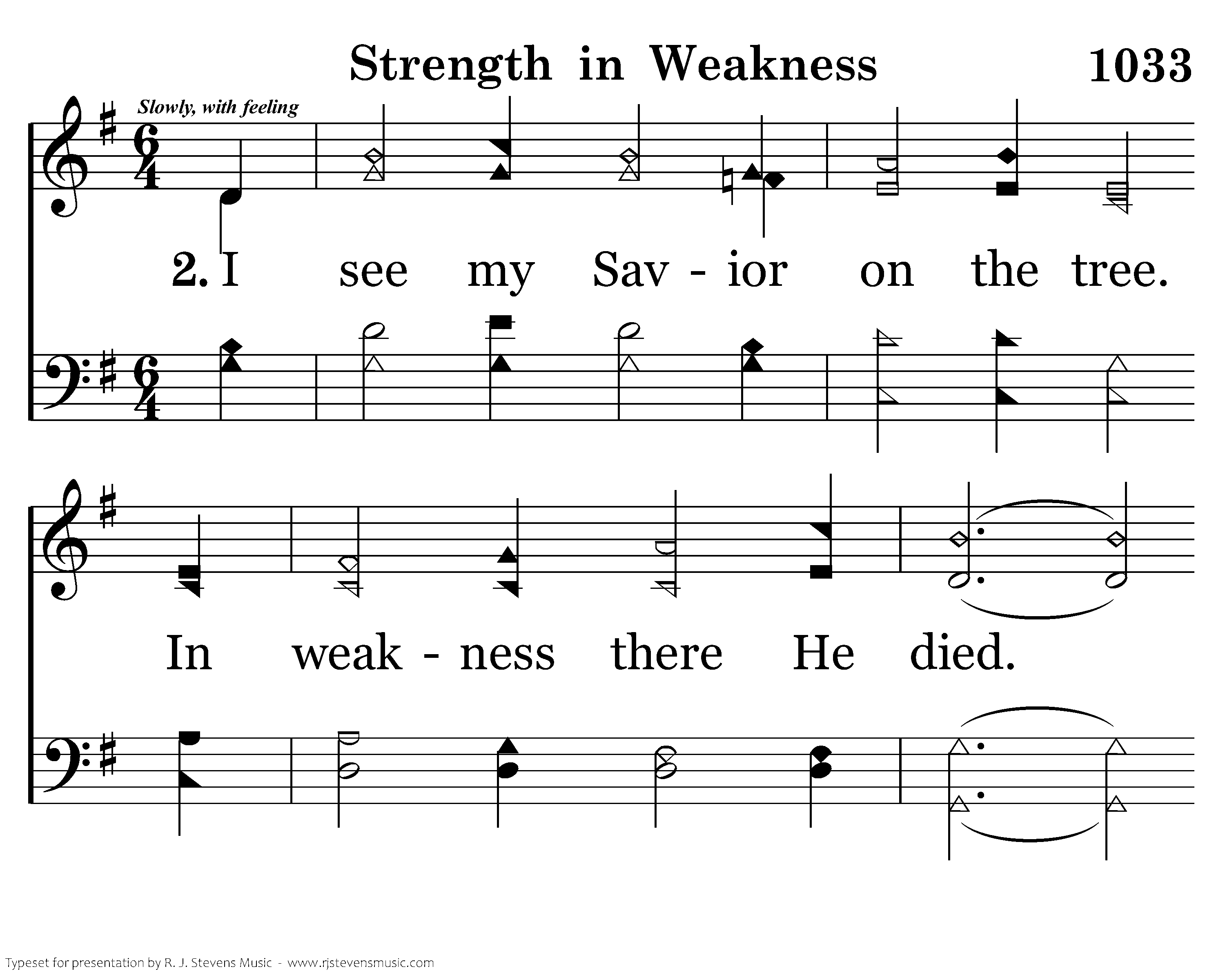 I see my Savior on the tree. In weakness there He died. But in that hour He bore my sins that I might e'er abide. "Show me the pow'r which Jesus used when weary, tired, and worn. Help me in weakness and in strife His strength e'er to adorn."