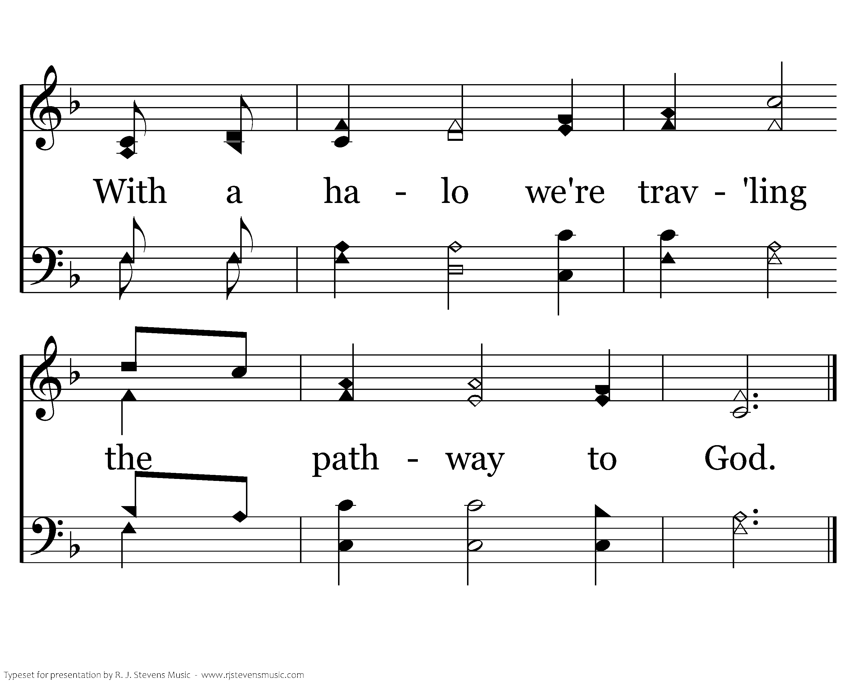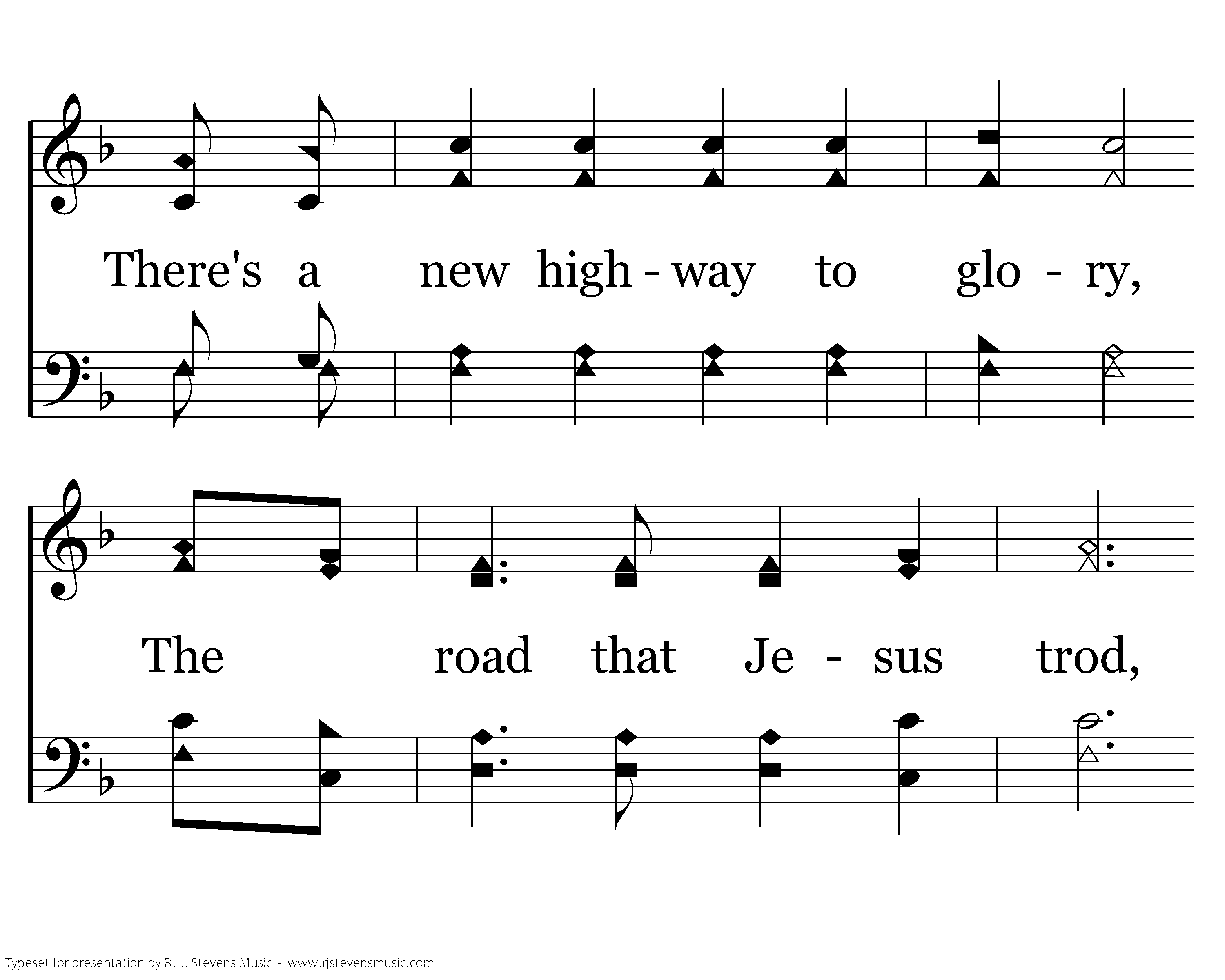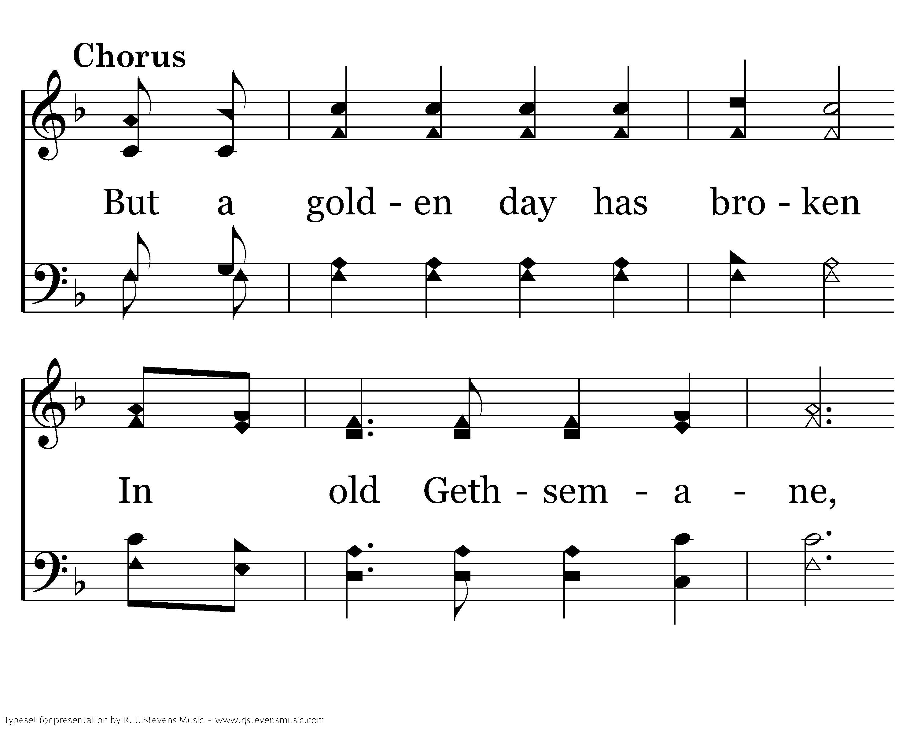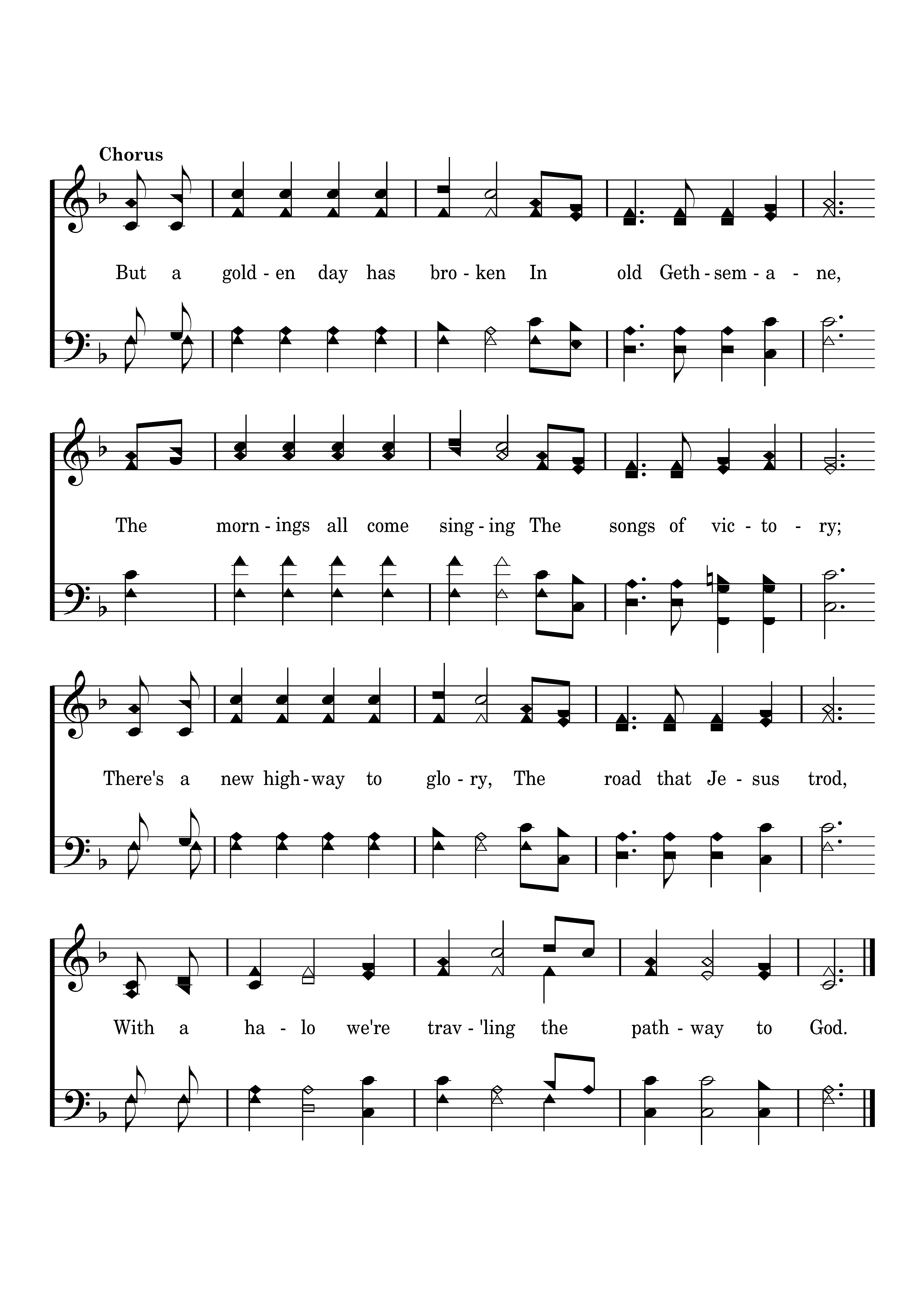 But a golden day has broken In old Gethsemane, The mornings all come singing The songs of victory; There's a new highway to glory, The road that Jesus trod, With a halo we're trav'ling the pathway to God.