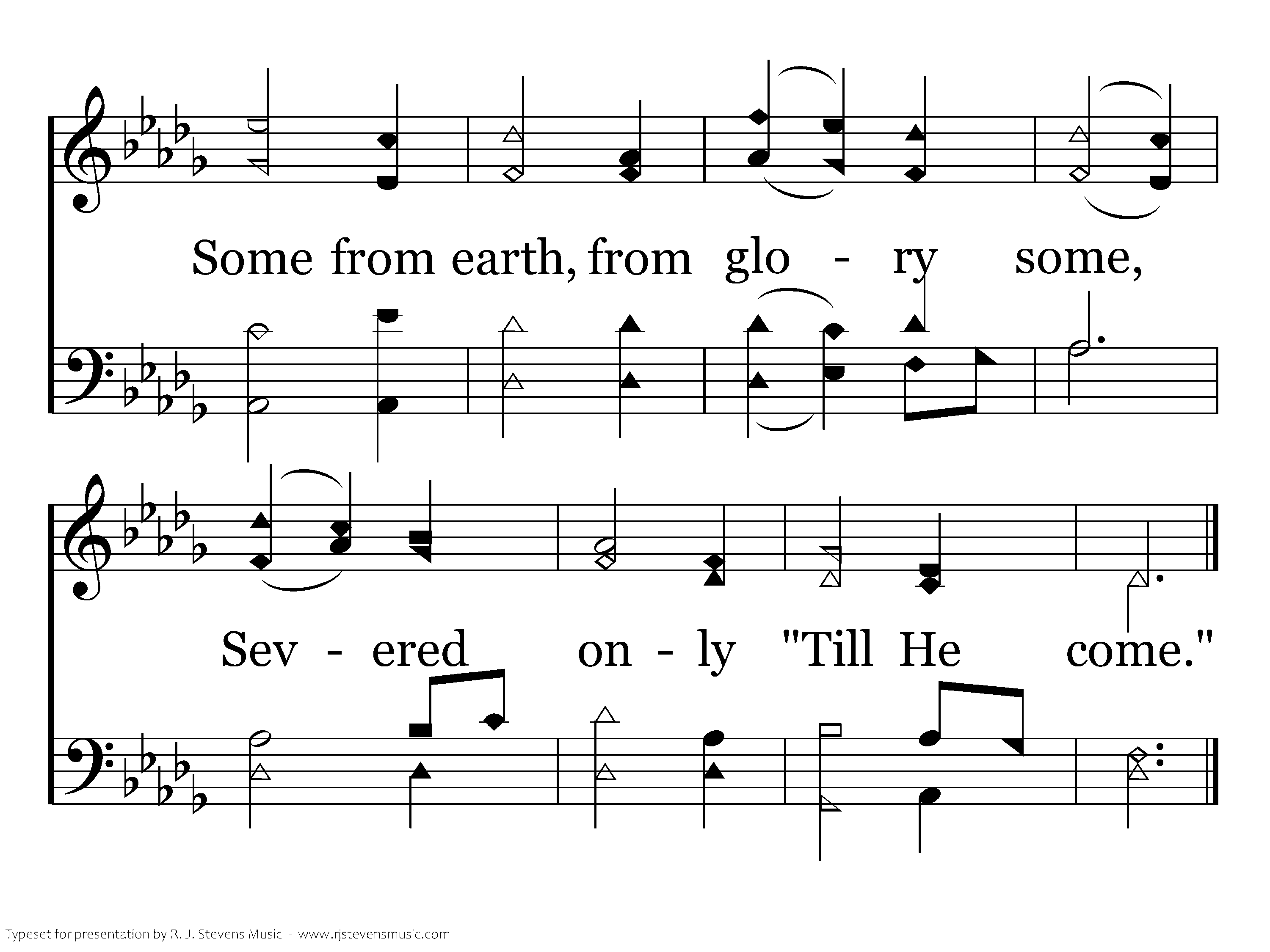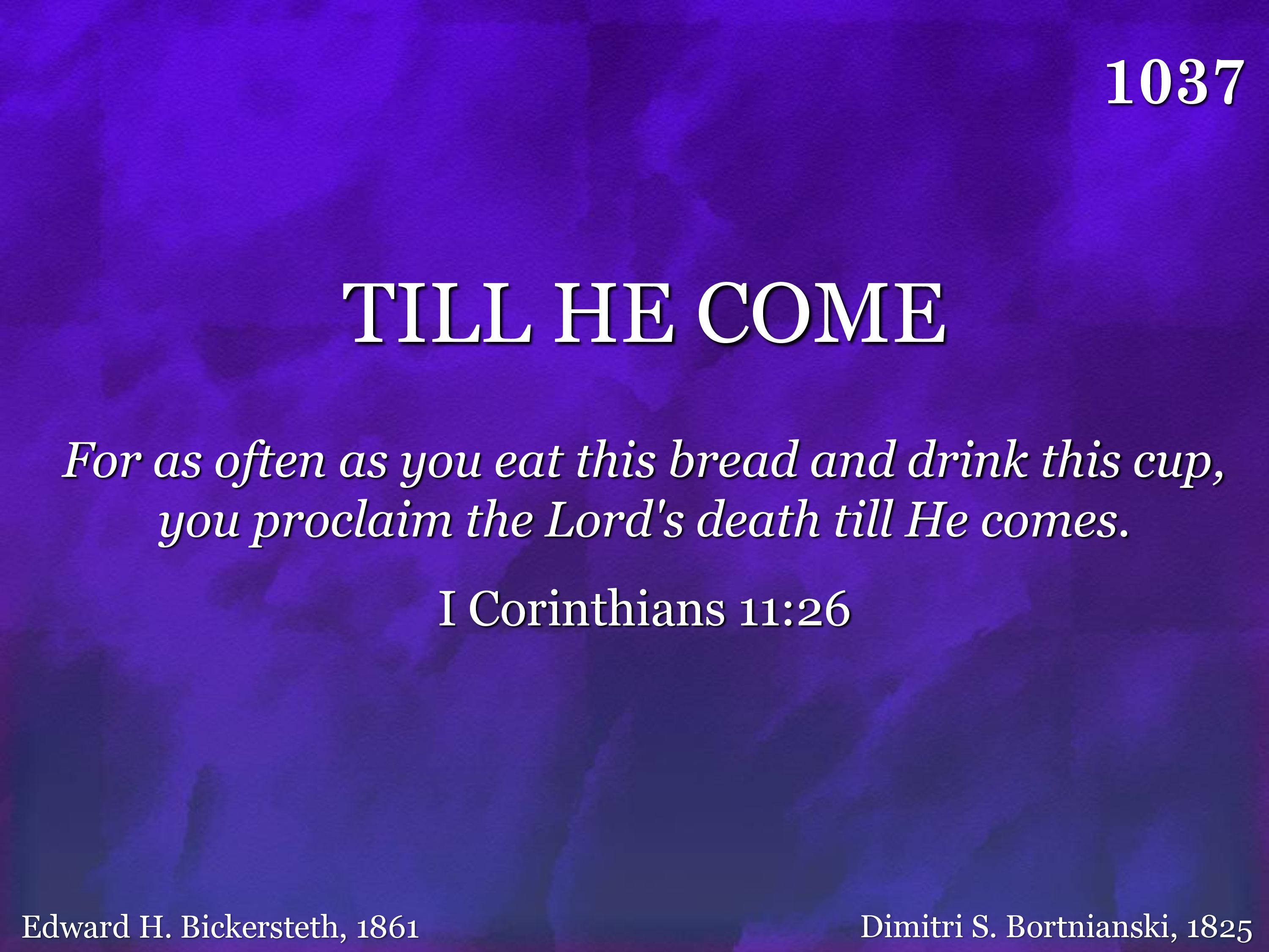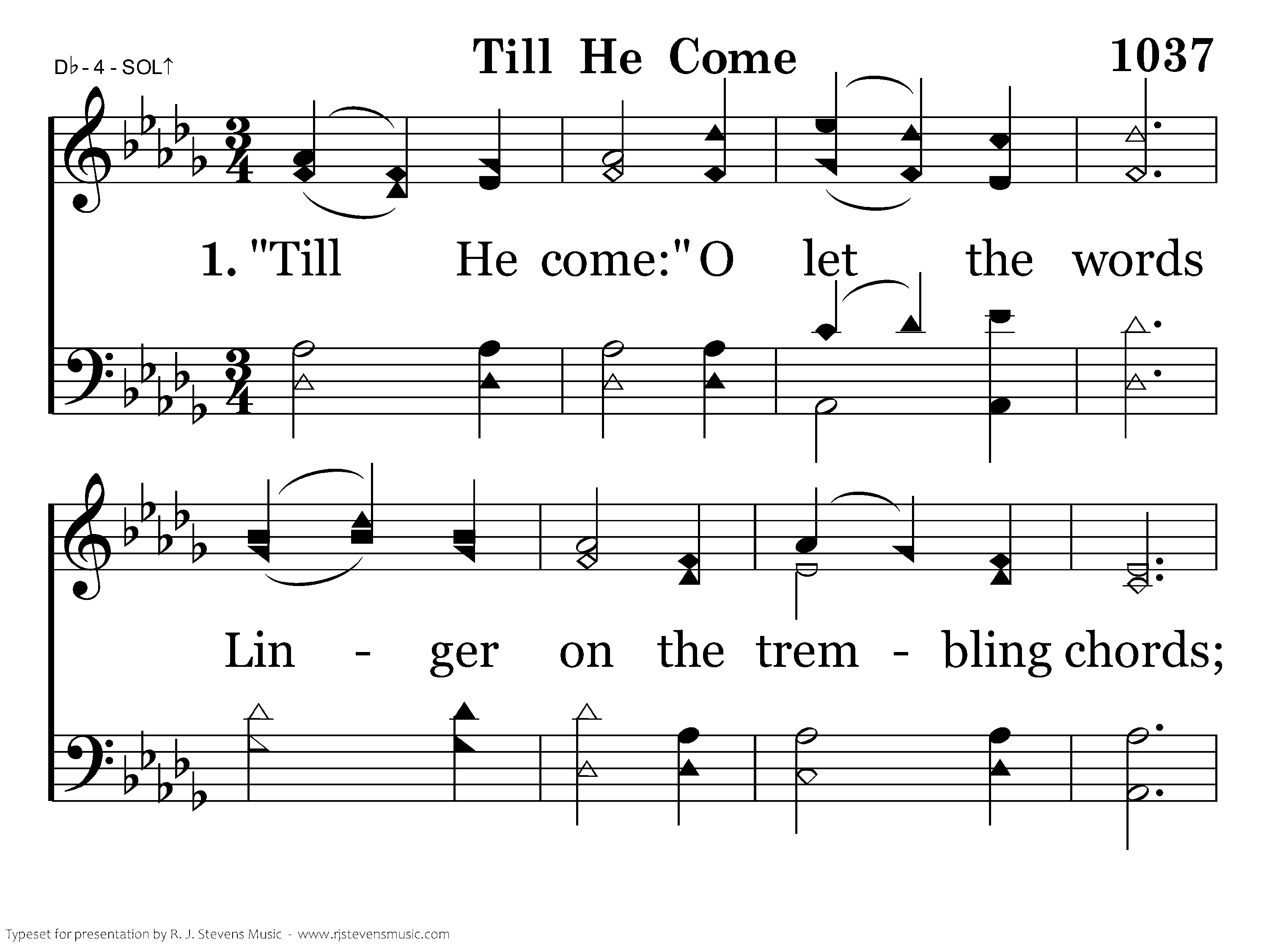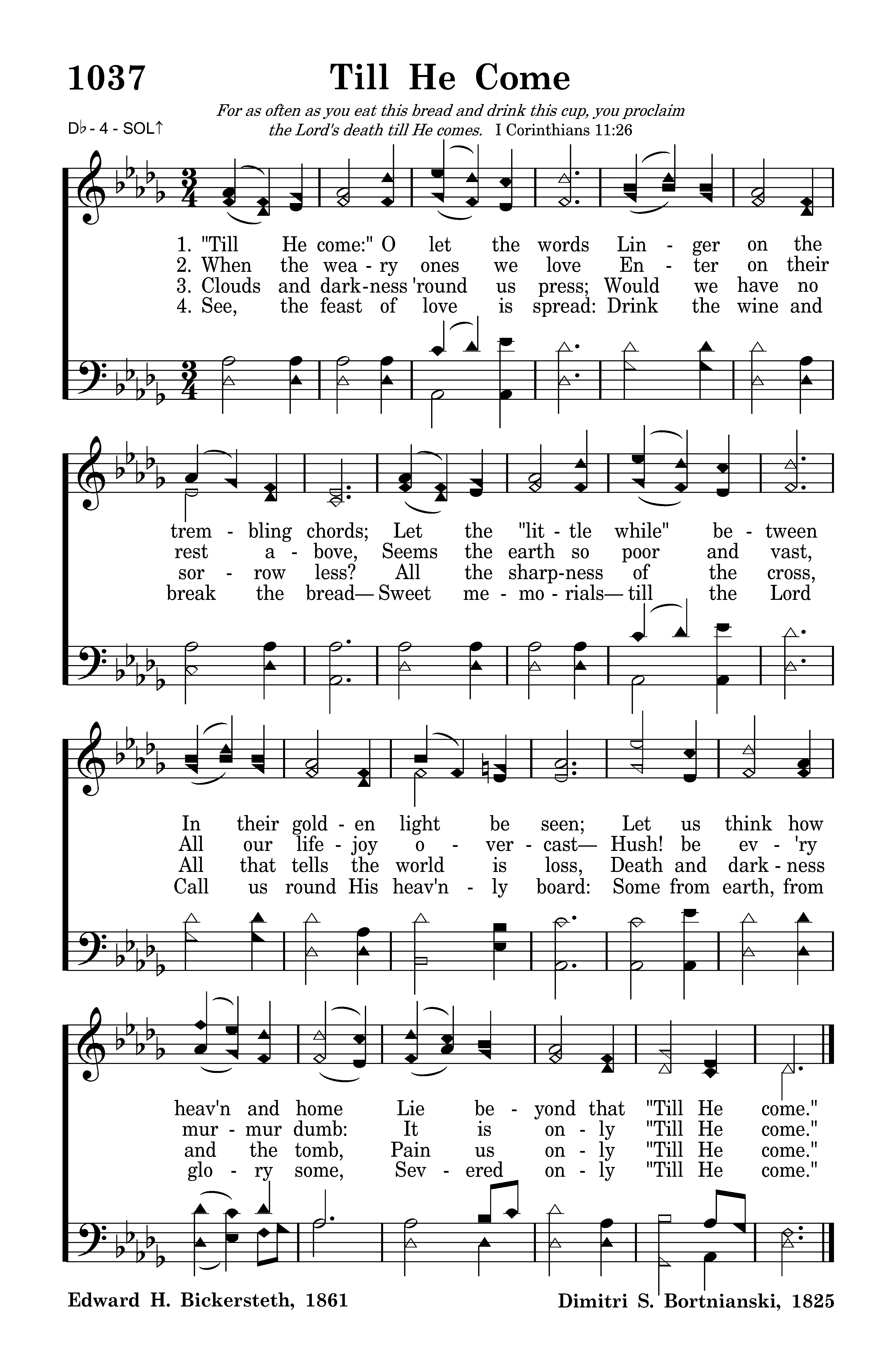 "Till He come:" O let the words Linger on the trembling chords; Let the "little while" between In their golden light be seen; Let us think how heav'n and home Lie beyond that "Till He come."