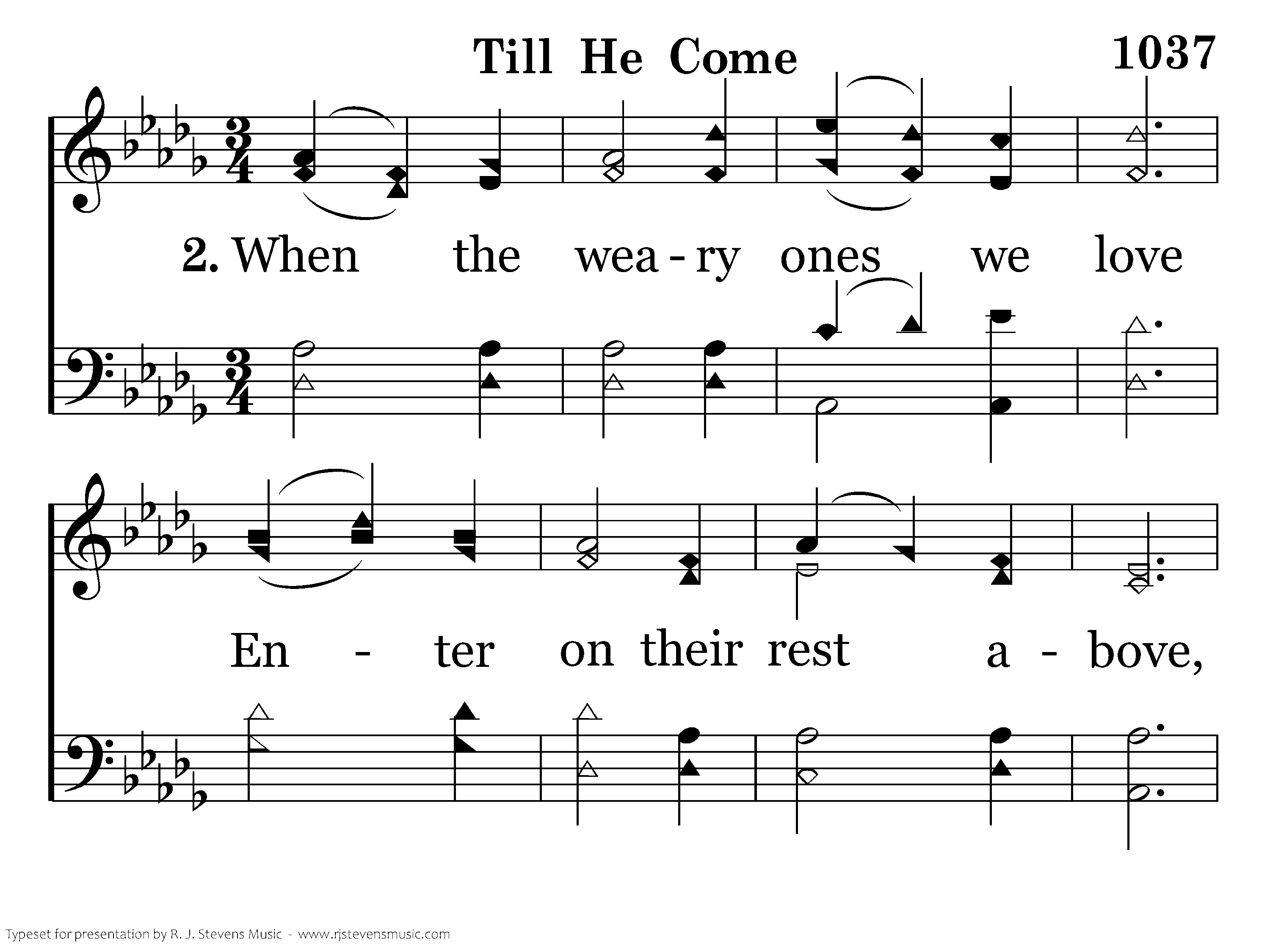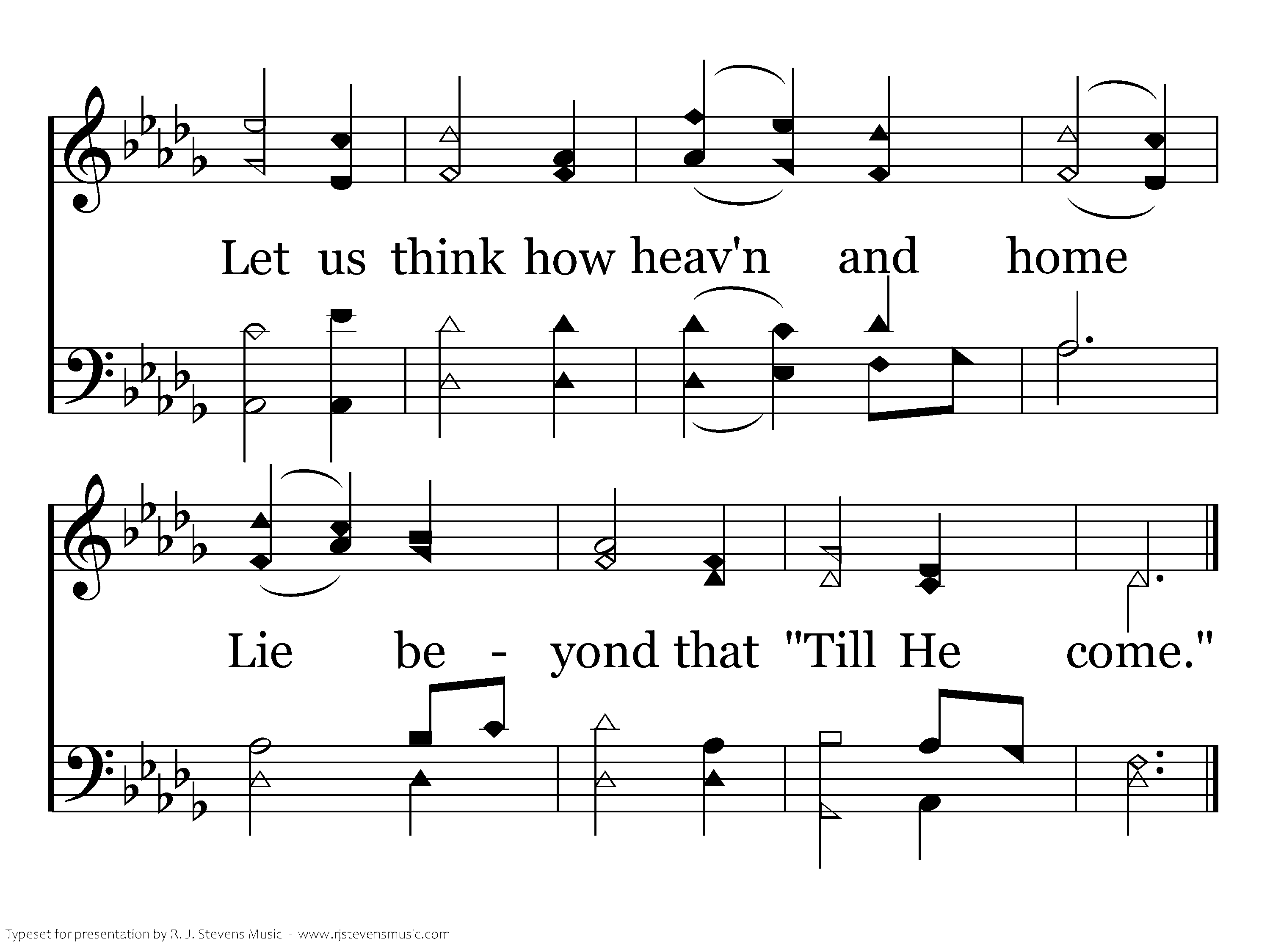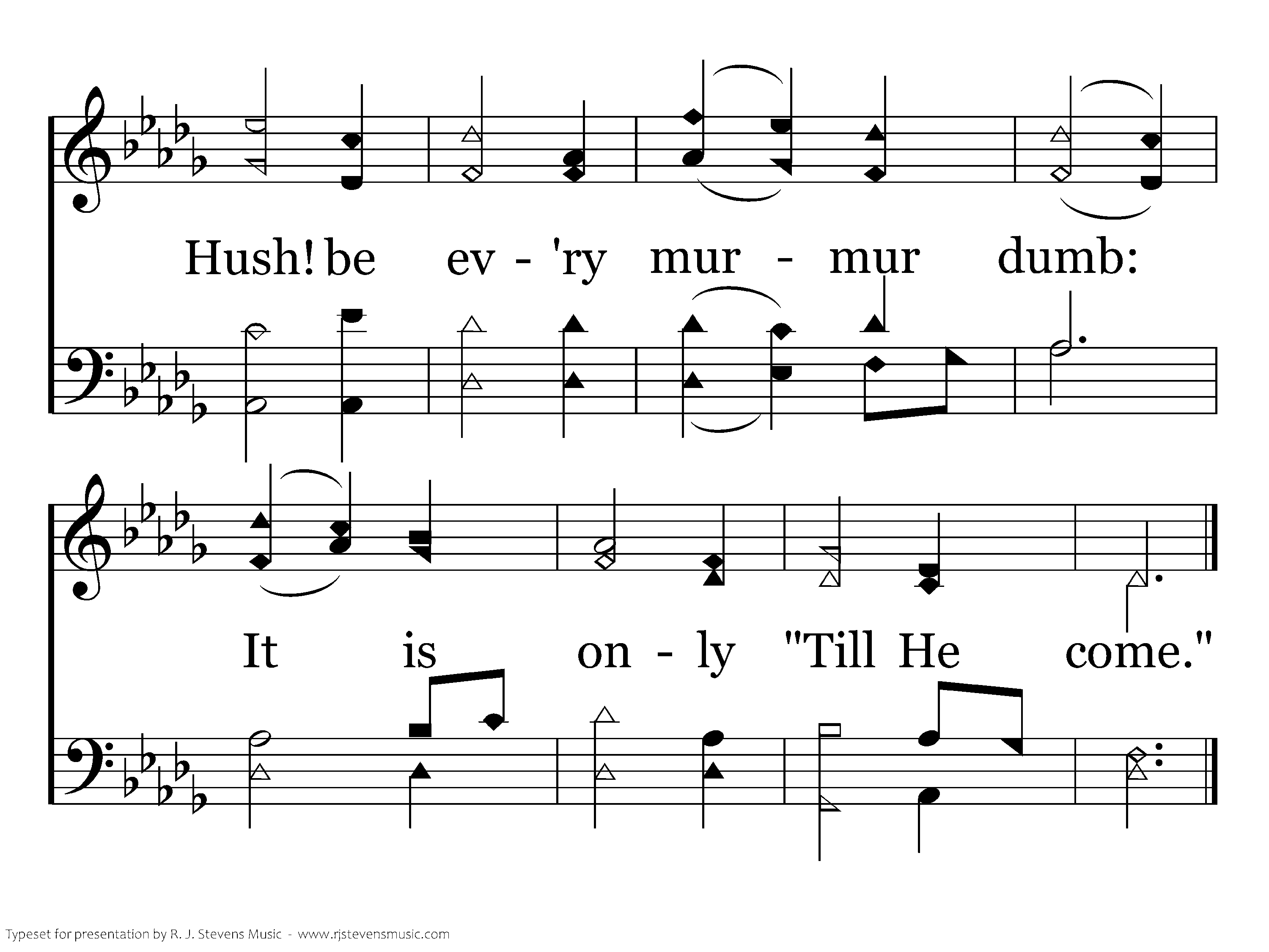 "Till He come:" O let the words Linger on the trembling chords; Let the "little while" between In their golden light be seen; Let us think how heav'n and home Lie beyond that "Till He come."