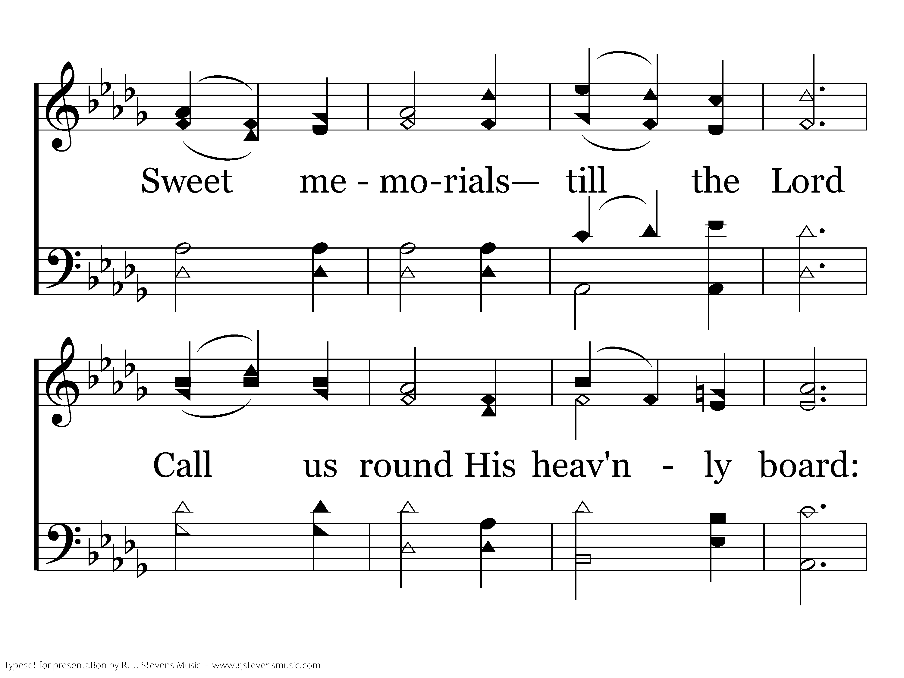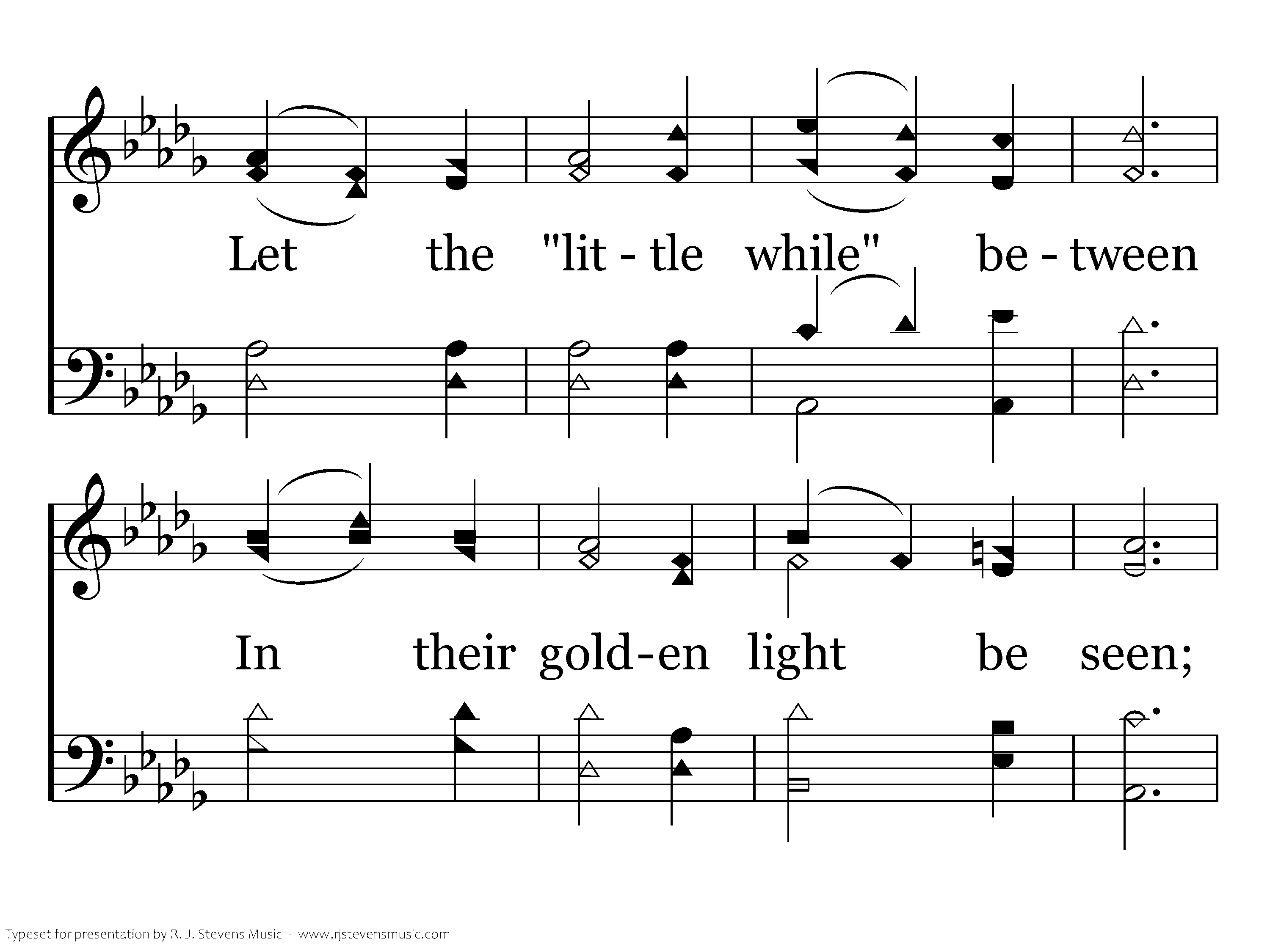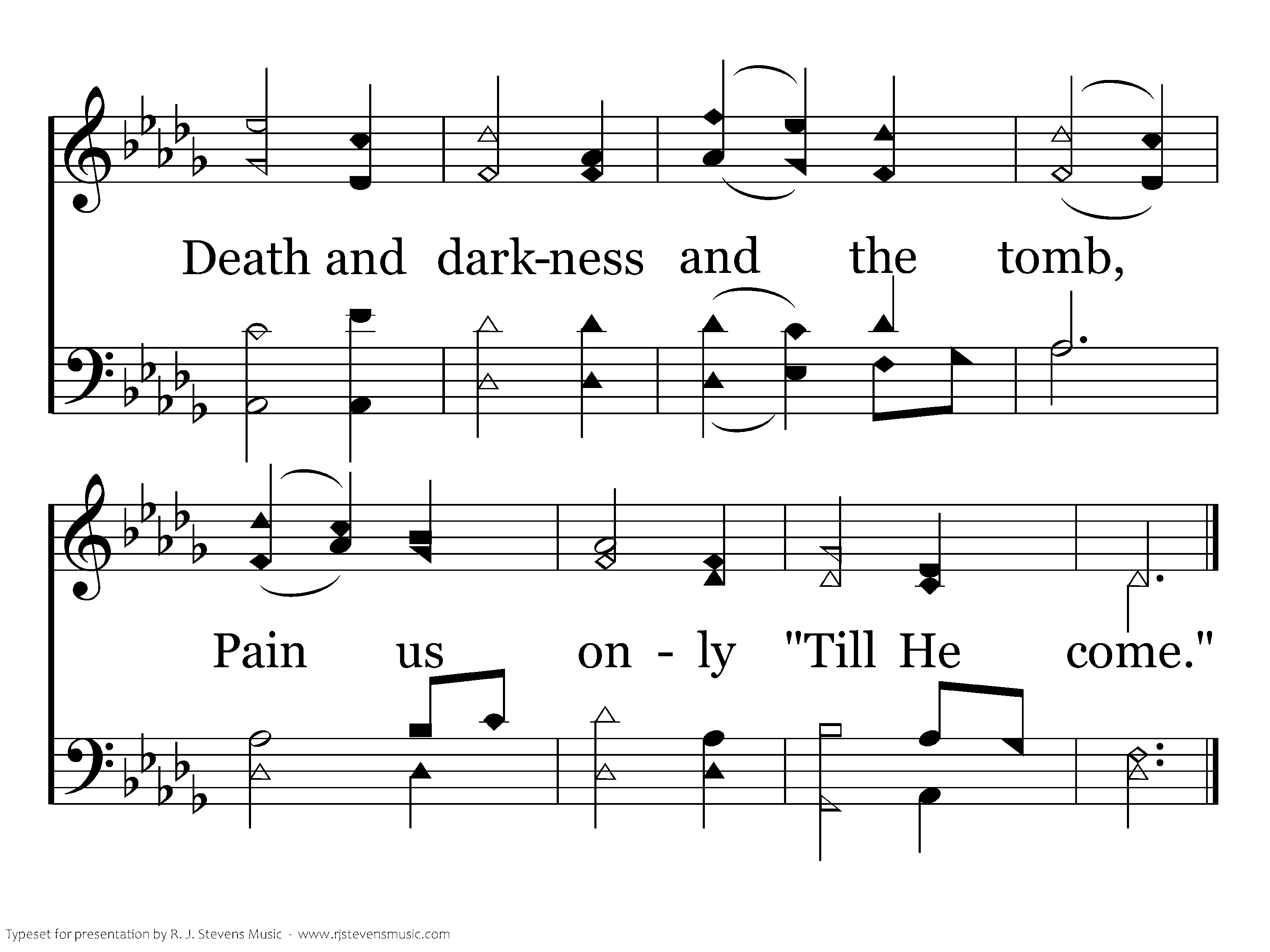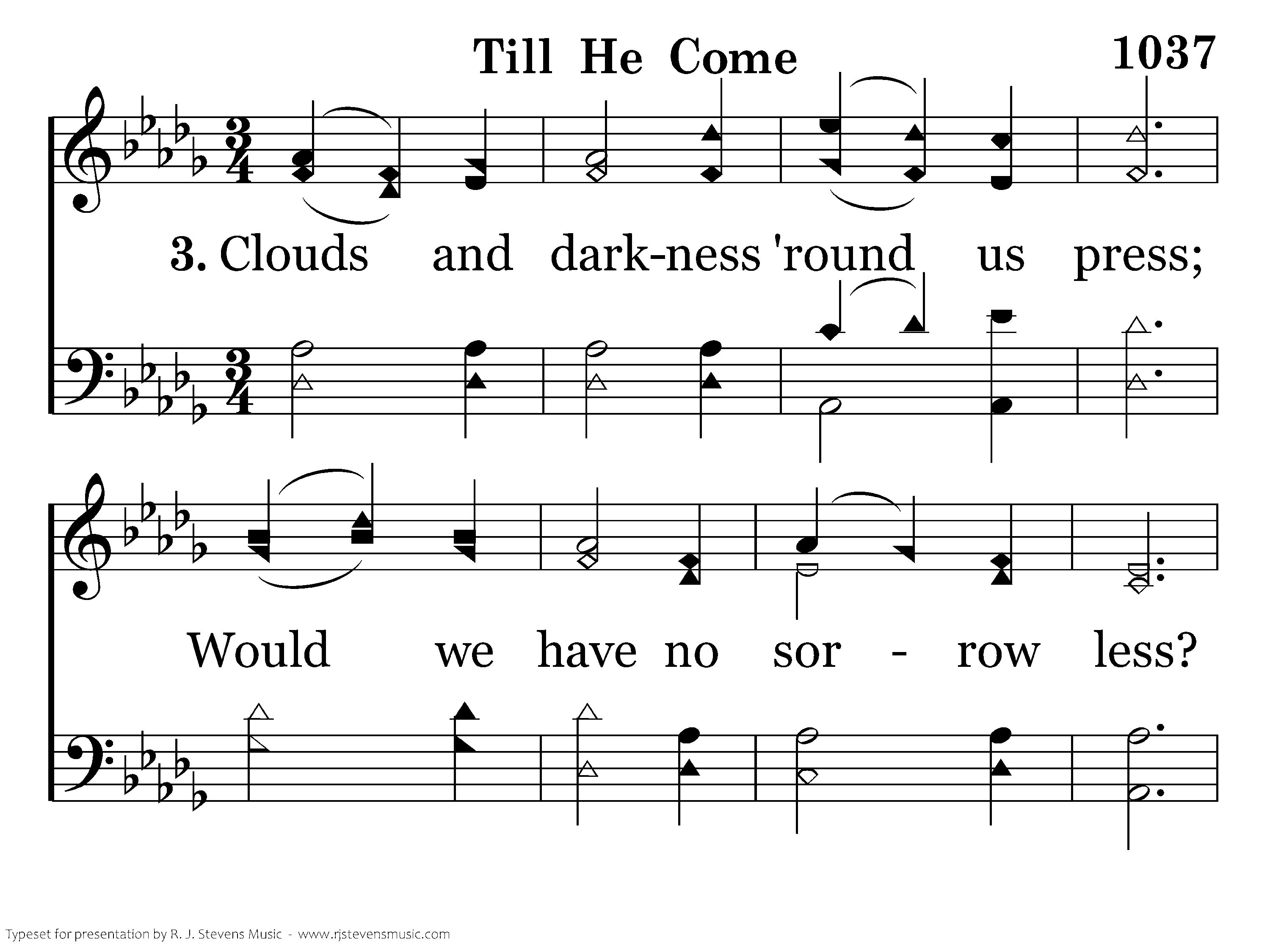 "Till He come:" O let the words Linger on the trembling chords; Let the "little while" between In their golden light be seen; Let us think how heav'n and home Lie beyond that "Till He come."