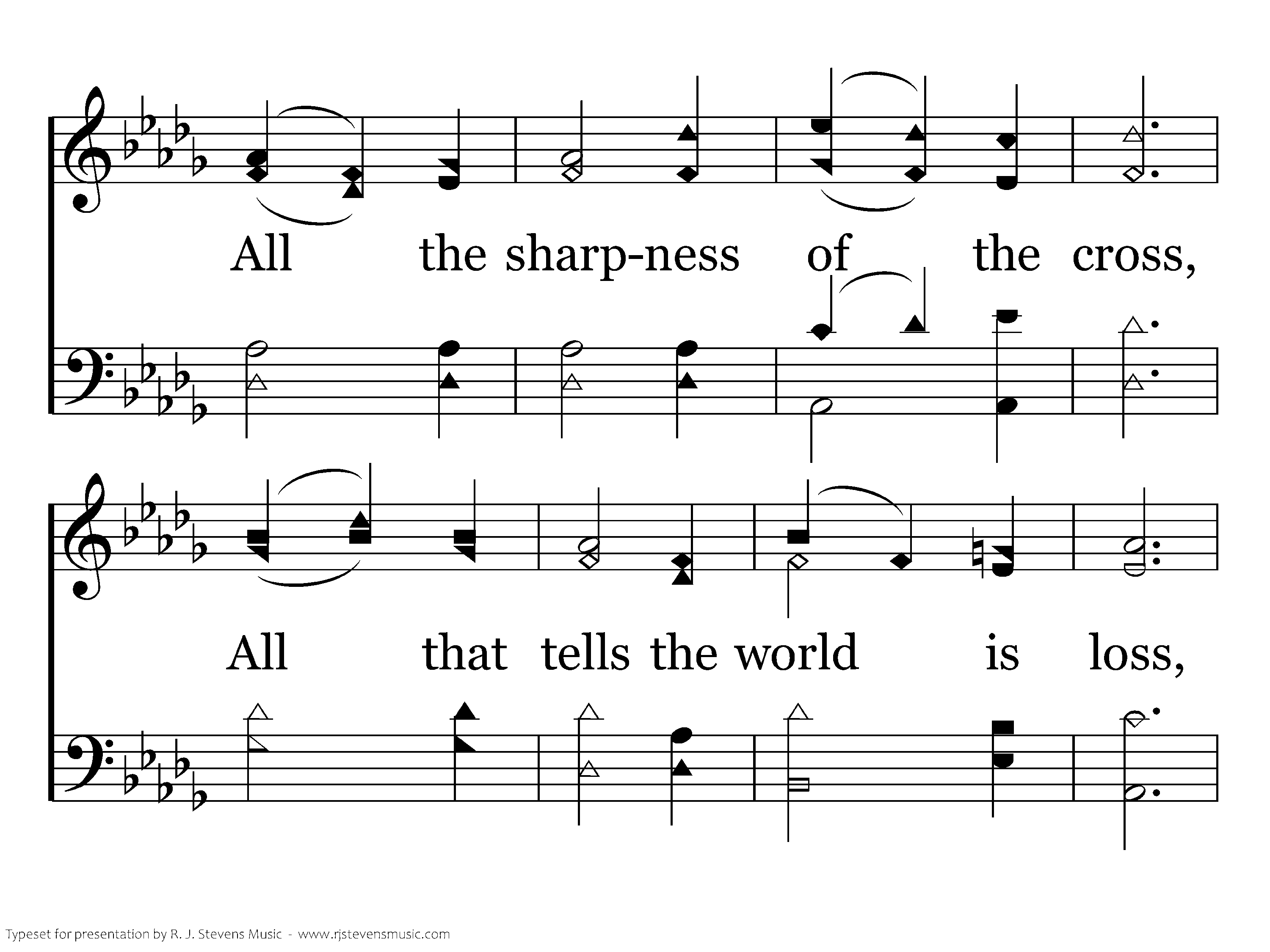 Clouds and darkness 'round us press; Would we have no sorrow less? All the sharpness of the cross, All that tells the world is loss, Death and darkness and the tomb, Pain us only "Till He come."