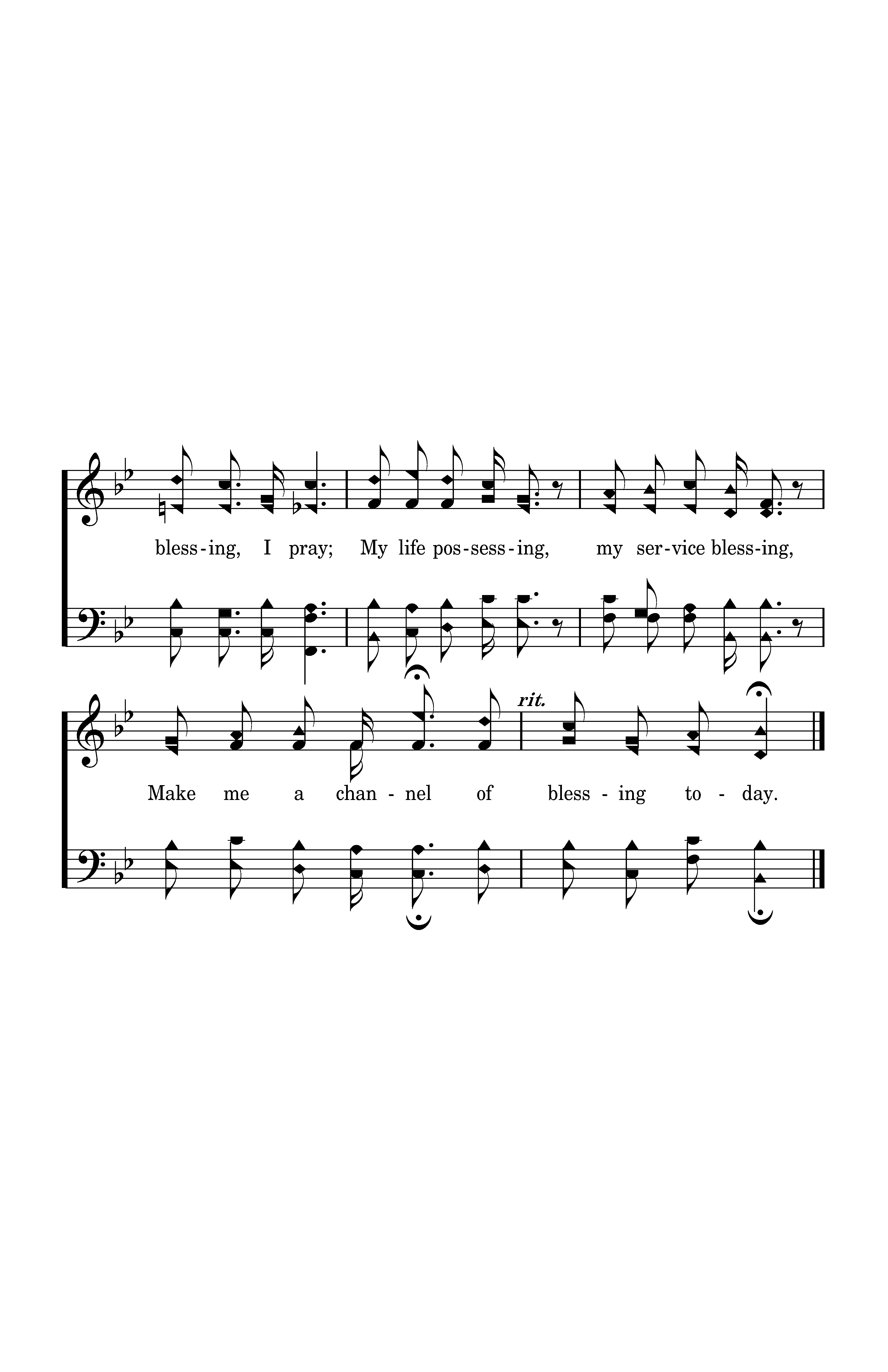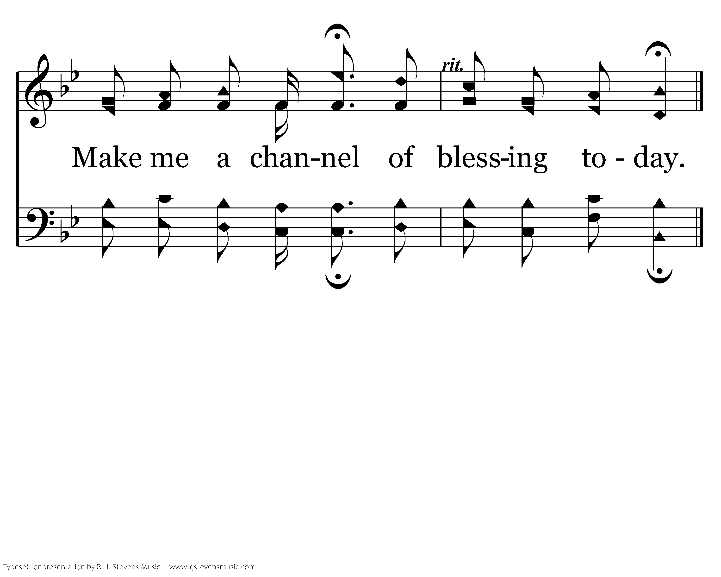 Make me a channel of blessing today, Make me a channel of blessing, I pray; My life possessing, my service blessing, Make me a channel of blessing today.