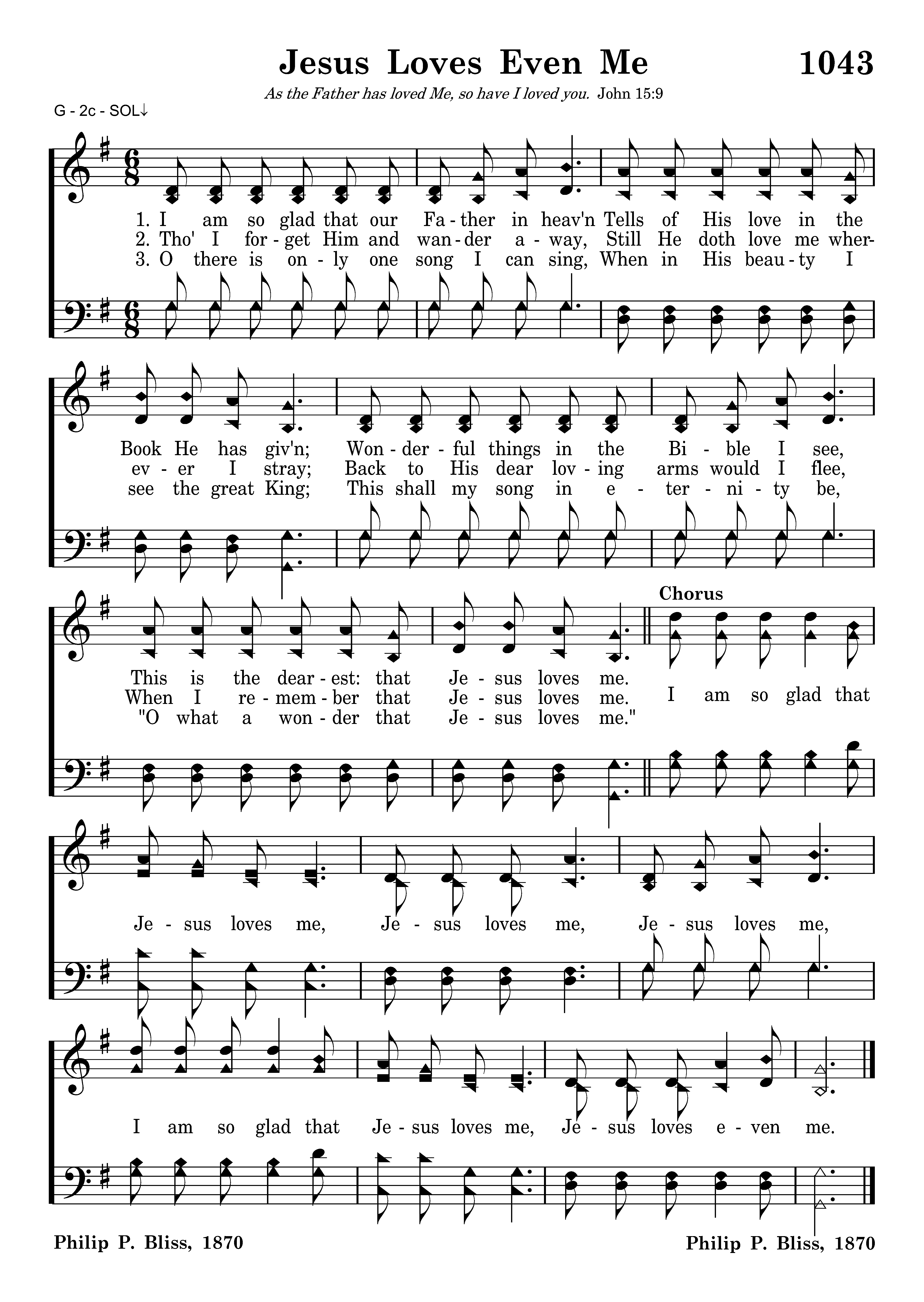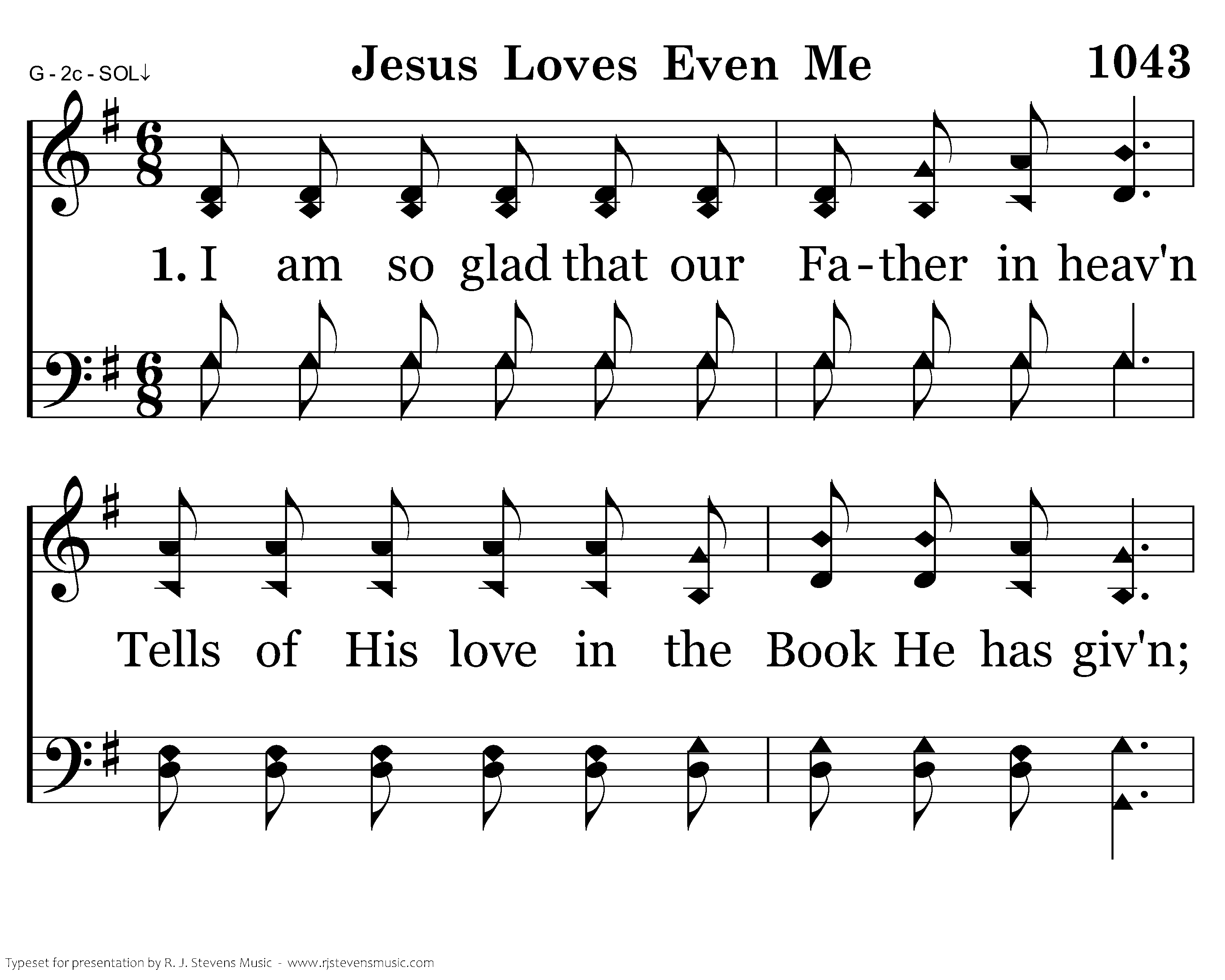 I am so glad that our Father in heav'n Tells of His love in the Book He has giv'n; Wonderful things in the Bible I see, This is the dearest: that Jesus loves me.