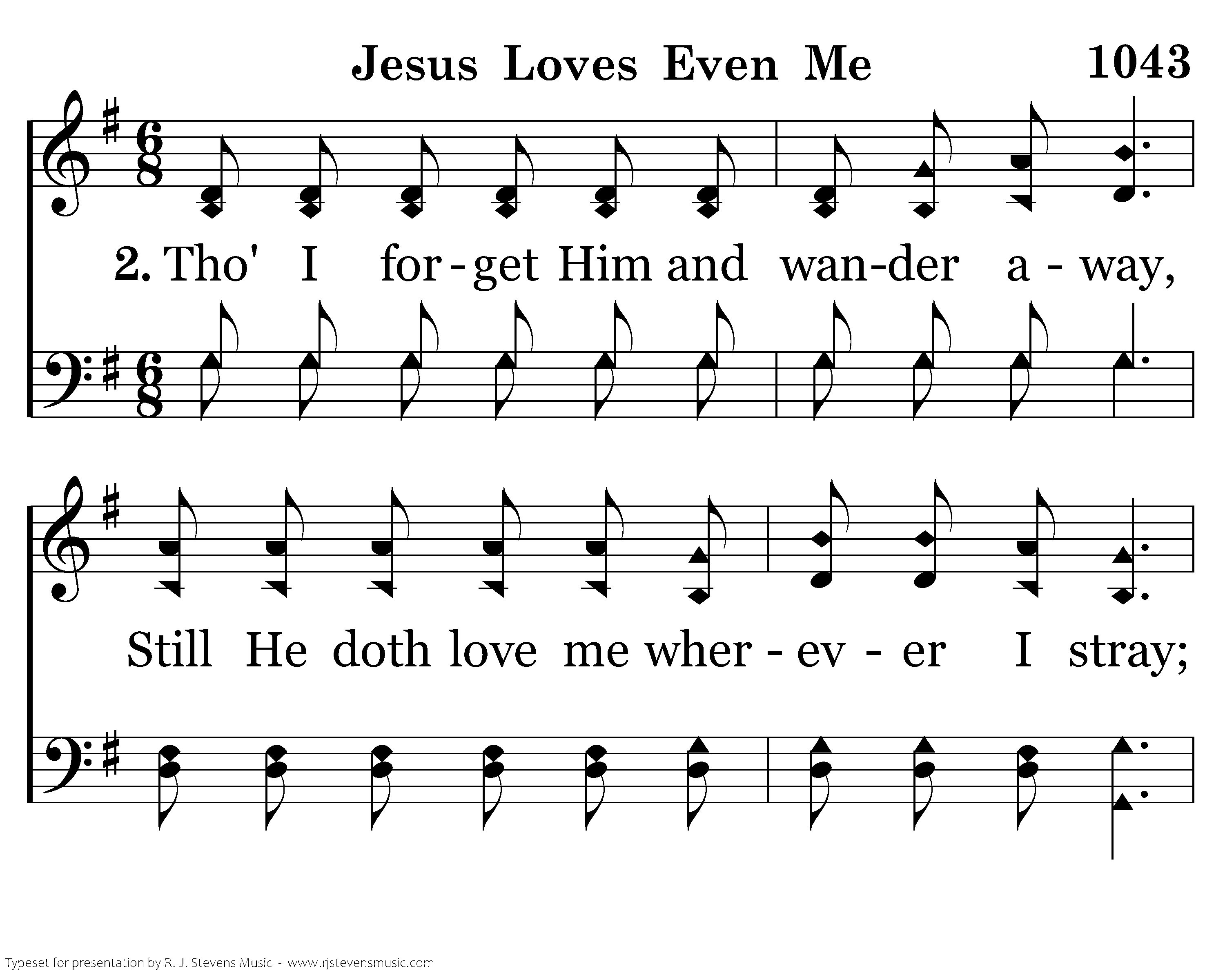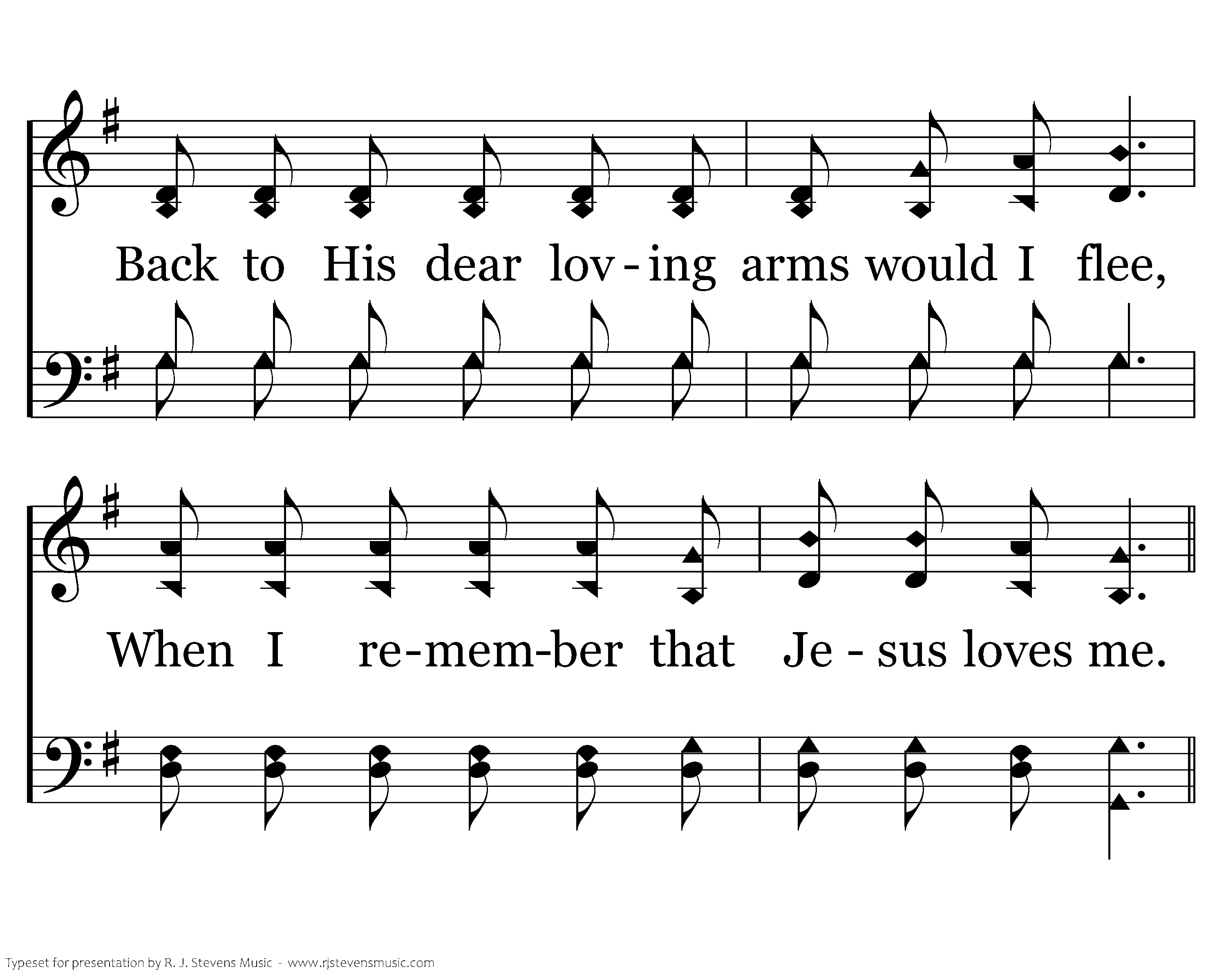 Tho' I forget Him and wander away, Still He doth love me wherever I stray; Back to His dear loving arms would I flee, When I remember that Jesus loves me.