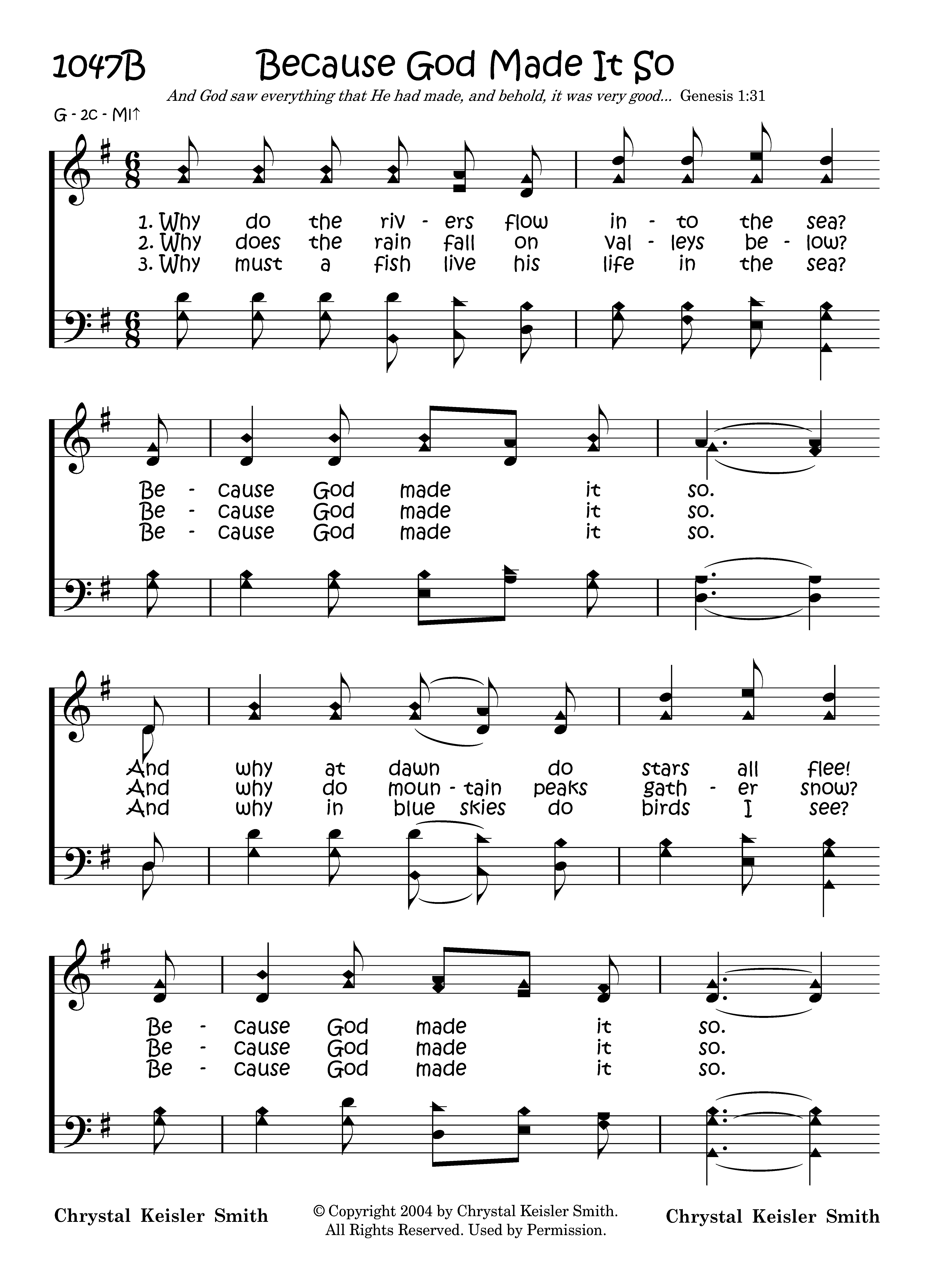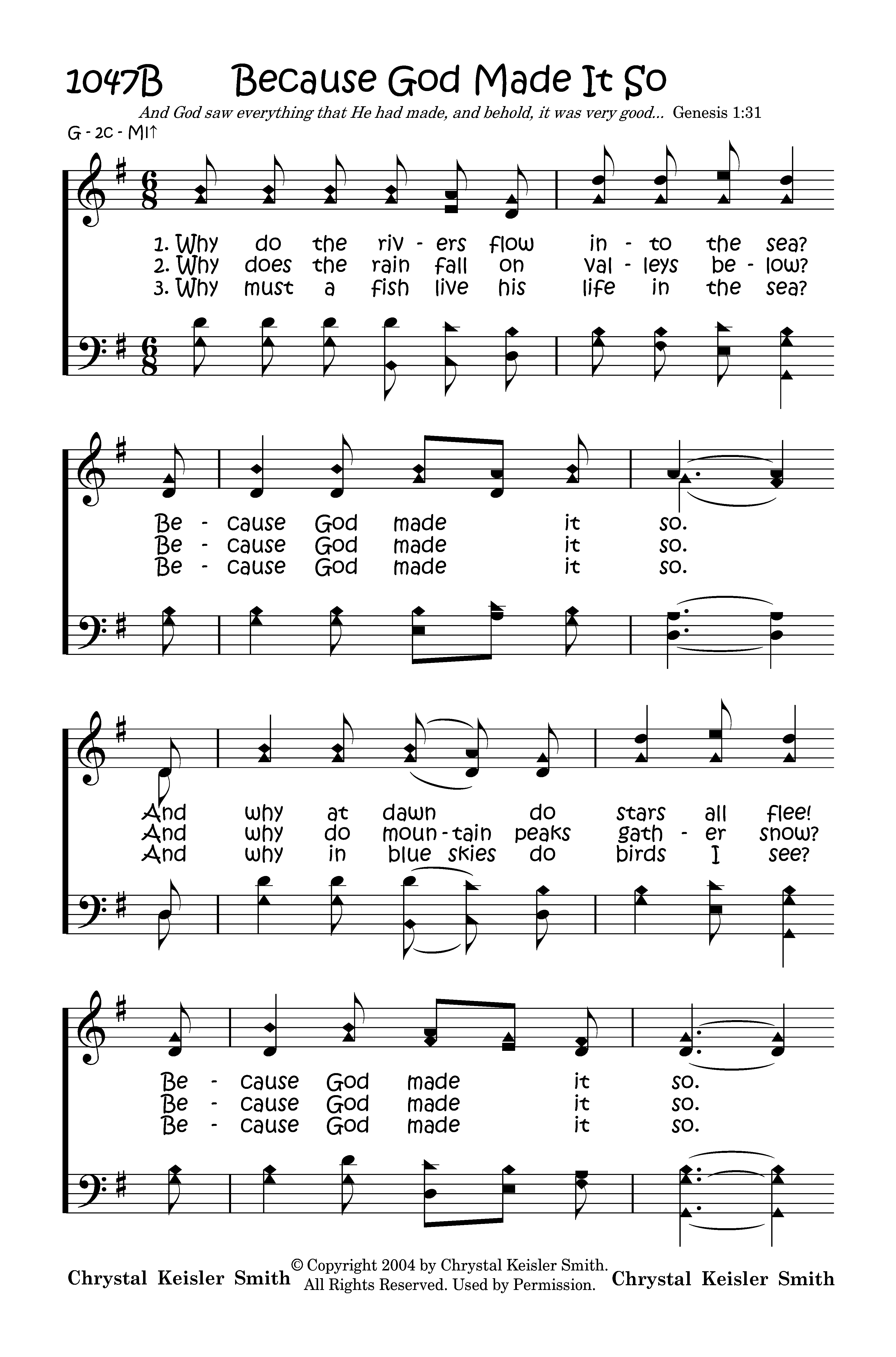 Why must a fish live his life in the sea? Because God made it so. And why in blue skies do birds I see? Because God made it so.
