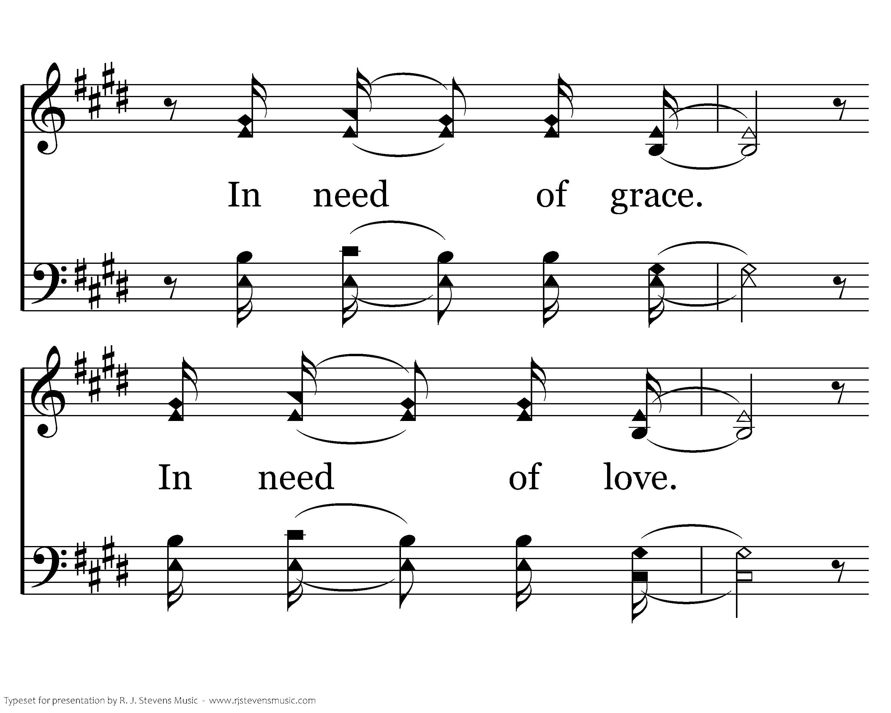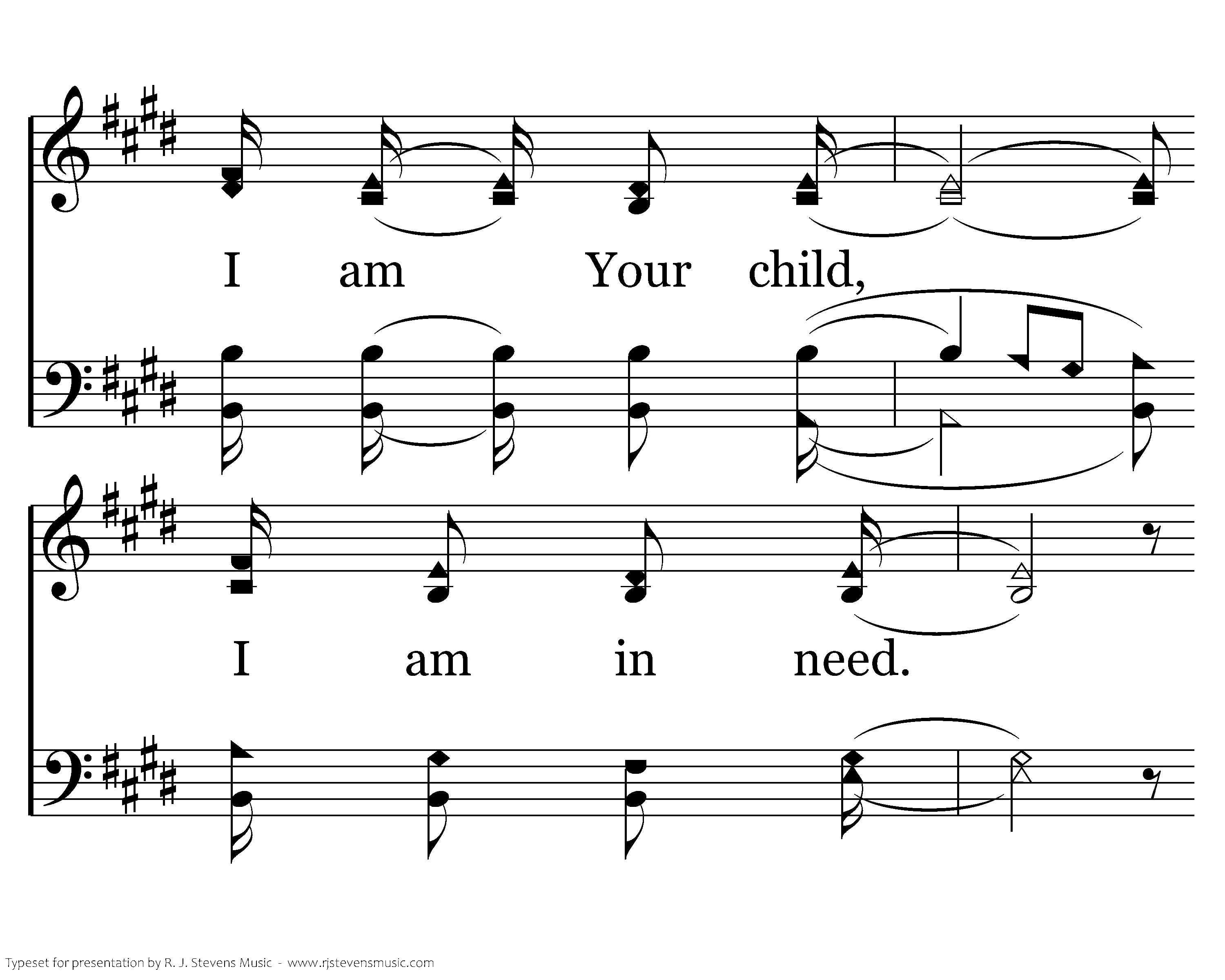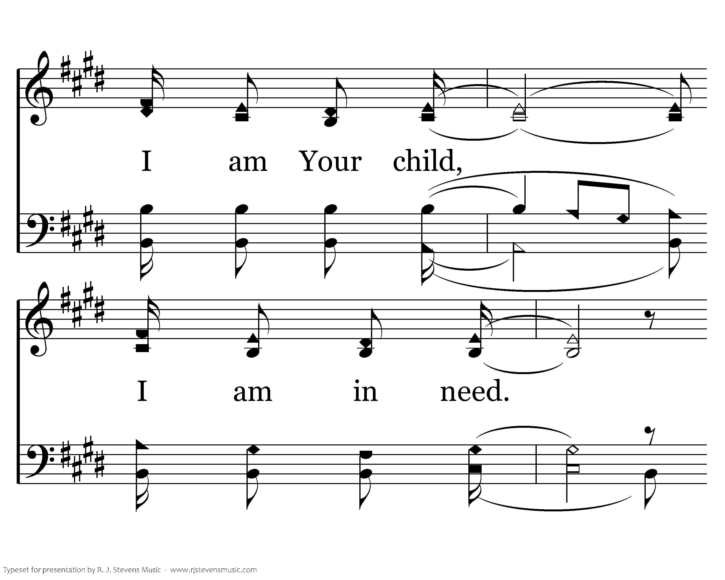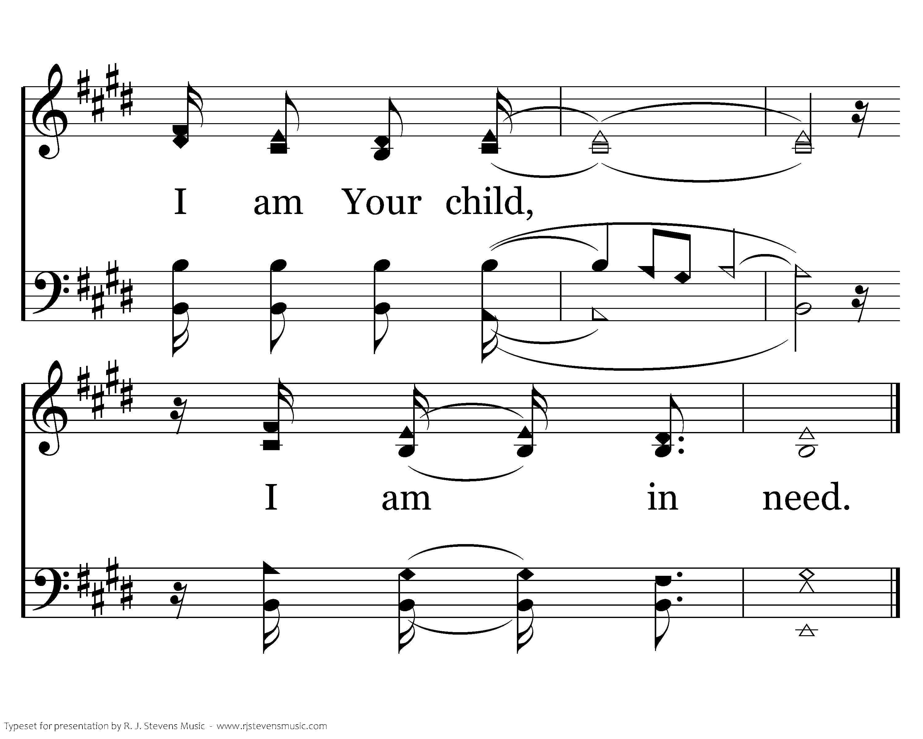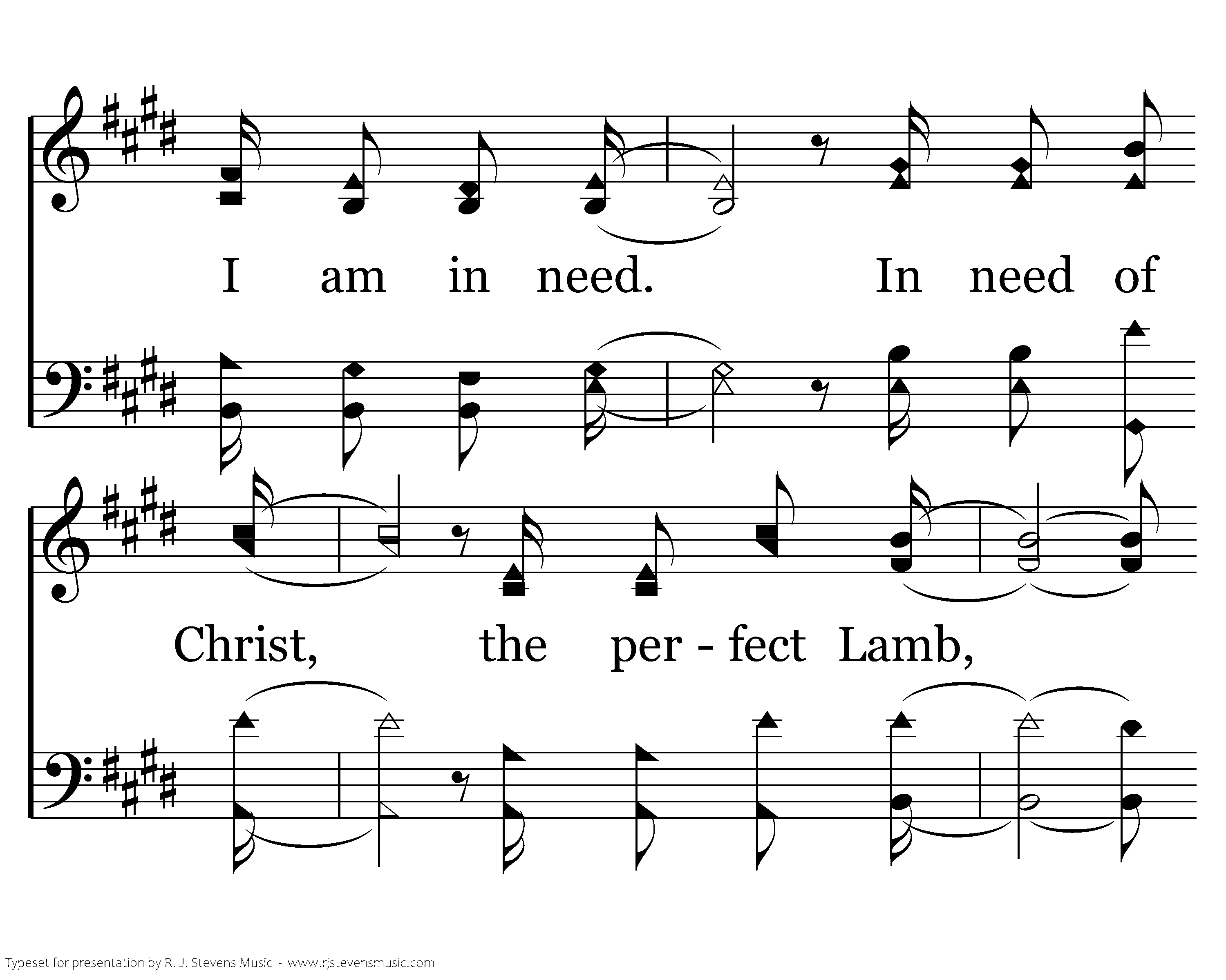 In need of grace. In need of love. In need of mercy raining down from high above. In need of strength. In need of peace. In need of things that only You can give to me. In need of Christ, the perfect Lamb, my refuge strong, the great I AM! This is my song, my humble plea; I am Your child, I am in need. In need of Christ, I am in need. I am Your child, I am in need.