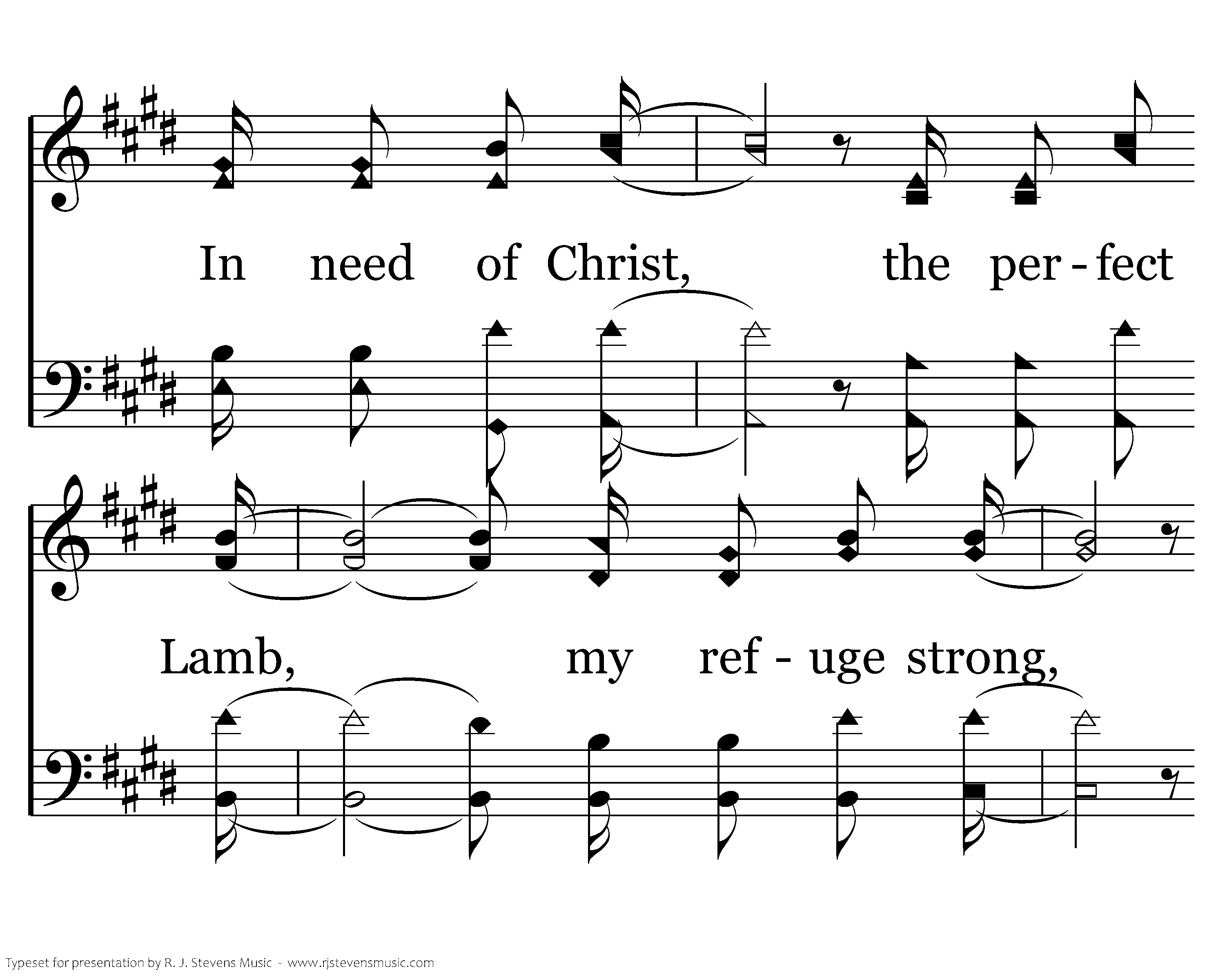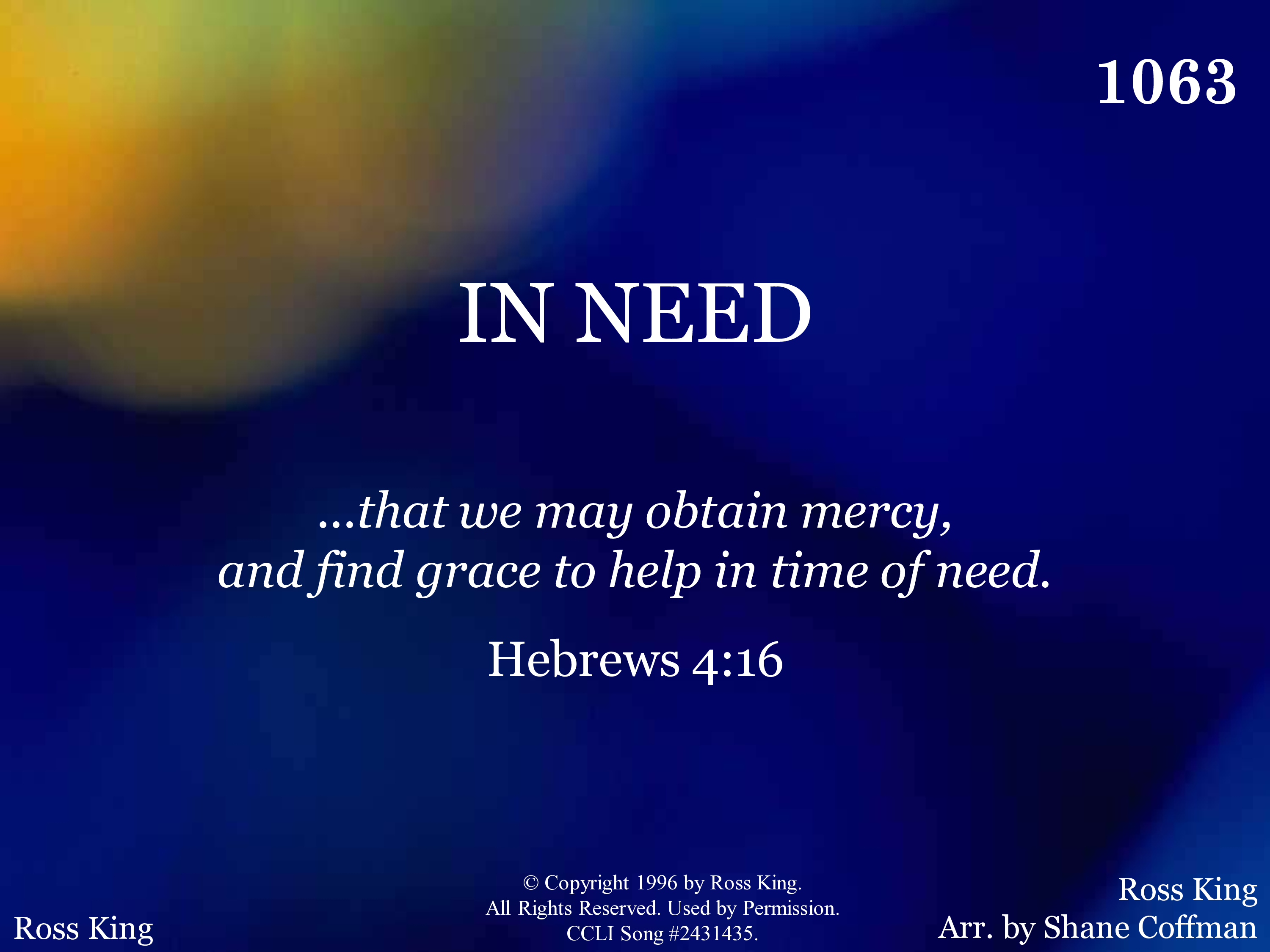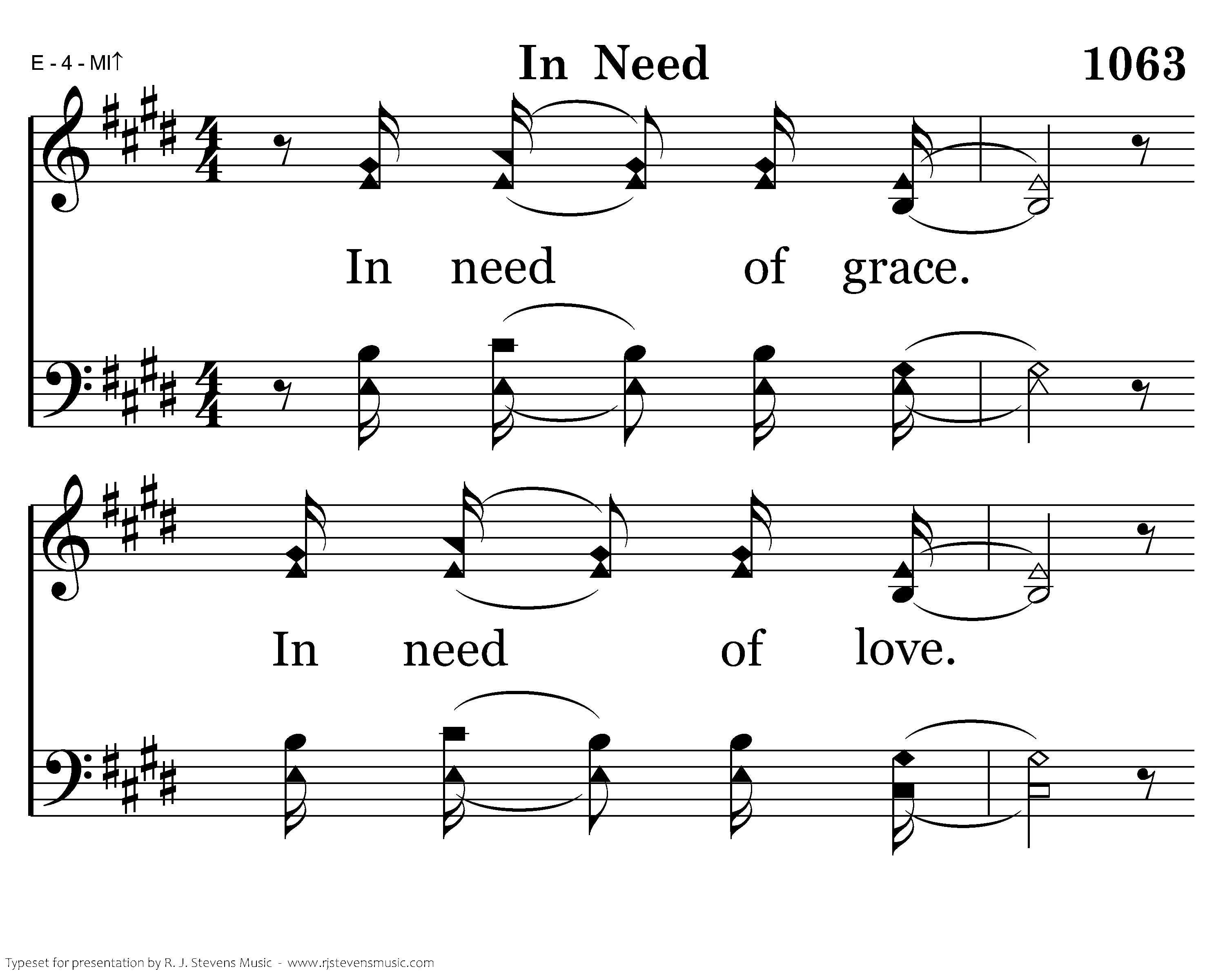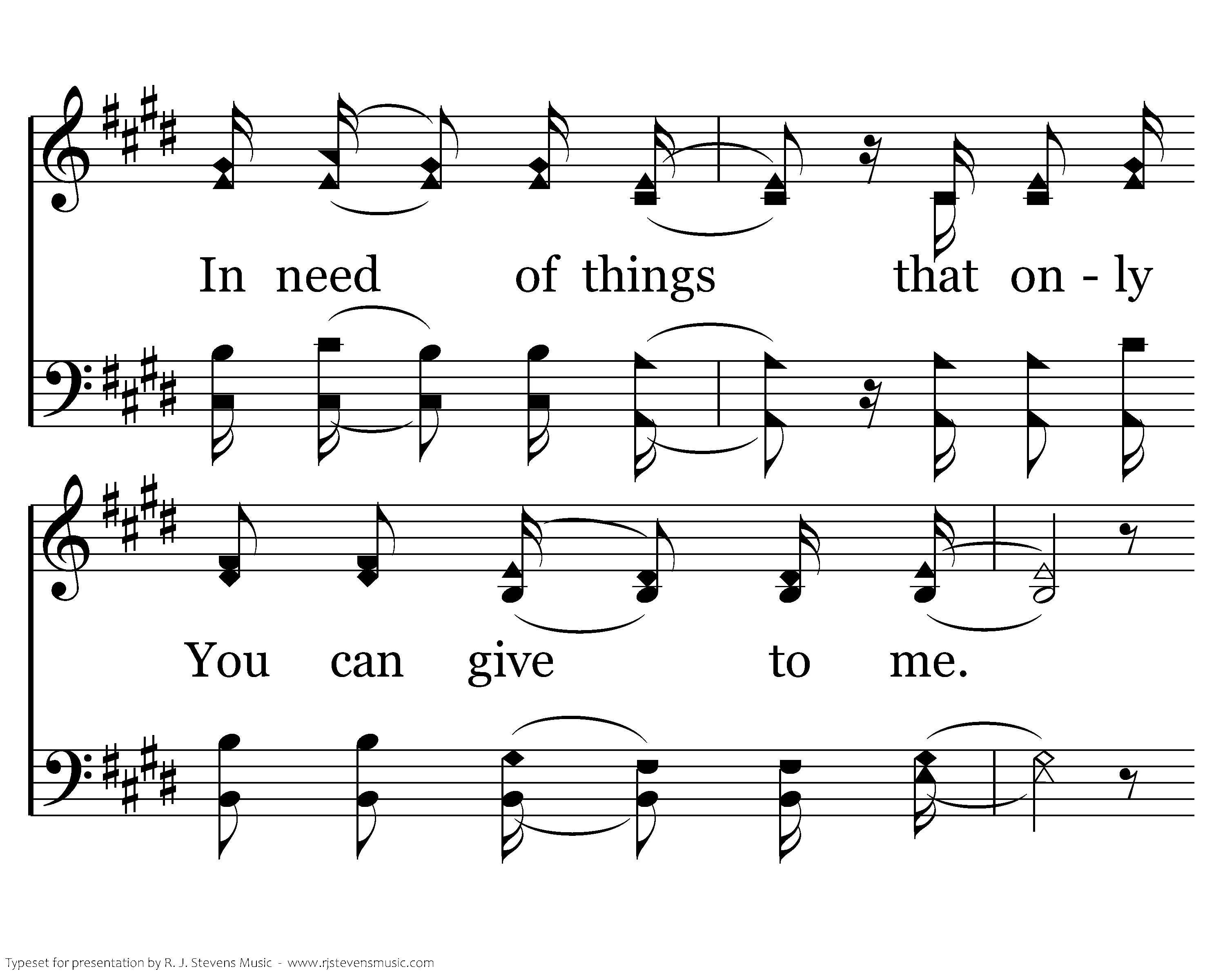 In need of grace. In need of love. In need of mercy raining down from high above. In need of strength. In need of peace. In need of things that only You can give to me. In need of Christ, the perfect Lamb, my refuge strong, the great I AM! This is my song, my humble plea; I am Your child, I am in need. In need of Christ, I am in need. I am Your child, I am in need.
