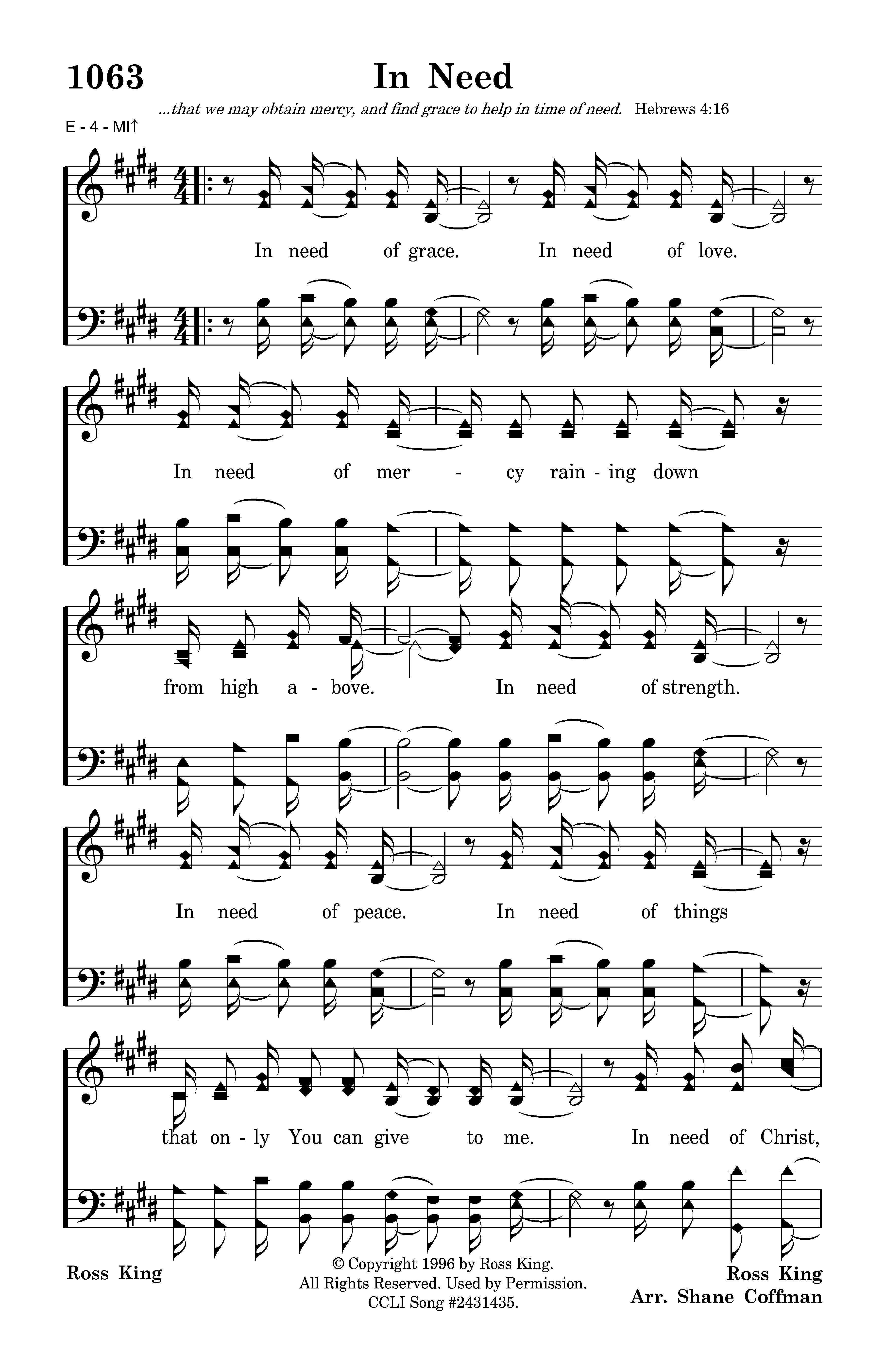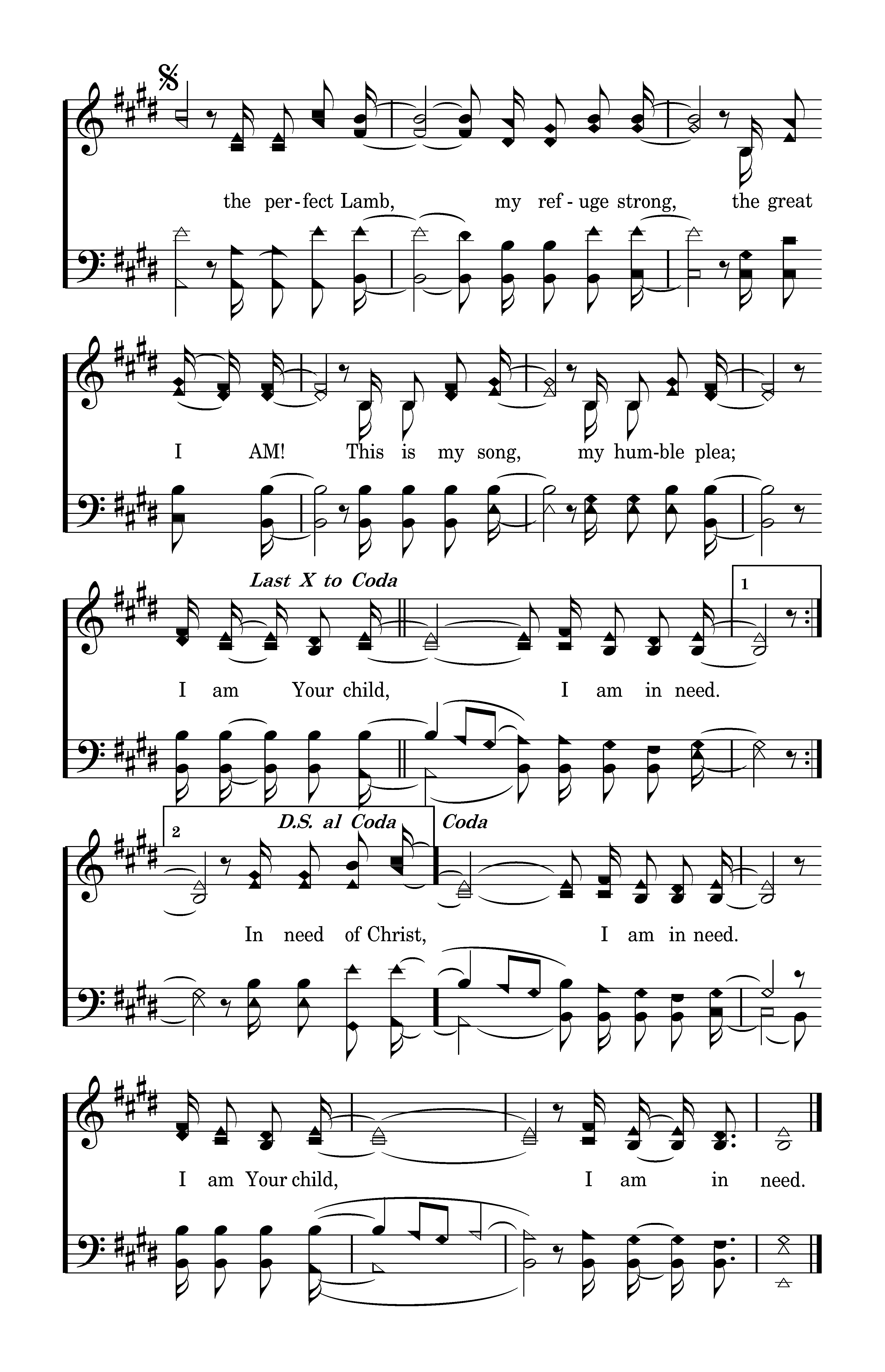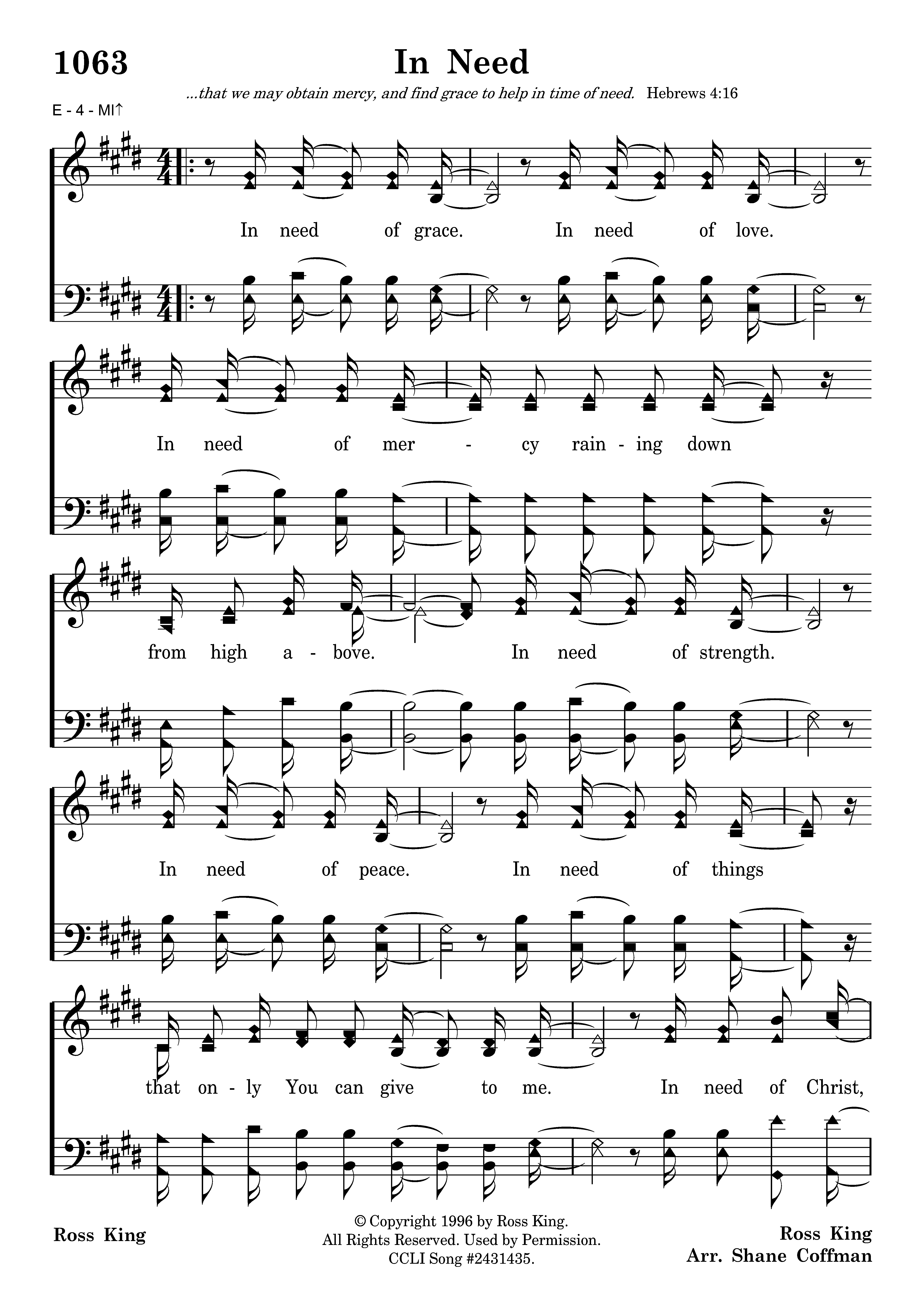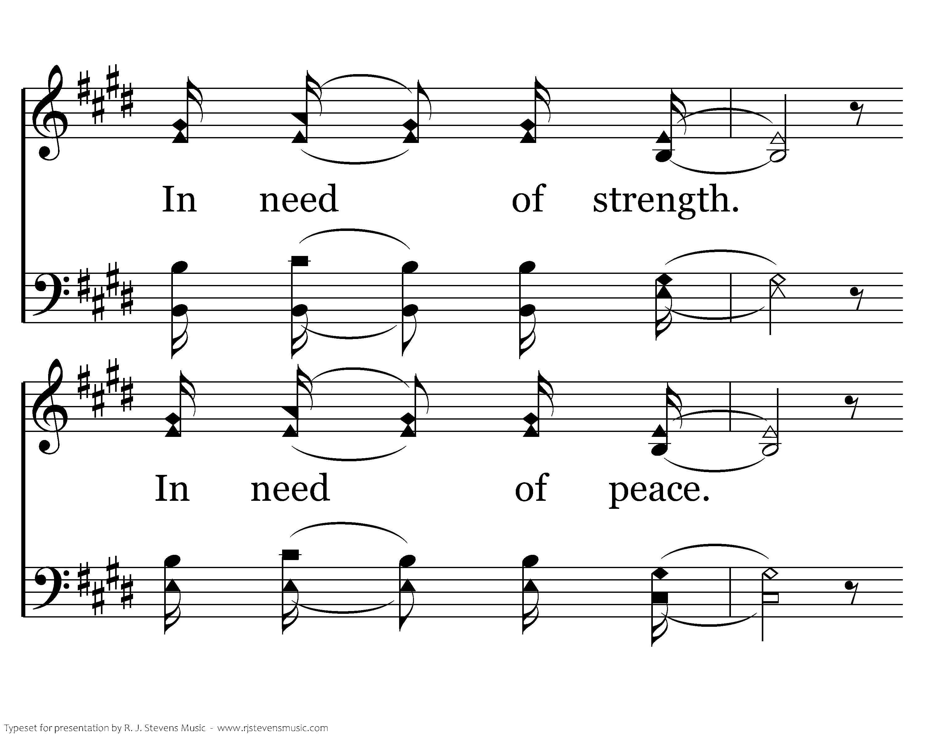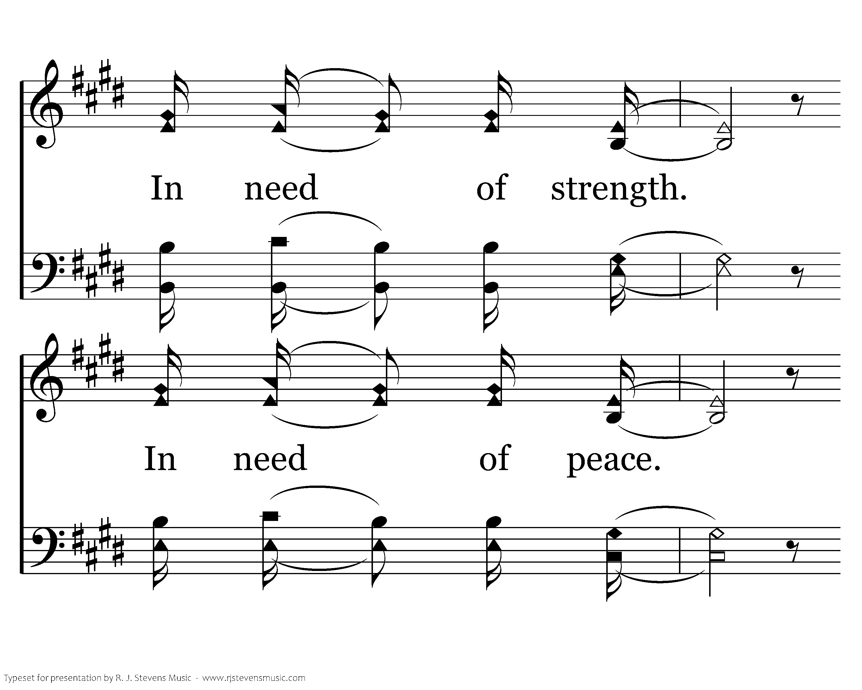 In need of grace. In need of love. In need of mercy raining down from high above. In need of strength. In need of peace. In need of things that only You can give to me. In need of Christ, the perfect Lamb, my refuge strong, the great I AM! This is my song, my humble plea; I am Your child, I am in need. In need of Christ, I am in need. I am Your child, I am in need.