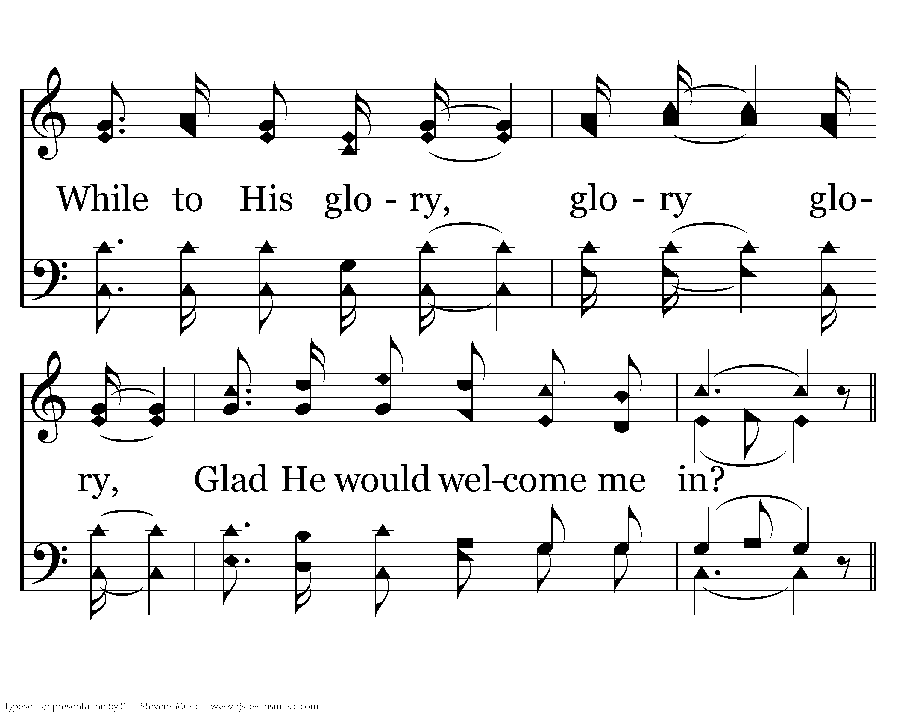 Jesus is pleading, pleading, pleading, Why should I wander in sin, While to His glory, glory glory, Glad He would welcome me in?