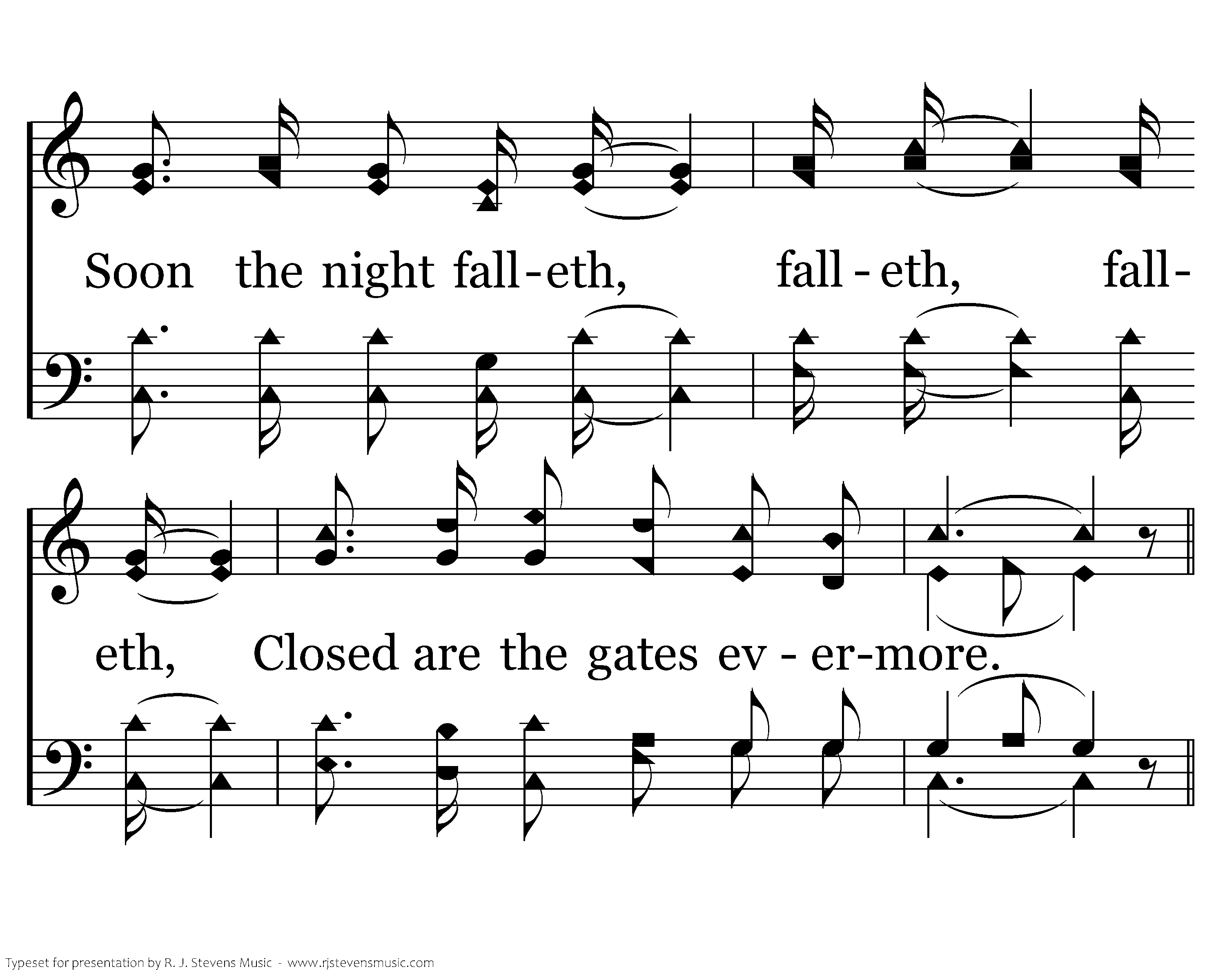 Jesus is waiting, waiting, waiting, Open now standeth the door; Soon the night falleth, falleth, falleth, Closed are the gates evermore.