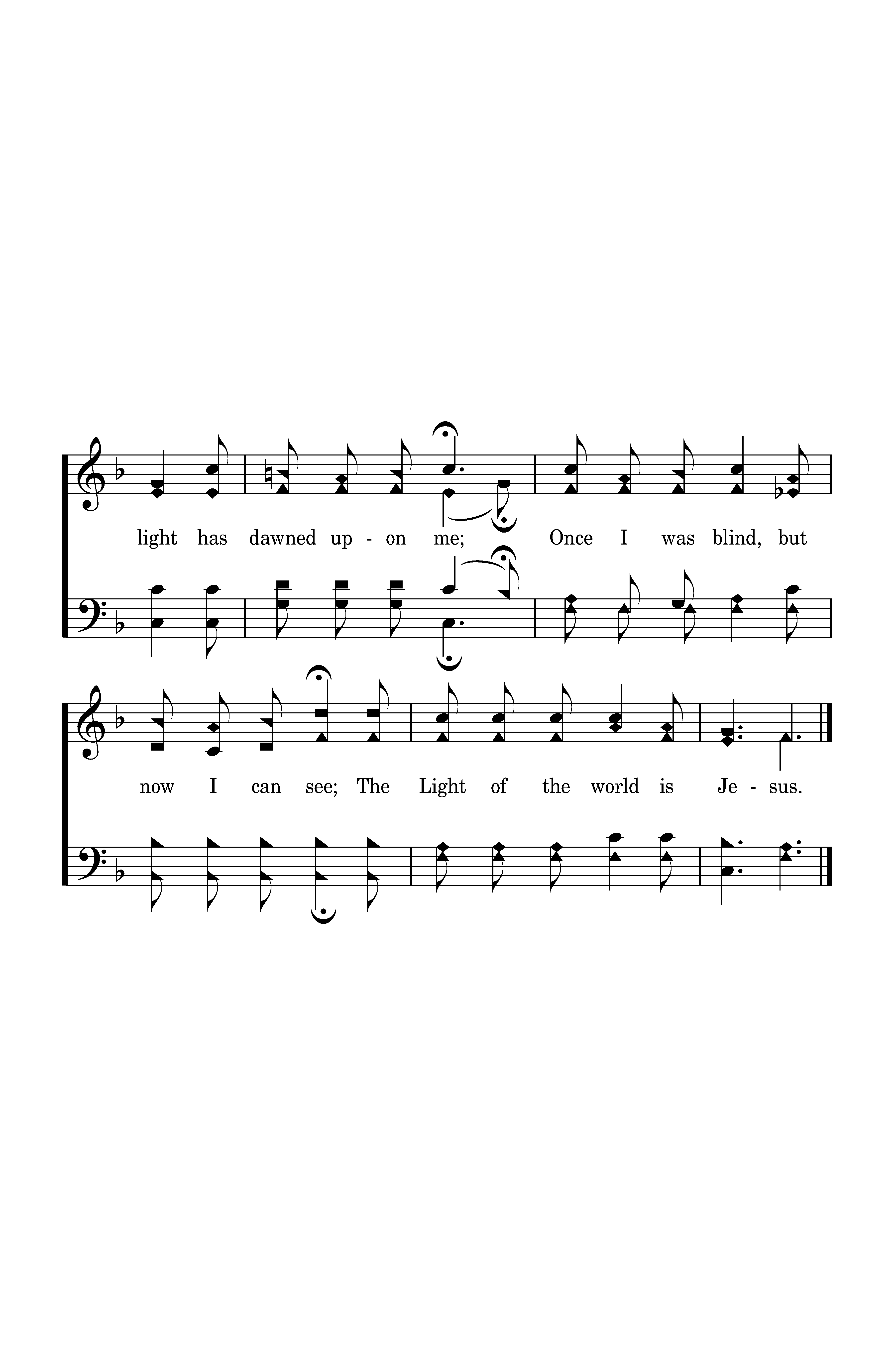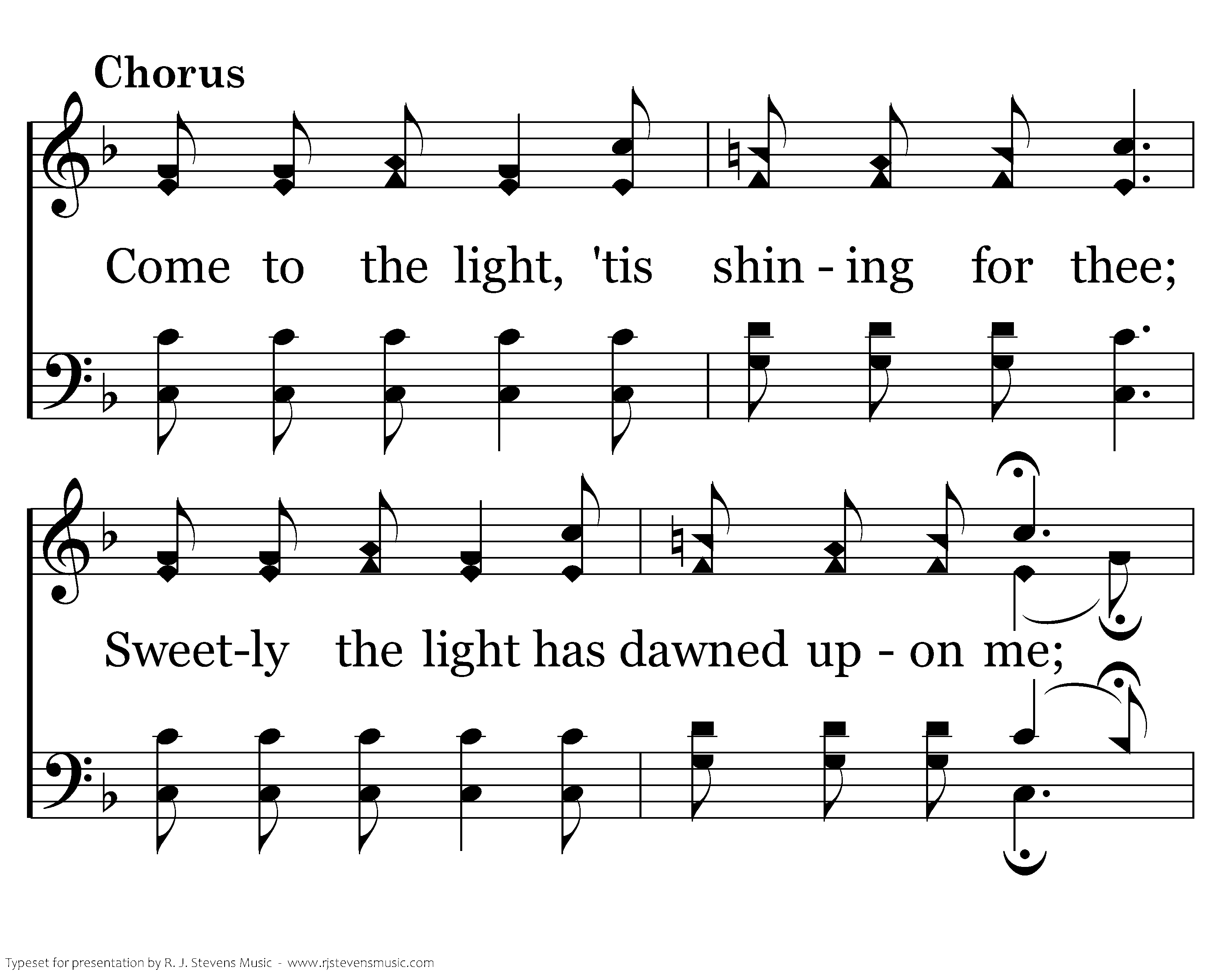 Come to the light, 'tis shining for thee; Sweetly the light has dawned upon me; Once I was blind, but now I can see; The Light of the world is Jesus.