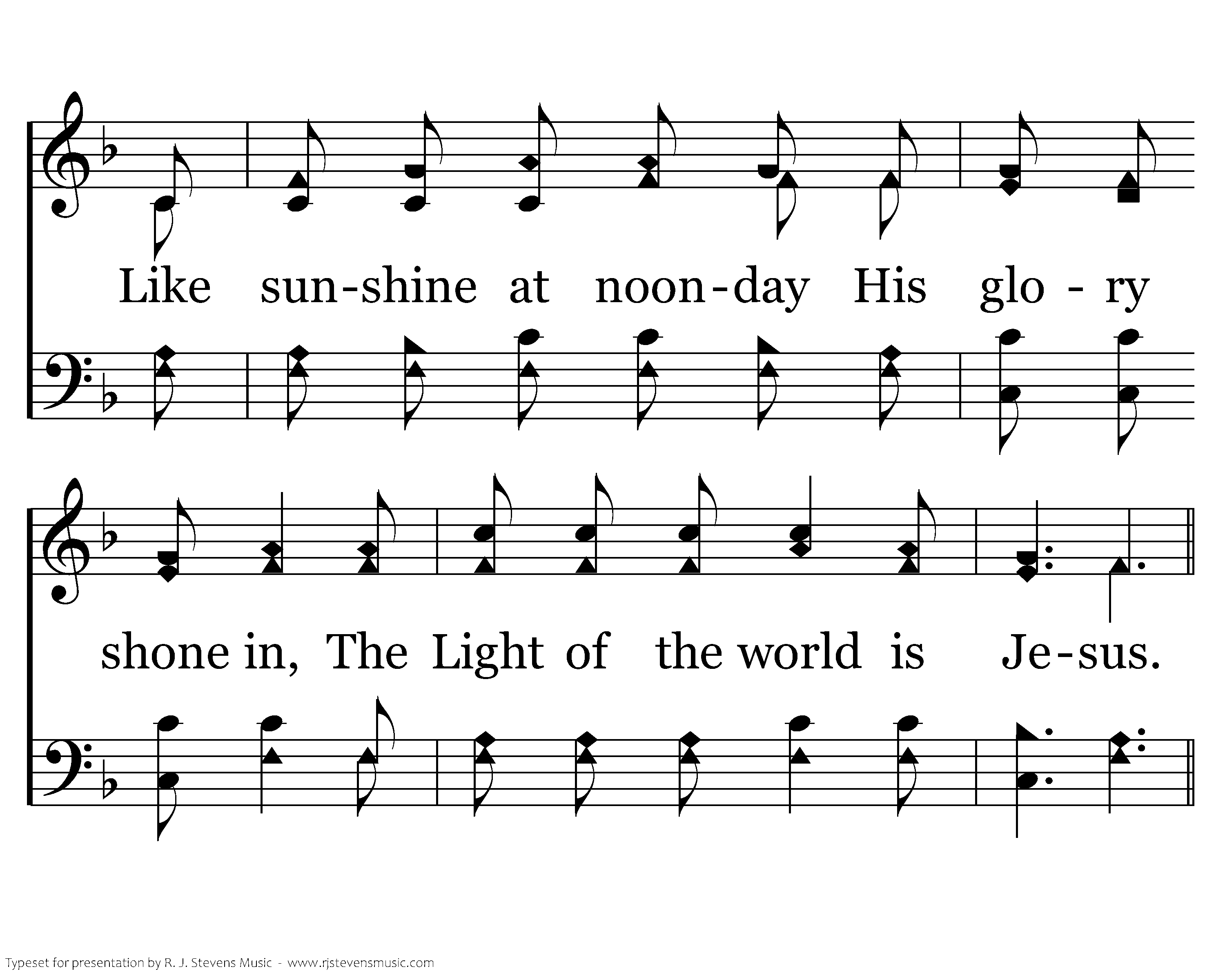 The whole world was lost in the darkness of sin; The Light of the world is Jesus; Like sunshine at noonday His glory shone in, The Light of the world is Jesus.