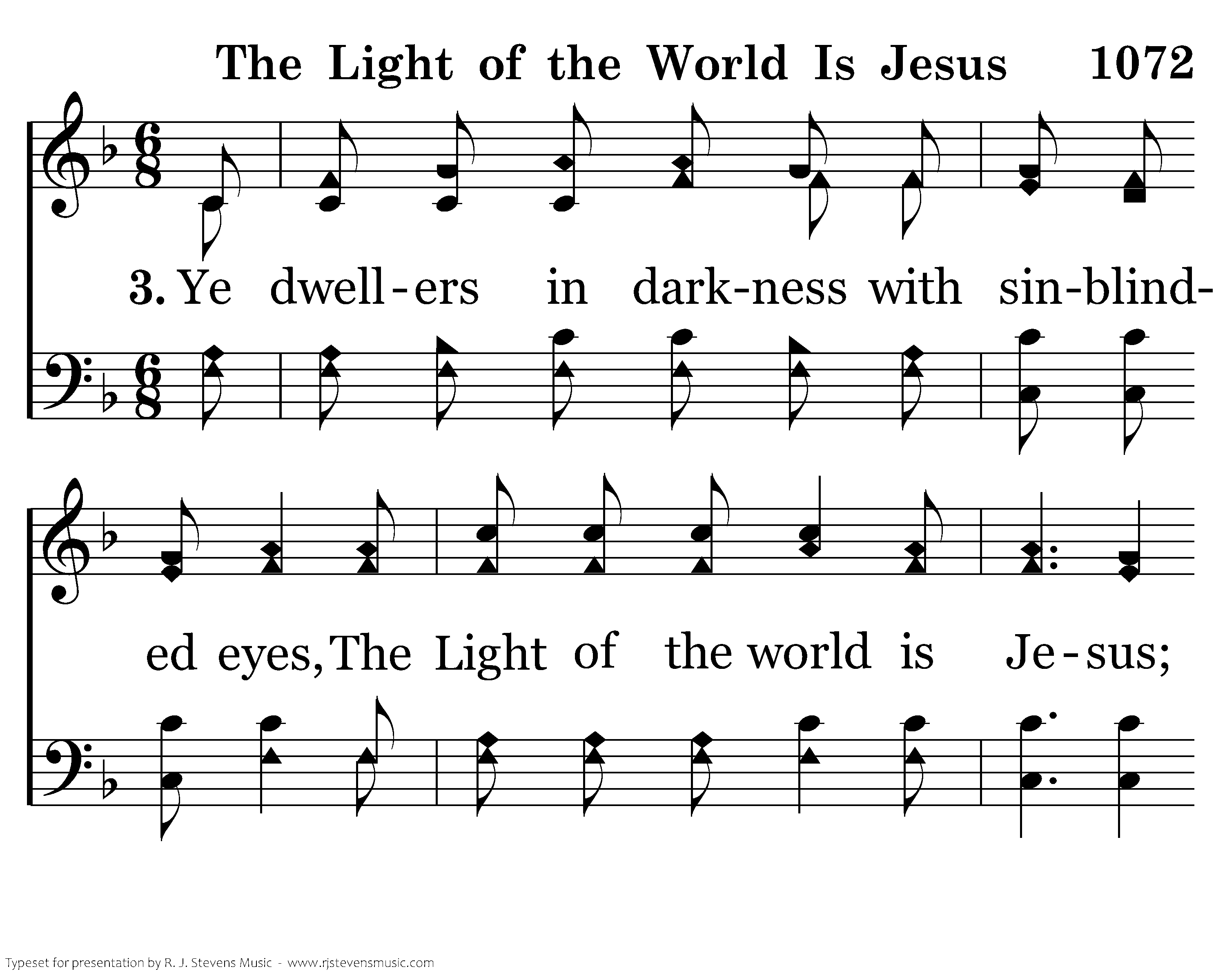 Ye dwellers in darkness with sinblinded eyes, The Light of the world is Jesus; Go, wash, at His bidding and light will arise, The Light of the world is Jesus.