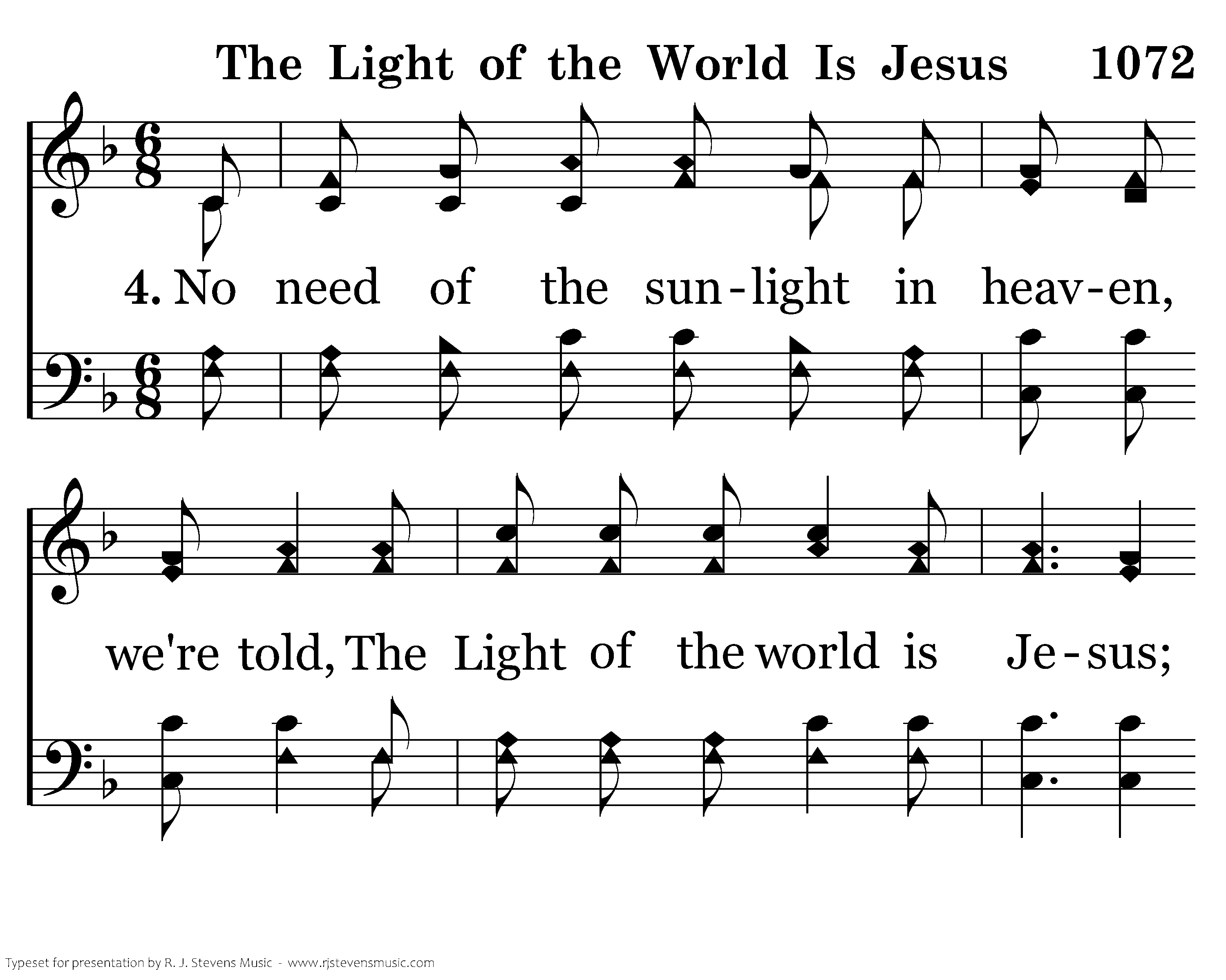 No need of the sunlight in heaven, we're told, The Light of the world is Jesus; The Lamb is the Light of the City of Gold, The Light of the world is Jesus.