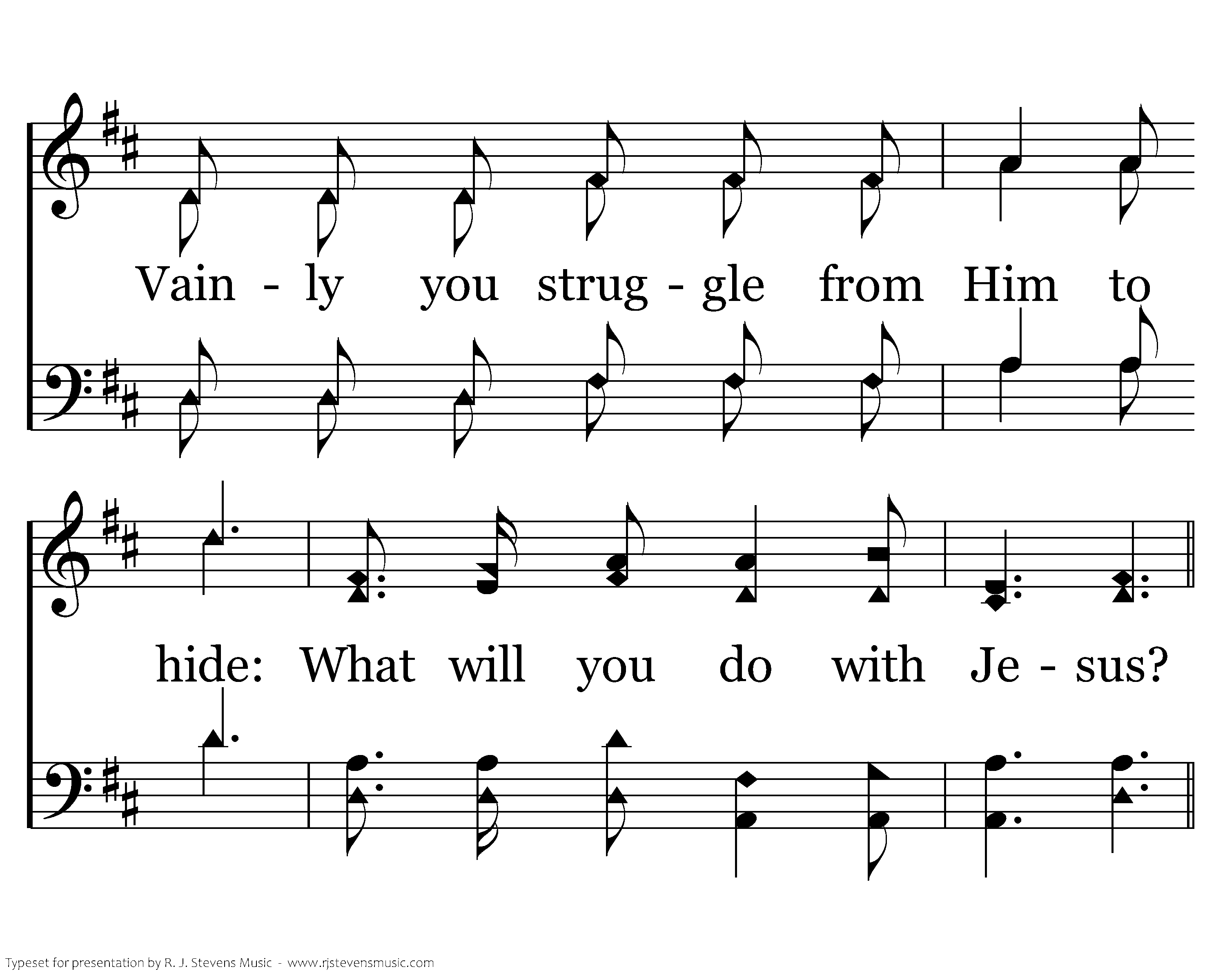 Will you evade Him as Pilate tried? Or will you choose Him, whate'er betide? Vainly you struggle from Him to hide: What will you do with Jesus?