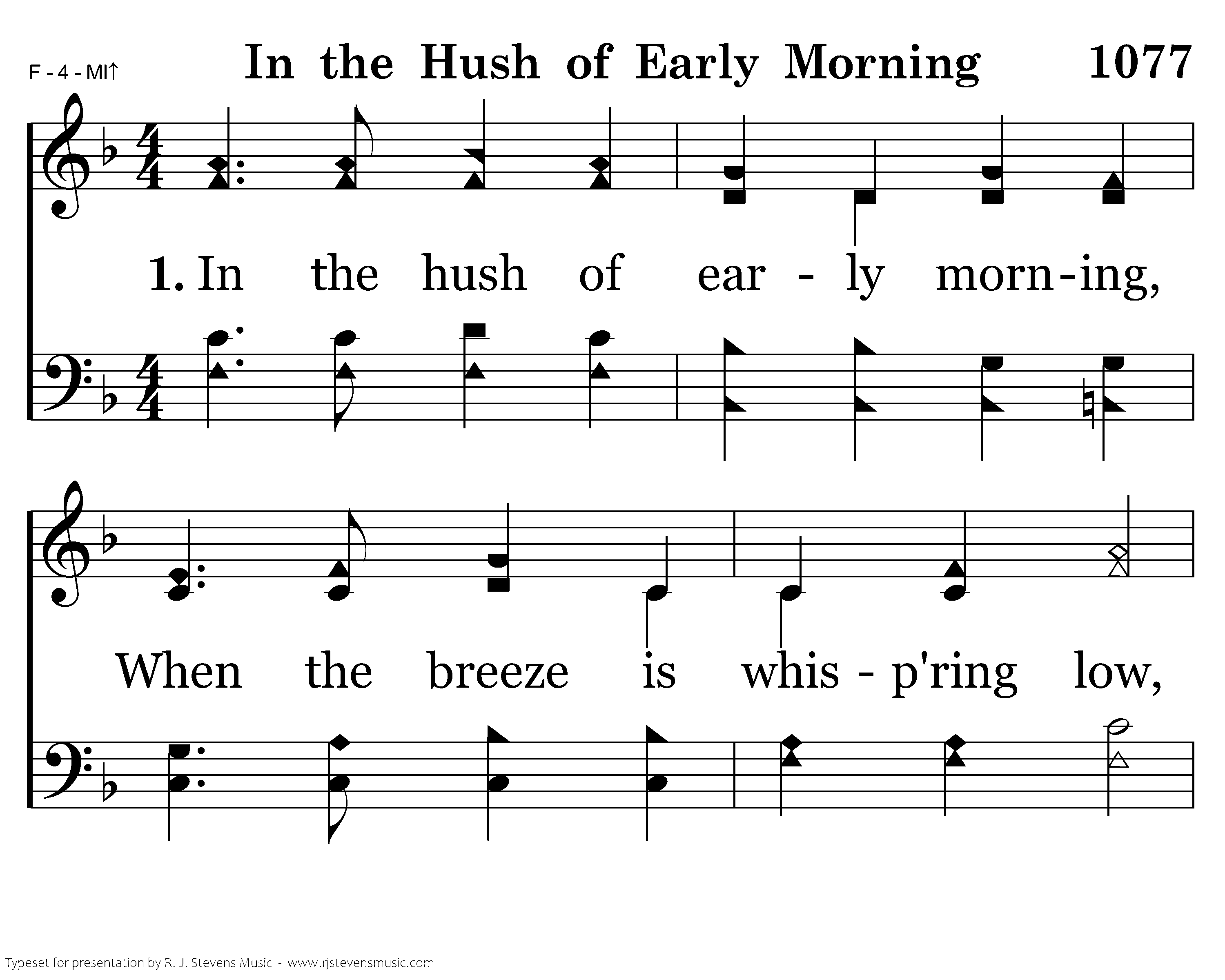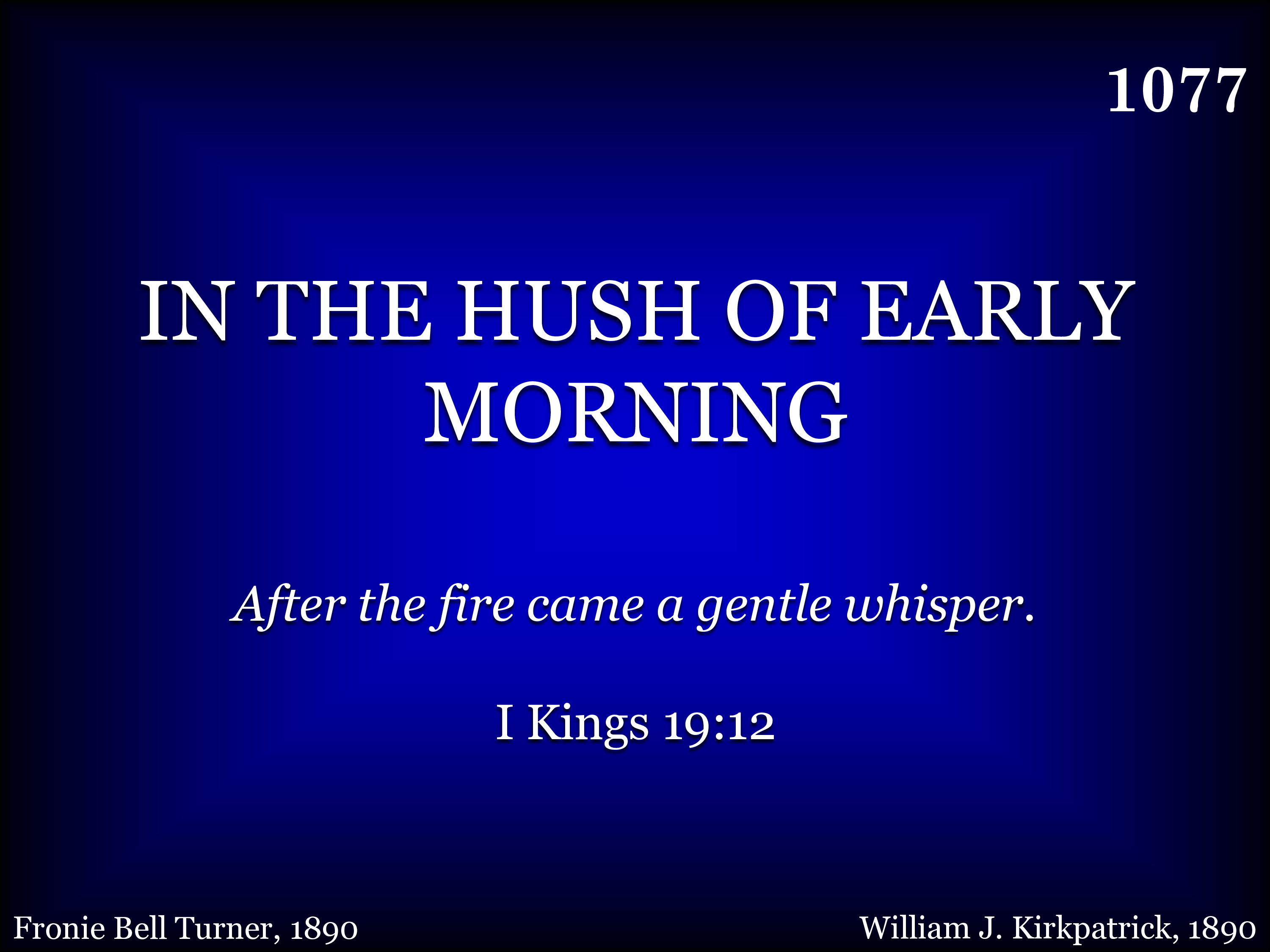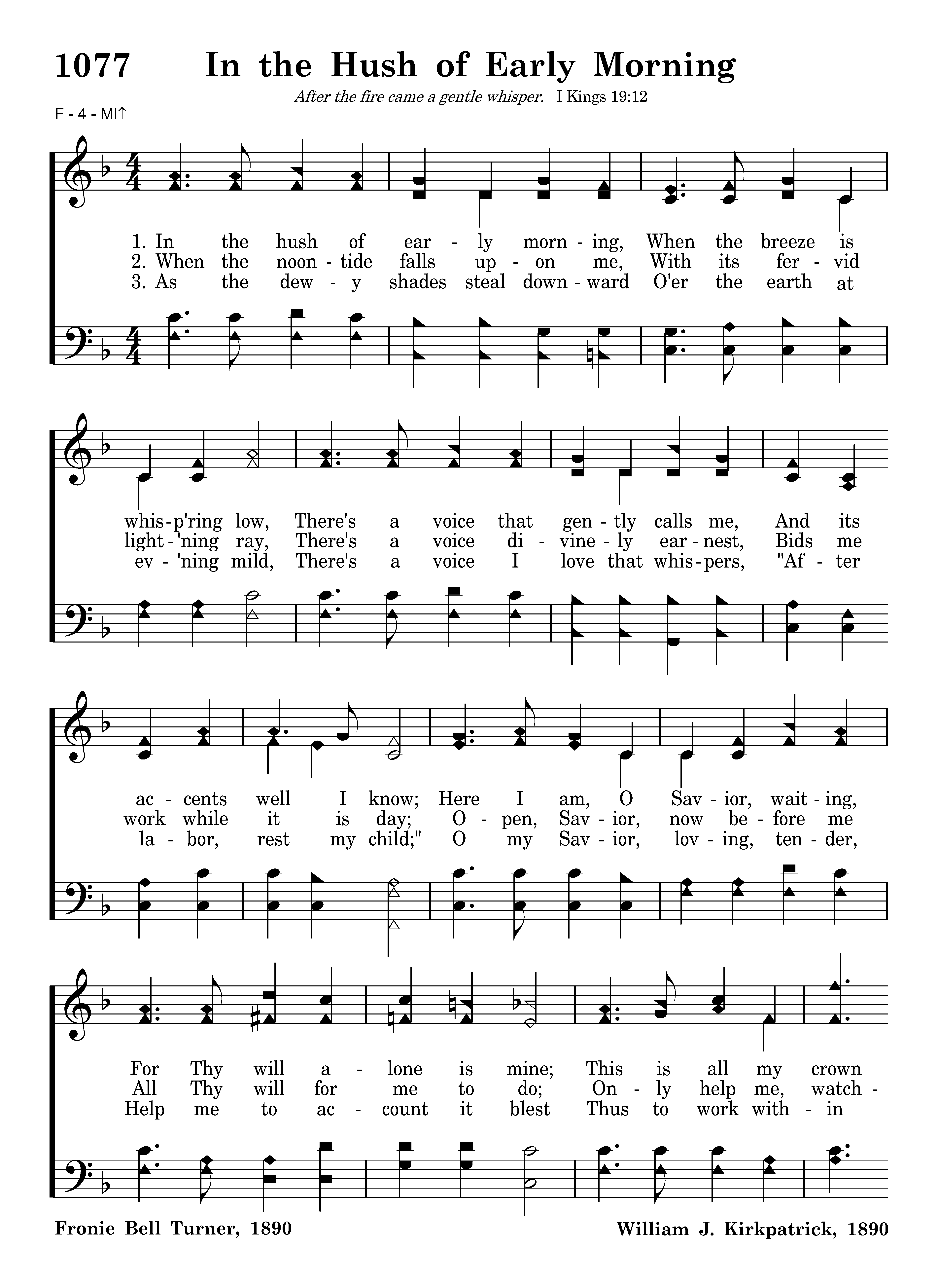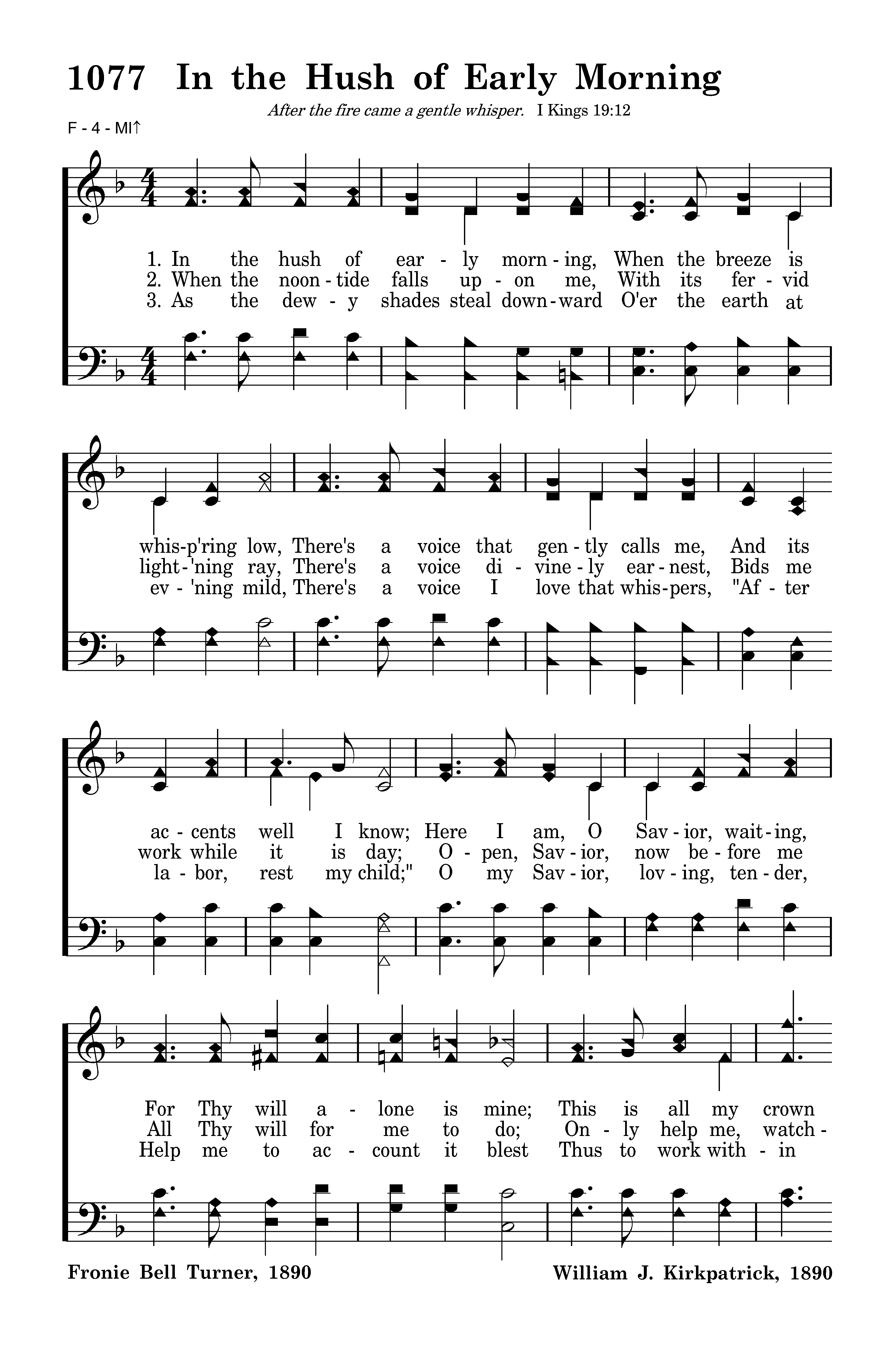 In the hush of early morning, When the breeze is whisp'ring low, There's a voice that gently calls me, And its accents well I know; Here I am, O Savior, waiting, For Thy will alone is mine; This is all my crown and glory: I am Thine, and only thine.