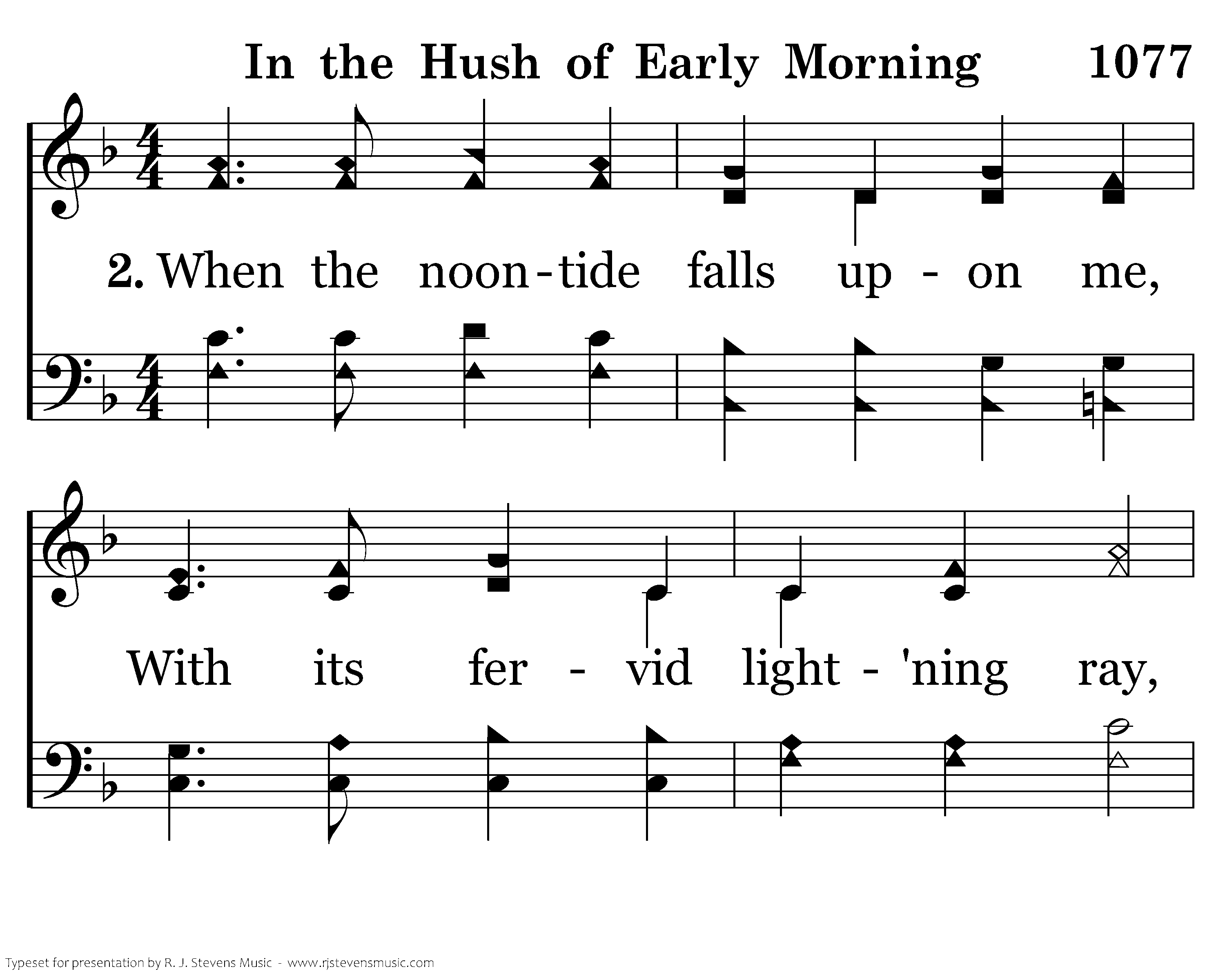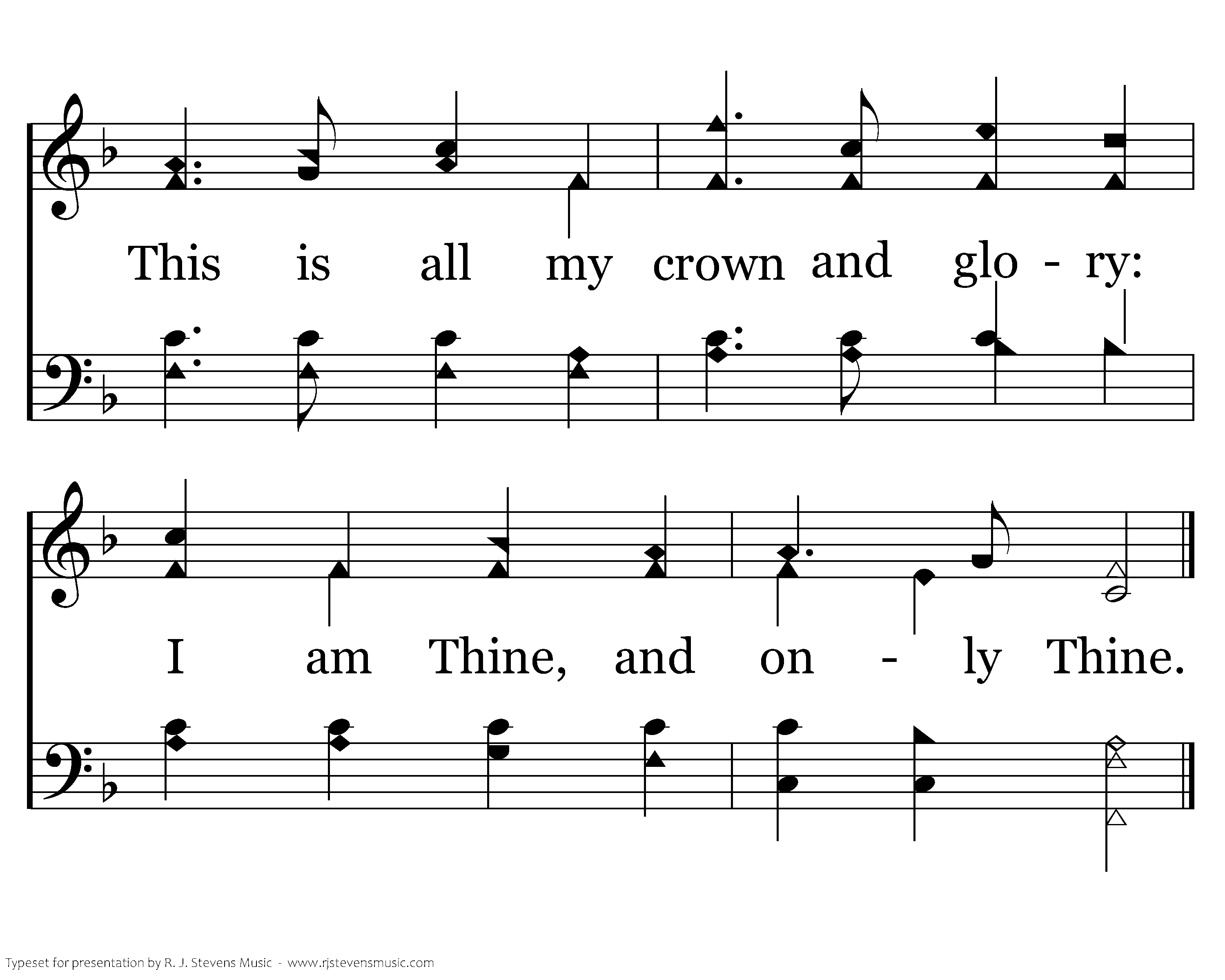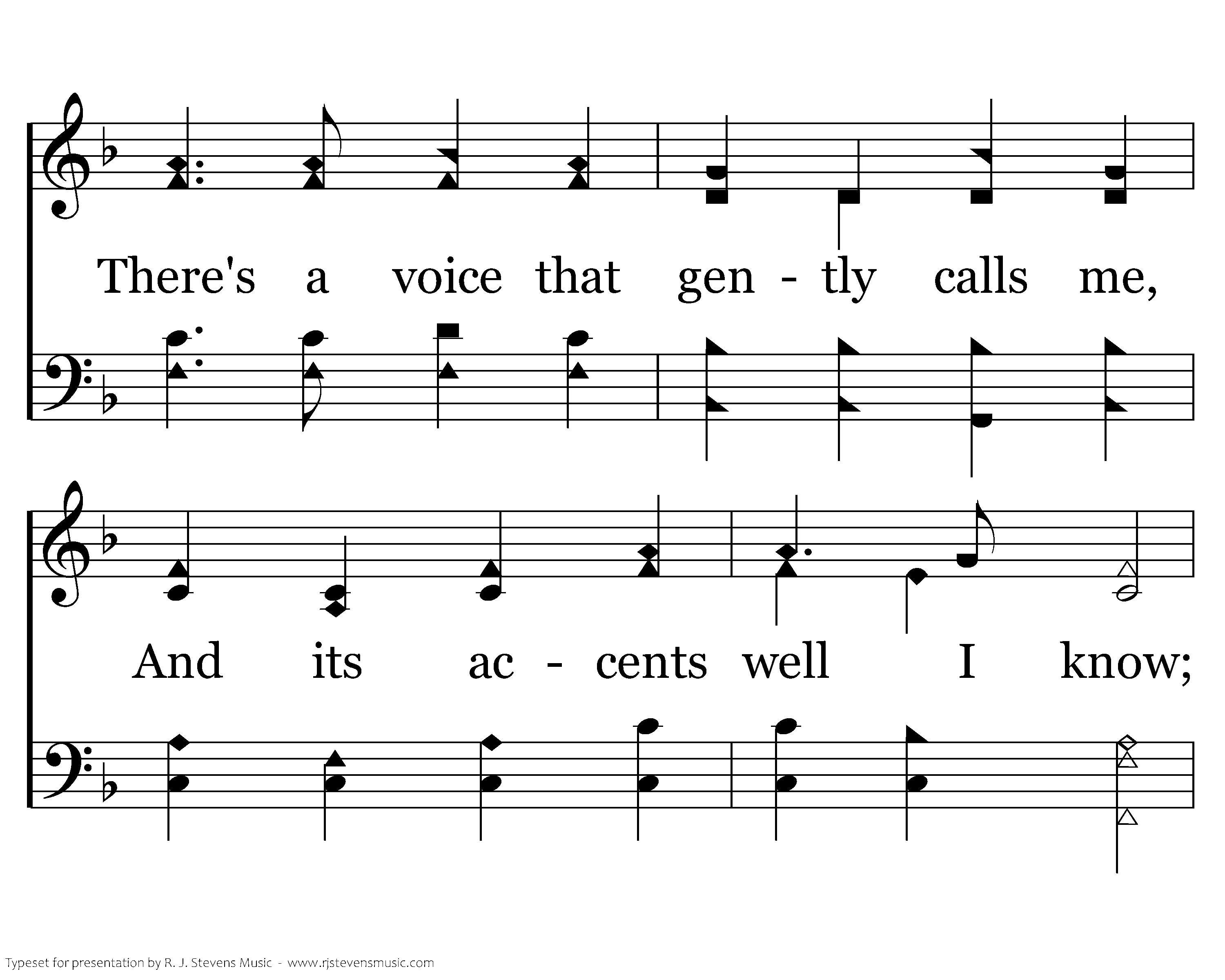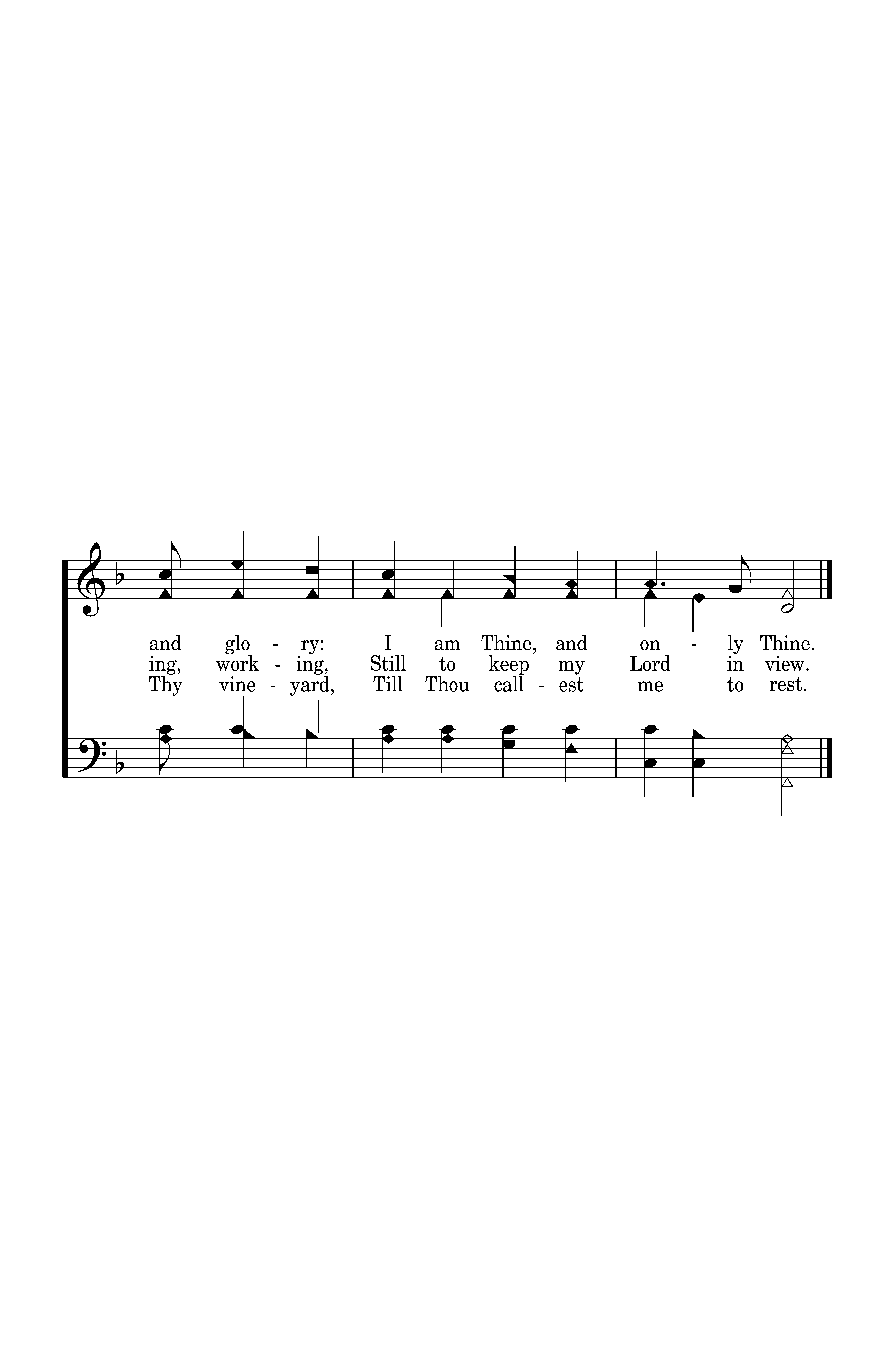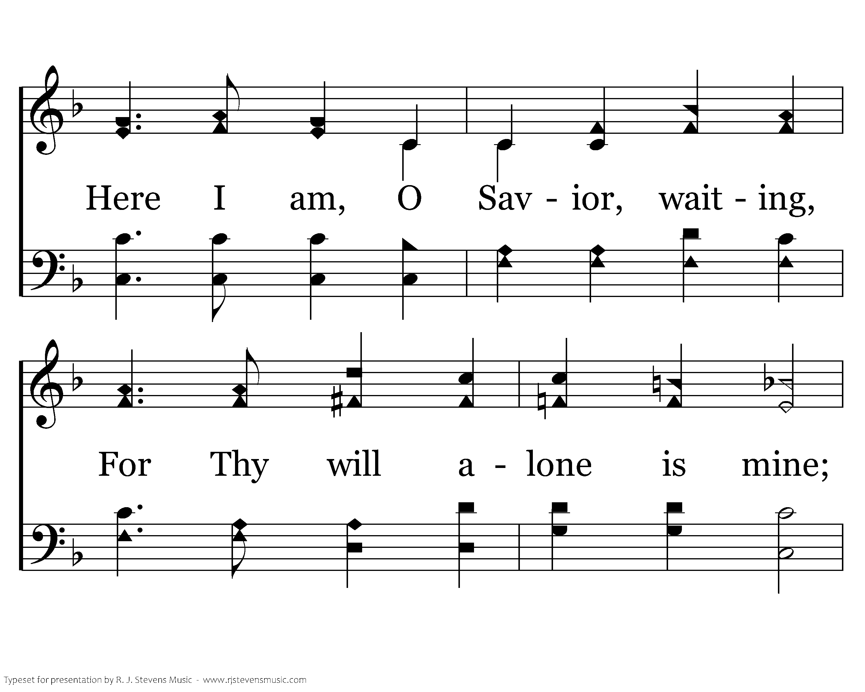 In the hush of early morning, When the breeze is whisp'ring low, There's a voice that gently calls me, And its accents well I know; Here I am, O Savior, waiting, For Thy will alone is mine; This is all my crown and glory: I am Thine, and only thine.